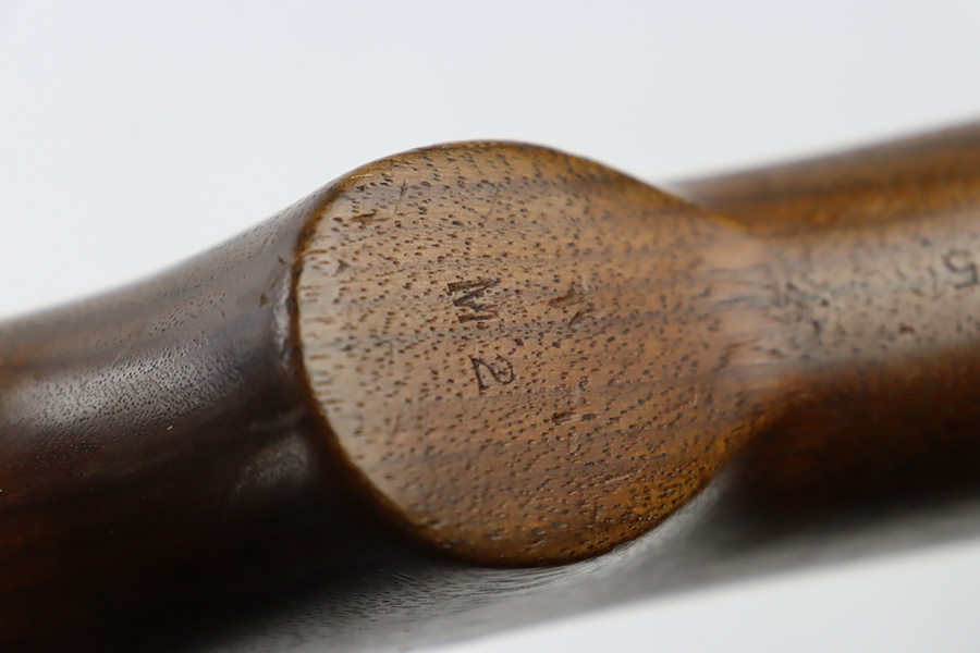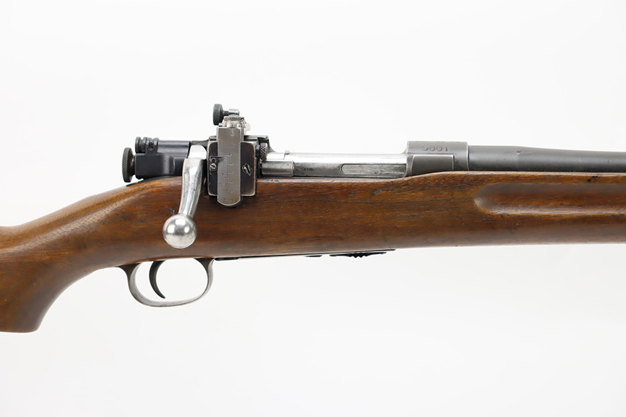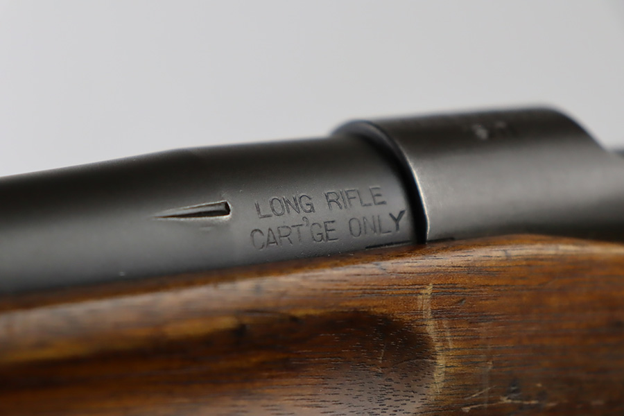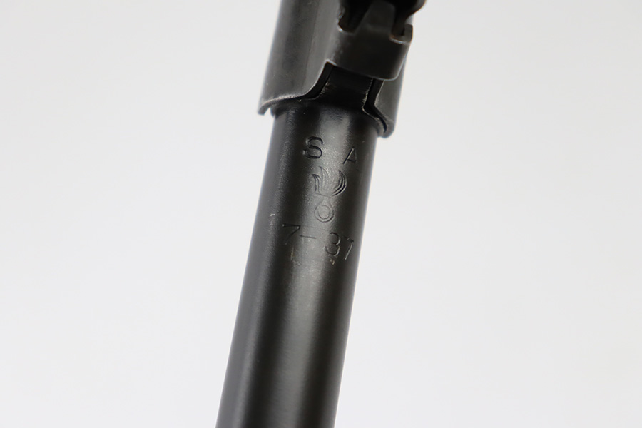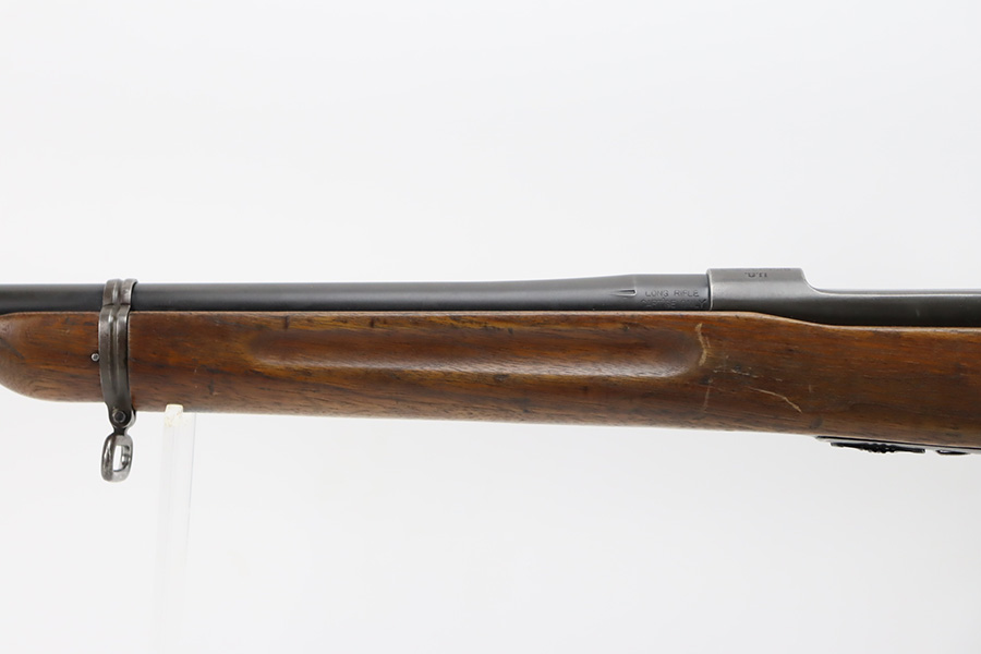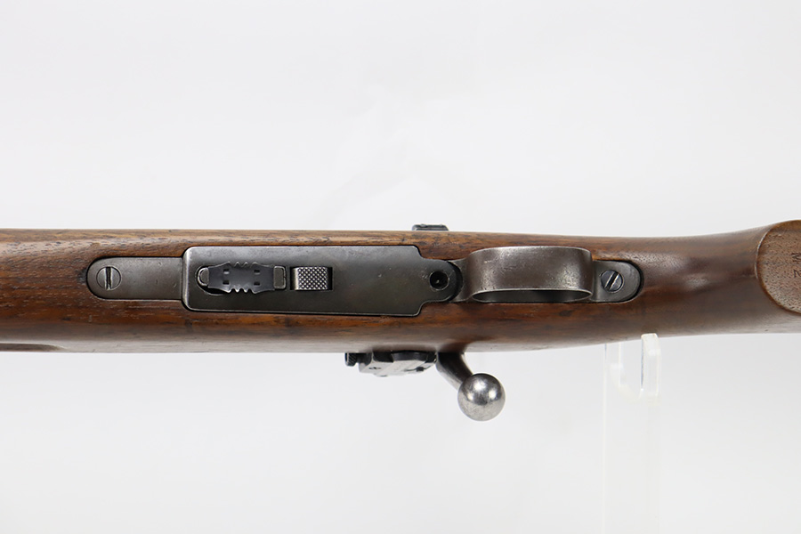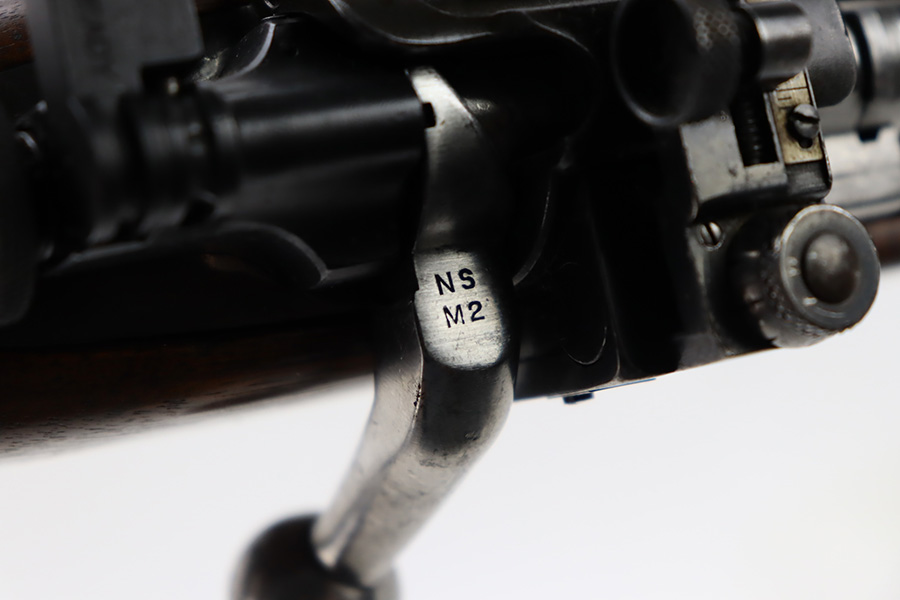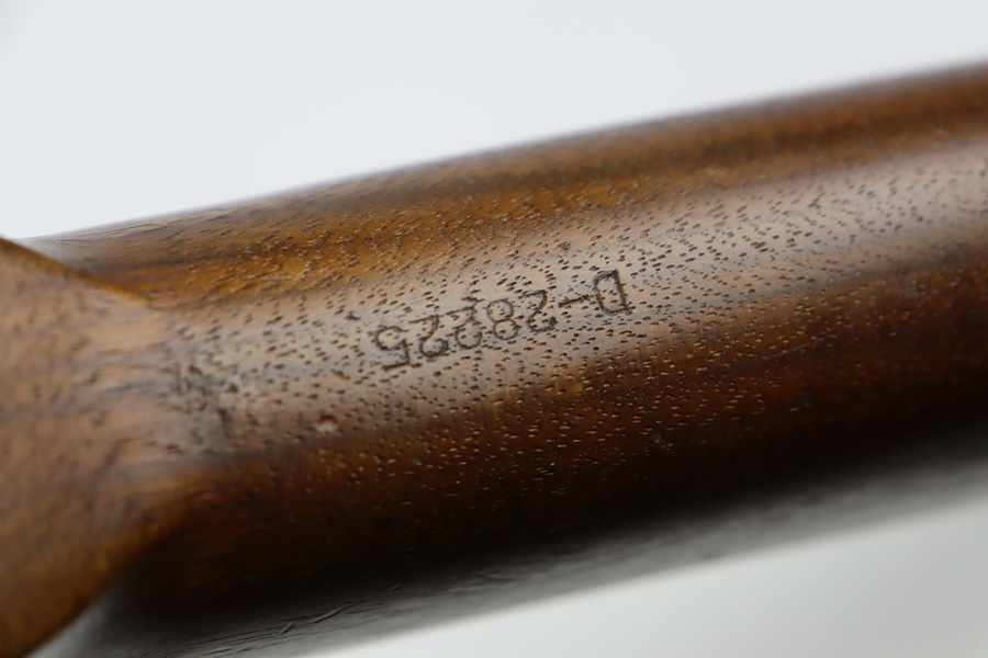 10/6/23 – This is a scarce Springfield Armory M2 rifle. The ‘M2’ designation with no ‘1922’ roll mark started in 1933, and this one has a parkerized finish with a barrel date of July of 1937. These were made to mimic the 1903 rifle for training purposes, and chambered in .22LR. The finish rates about 93% with general high edge wear and some thinning on the barrel band and floor plate/trigger group (some light brown patina in the same areas). There are dings and light scratches on the stock here and there. Comes with one magazine. Mint bore.