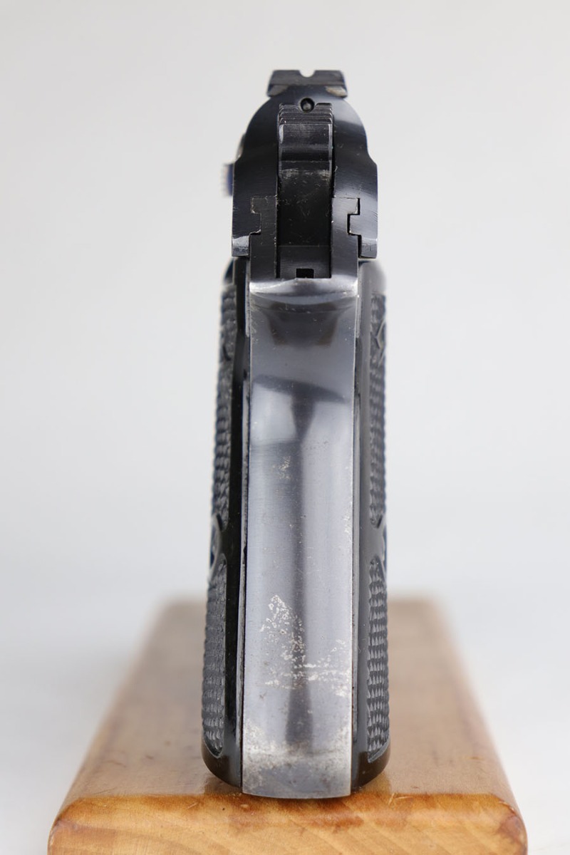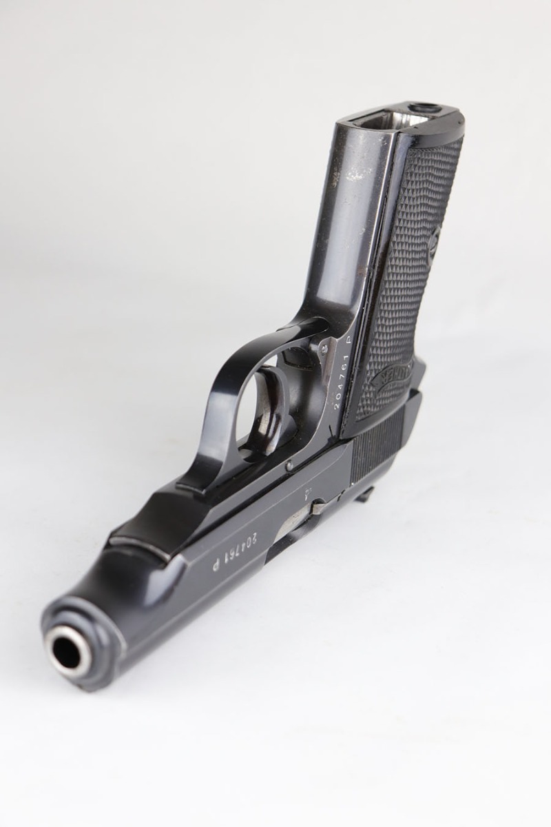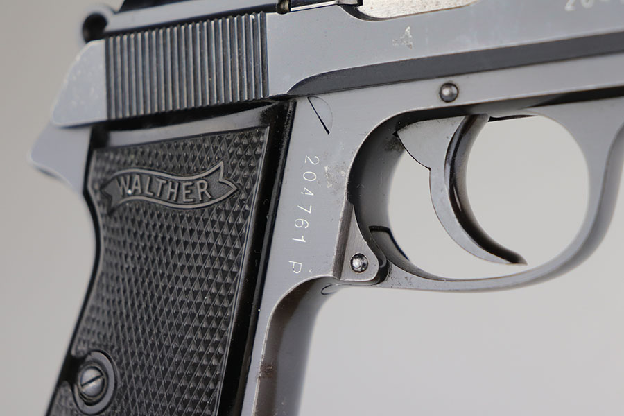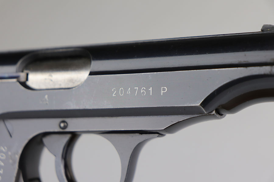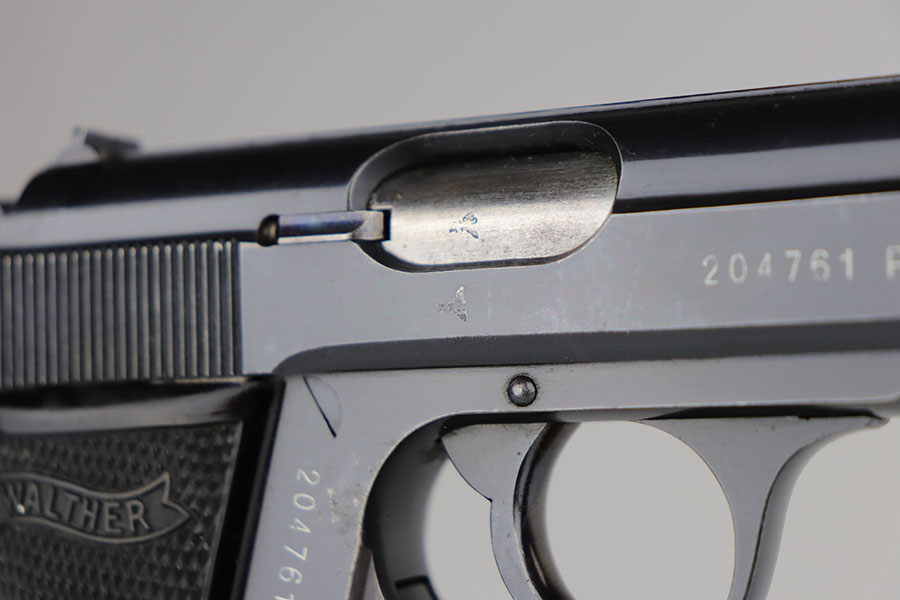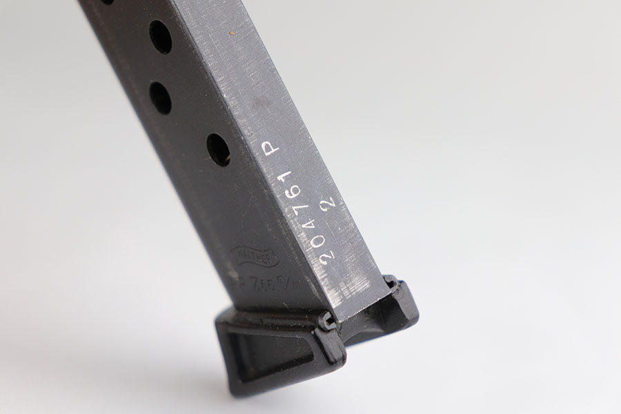 6/2/20 – This is a scarce SS contract Walther PP with one of the original, matching magazines. The original blue rates at about 92-93% with a very nice profile, and most of the finish loss on the straps. Original magazine is numbered on the spine and matching to the gun. This is a 4th variation SS contract PP. Bore is mint, and the grips and magazine are also in excellent condition.