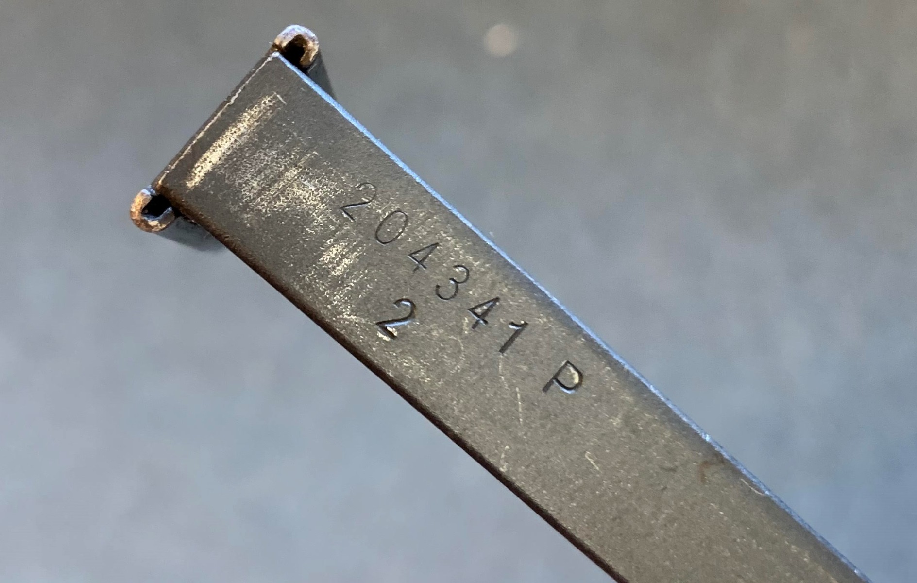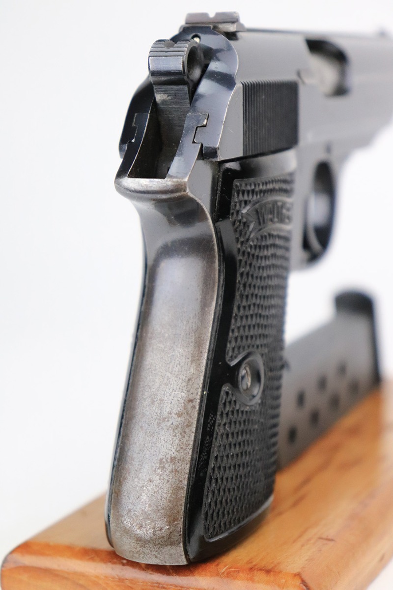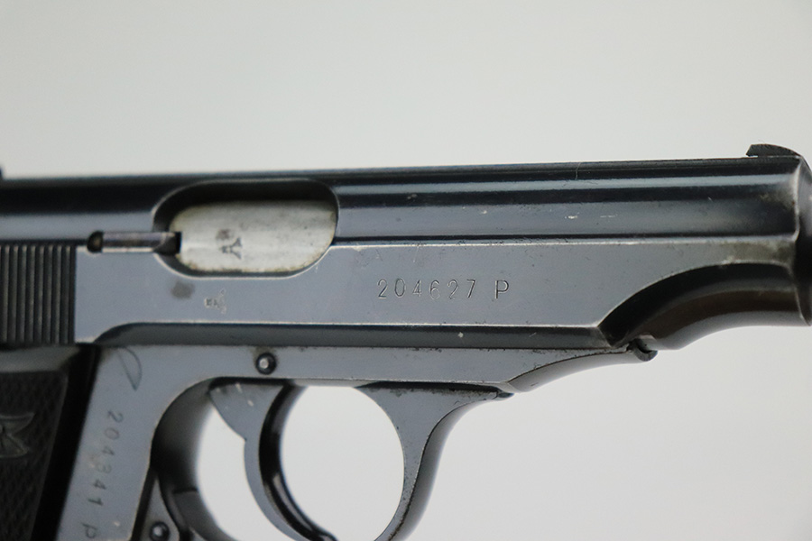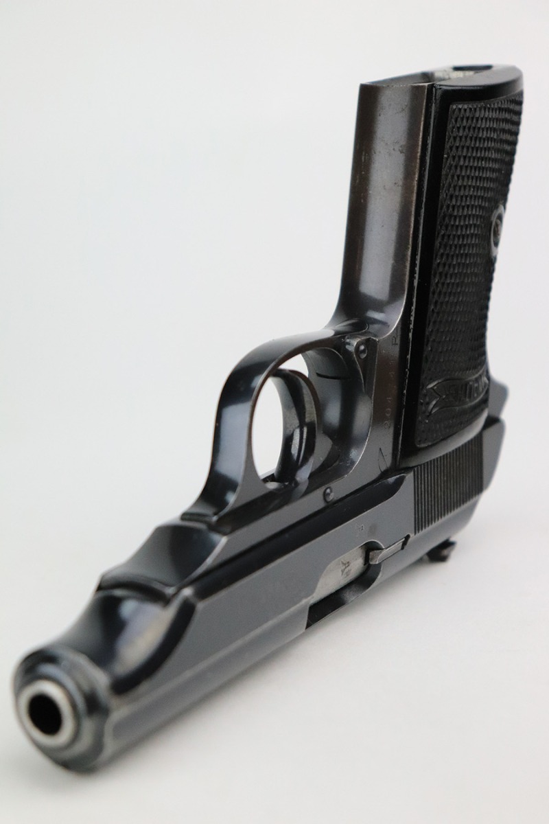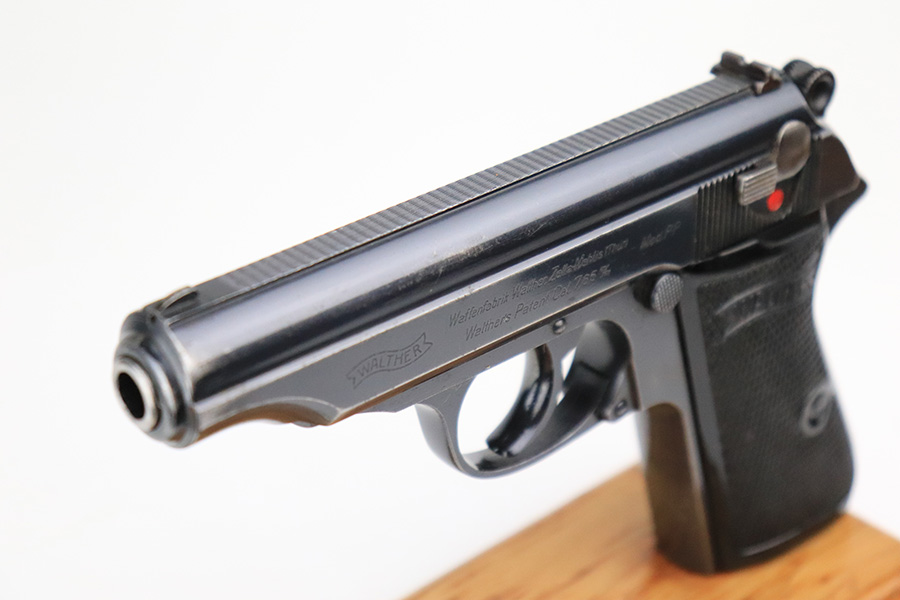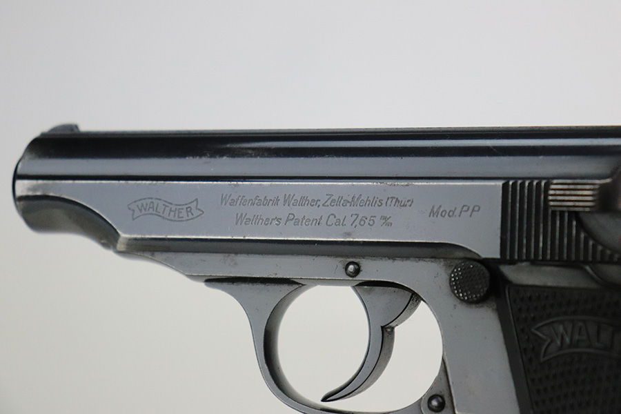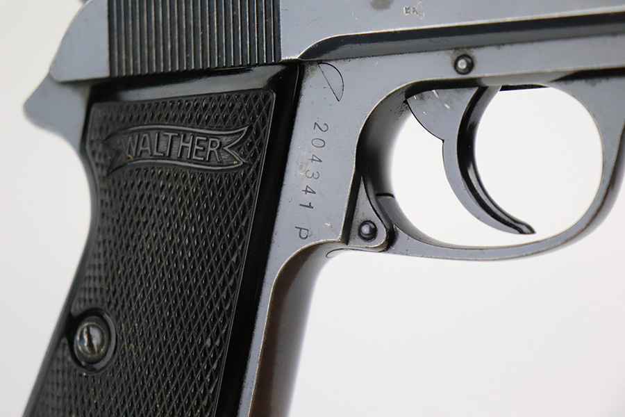 3/15/24 – This is a desirable SS contract Walther PP that still has one of its original, matching magazines. Made in late 1940 or early 1941, the pistol has matching frame and magazine, but the slide is off by about 300 digits. Were it a matching pistol, it would be priced much higher. The finish is original on all parts and the slide is in great shape aside from some standard muzzle wear. Frame shows considerable thinning on the straps, especially back strap, where there is also noticeable spotty oxidation. Bore is mint and grips are excellent.