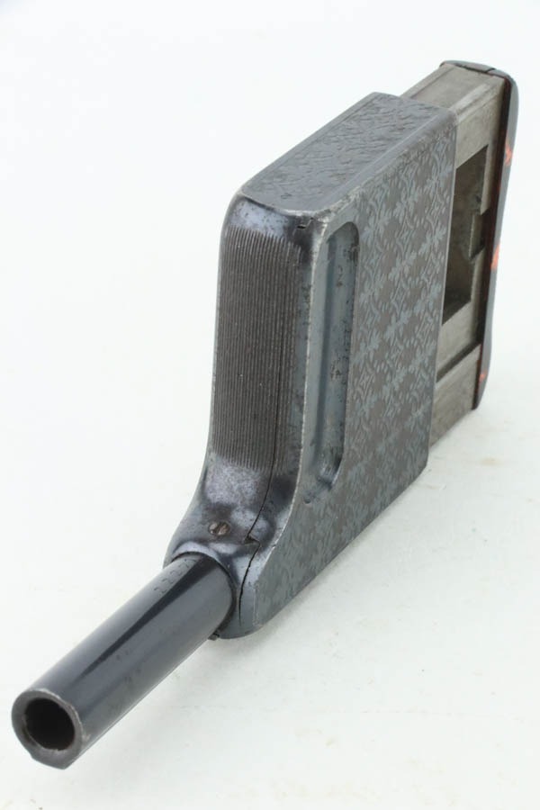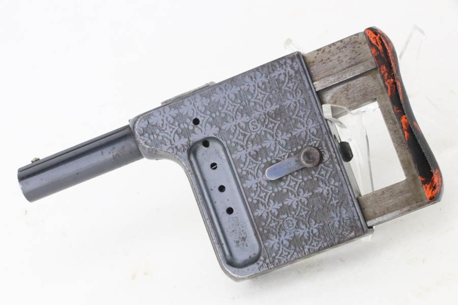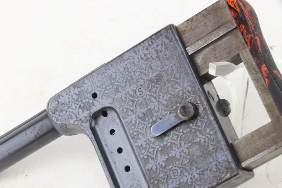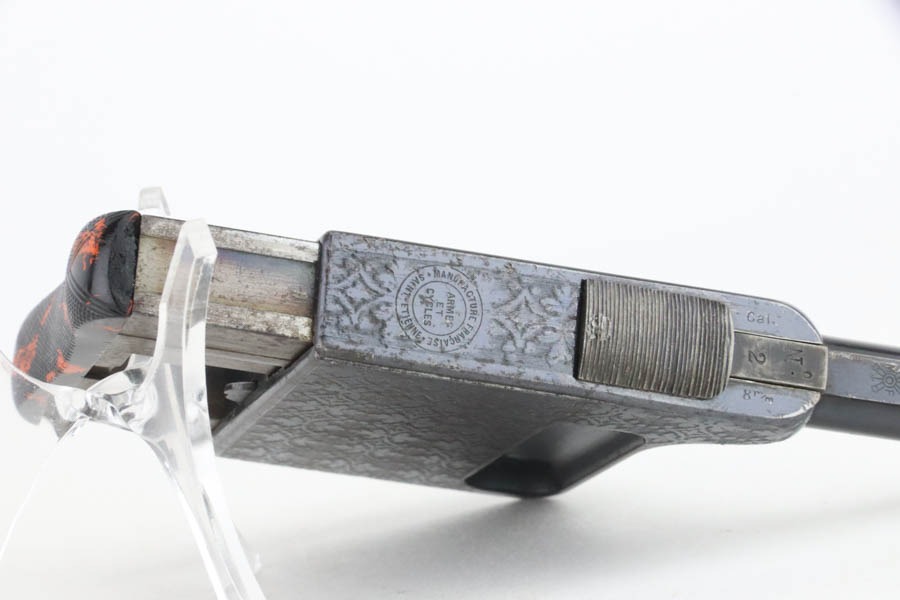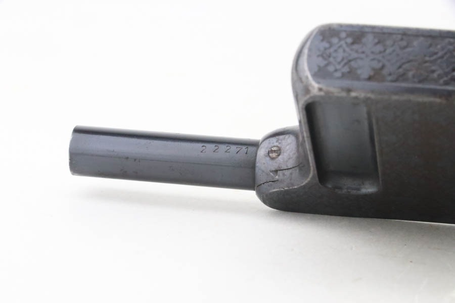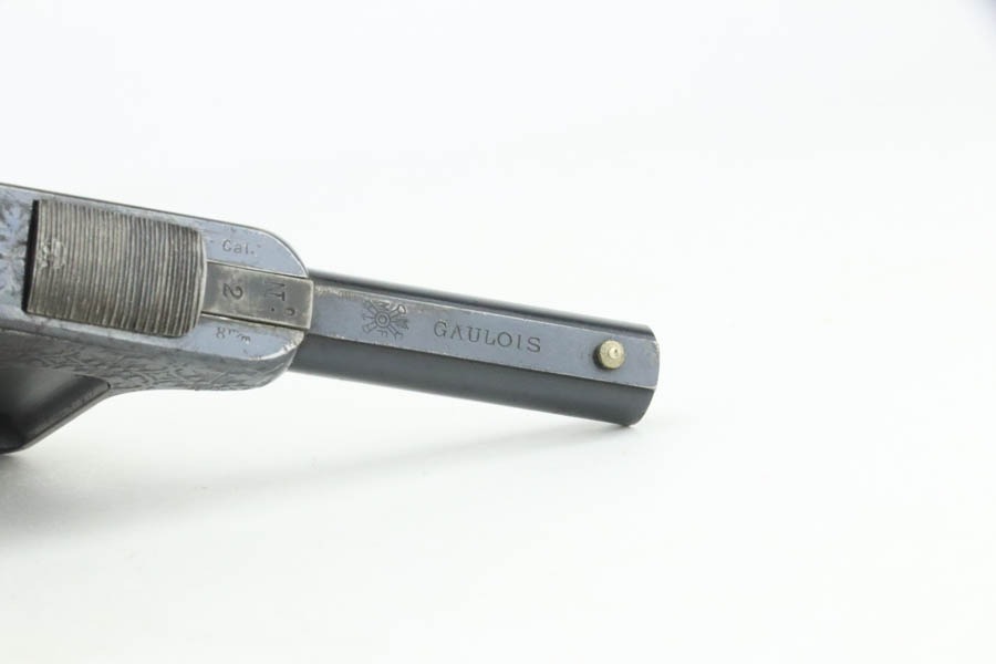 10/23/2024 – This is an example of a St. Etienne Gaulois No 2 Palm Pistol, manufactured from 1895 to 1912. It uses a tactile “squeeze fire” action with an internal magazine. Has a single bead sight on the barrel rib with a manufacturer mark on the rear of the frame at the top, “Cal. 8m/m” at the front, “No./2” on the dust cover, and the manufacture Francoise logo along with “GAULOIS” on the barrel. The left side of the action has a unique three-position “S/F/D” (safe/fire/unload) safety switch. It has retained roughly 90% of its original finish with some prickling visible on the barrel. The receiver is nicely engraved with wear towards the bottom and some spots of oxidation. The backlite palm grip is in great condition. The bore has significant spots of pitting visible.