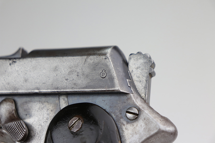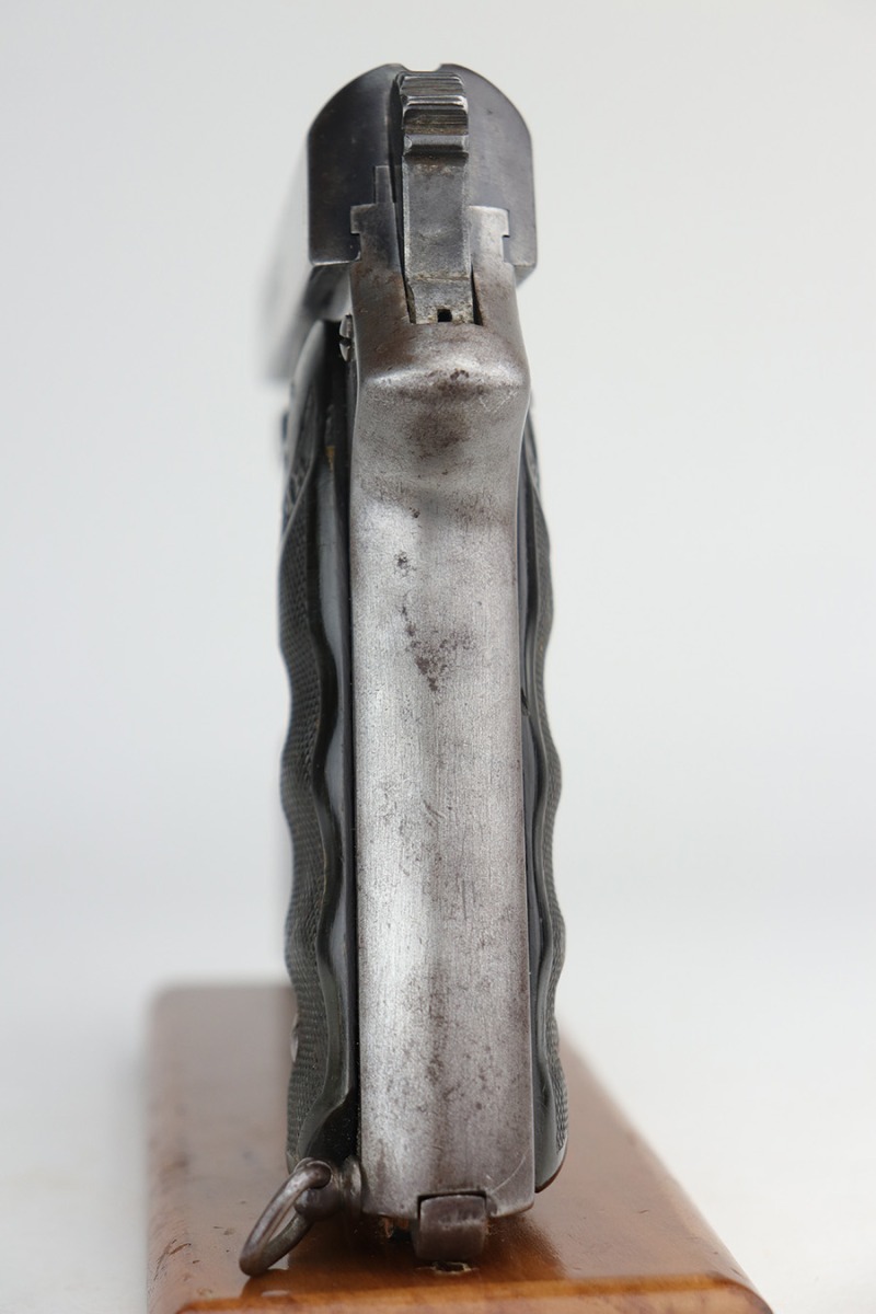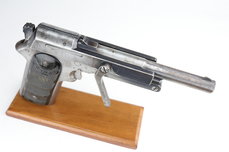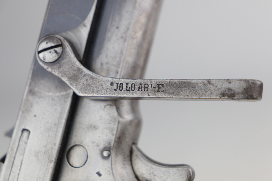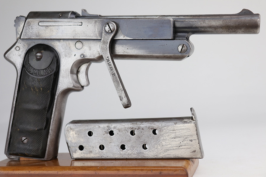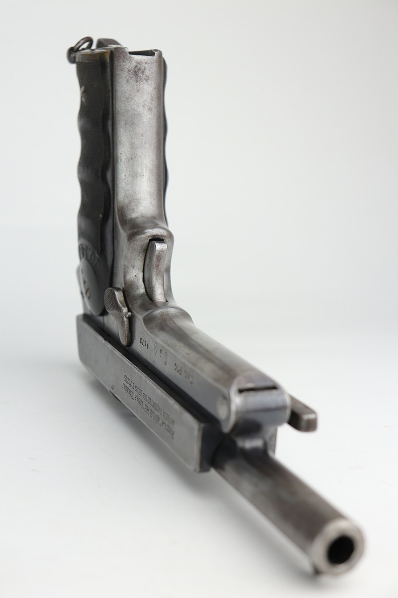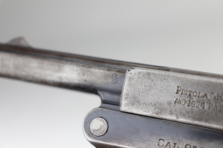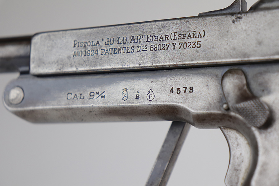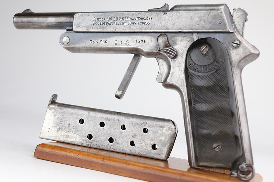 10/5/21 – Patented in 1920, the Jo. Lo. Ar. Pistol is an upgraded version of Arrizabalaga’s Sharp Shooter with two mechanical differences. First, is the installation of an extractor, and the second is the installation of a side lever, or palanca, as its inventor Jose de Lopez Arnaiz referred to it. Arnaiz, a Spanish gun dealer, sold Arrizabalaga on the idea of the folding lever, which would permit operation of the slide with the shooting hand. As the Sharp Shooter lacked any mechanical safety mechanisms, this upgrade was advertised as both a convenience and safety upgrade. The arrangement had Arrizabalaga producing the gun, and a company set up by Arnaiz building and installing the levers. Around 30,000 of these palanca-equipped firearms were sold in 9mm before Arnaiz broke off relations for unknown reasons. The main overseas purchaser was the Peruvian Mounted Police, who found the one-handed operation very functional on horseback. This particular example is original but finish is obviously worn throughout. It has the original hard rubber grips which are contoured. Terrific bore, seems like it would be a good shooter.