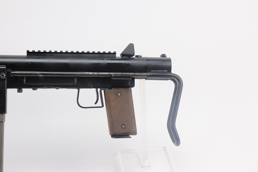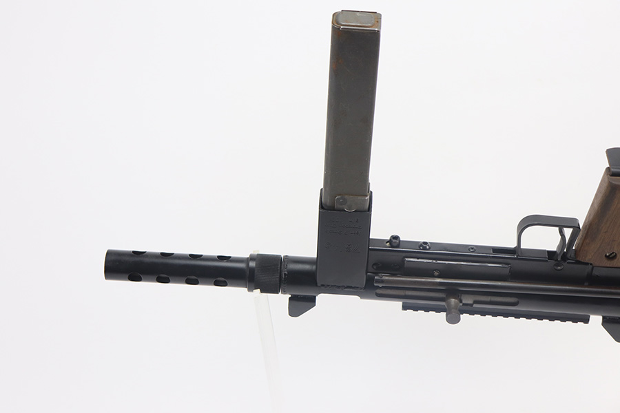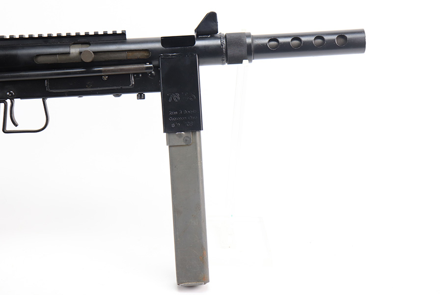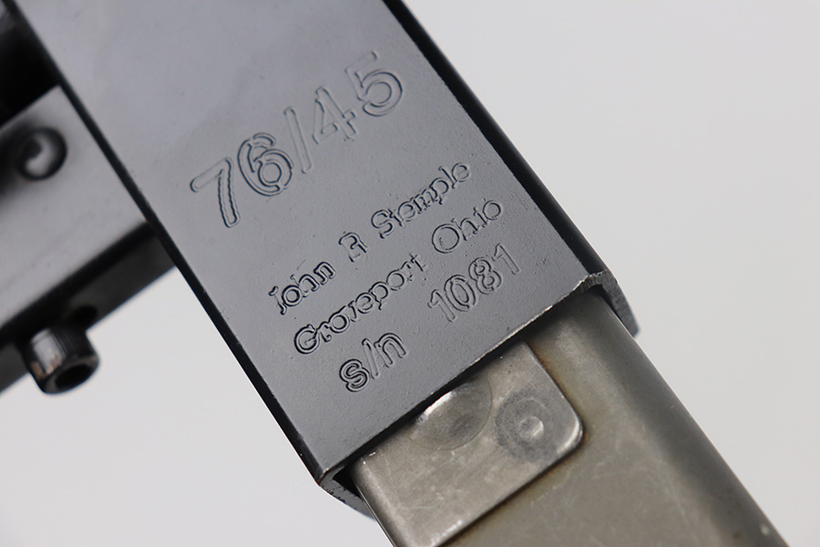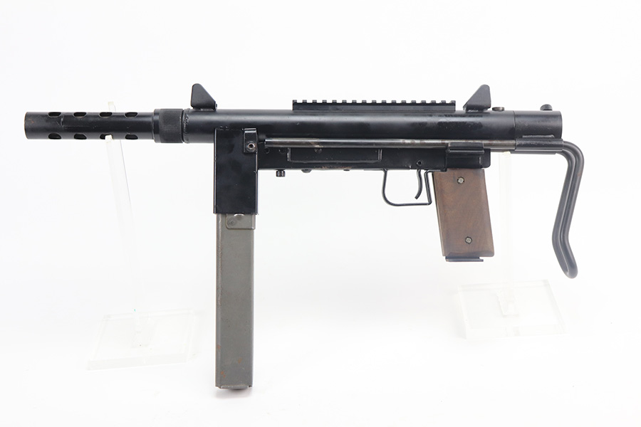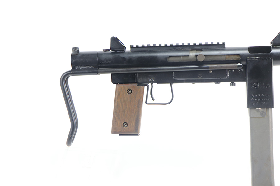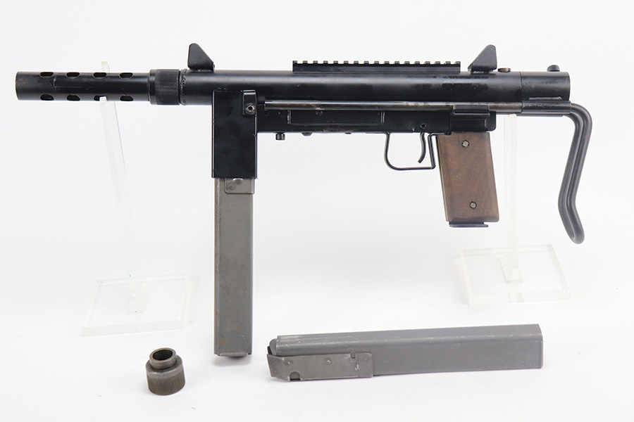 8/12/21 – This is a very close copy of the Smith & Wesson M76 submachine gun chambered in .45 ACP manufactured by John R. Stemple in Groveport, Ohio. Stemple guns were intended mostly for the private US market, and many (about half of the total of 2,000 made and registered prior to 1986 ban) were sold not as complete guns but rather as stripped receivers, so purchasers were able to build their own legal full-automatic guns according to their own tastes and budgets. Similar in design the British STEN and Swedish M-45 submachine guns. It is a blowback operated SMG with a round sheet metal tube receiver, machined bolt, fixed firing pin, and the barrel held in place via a perforated barrel jacket/barrel nut. This design is very convenient as the barrel jacket can be unscrewed so that you can quickly replace the barrel or even change it to another caliber. The magazine housing is marked “M76/45 JOHN R. STEMPLE/GROVEPORT OH./SN1081”. Fixed front and rear sights, with a rubber covered folding wire frame type stock. It only has a notch/cutout on the right side of the receiver tube that acts as a safety to hold back the bolt handle. Includes two phoshpated stick mags. Excellent finish throughout. Strong, shiny bore. Fully transferable.