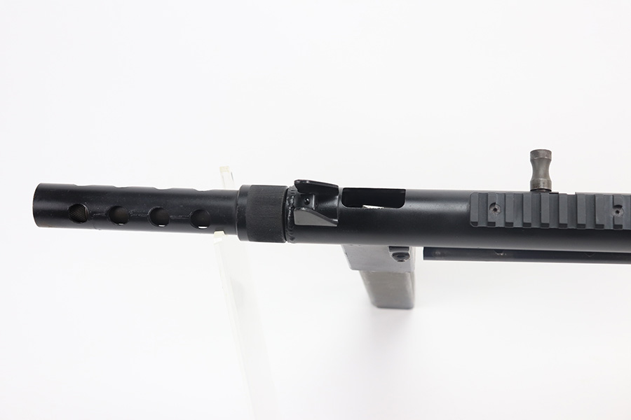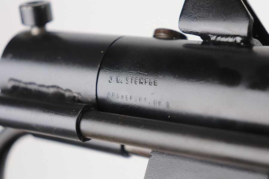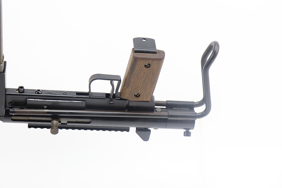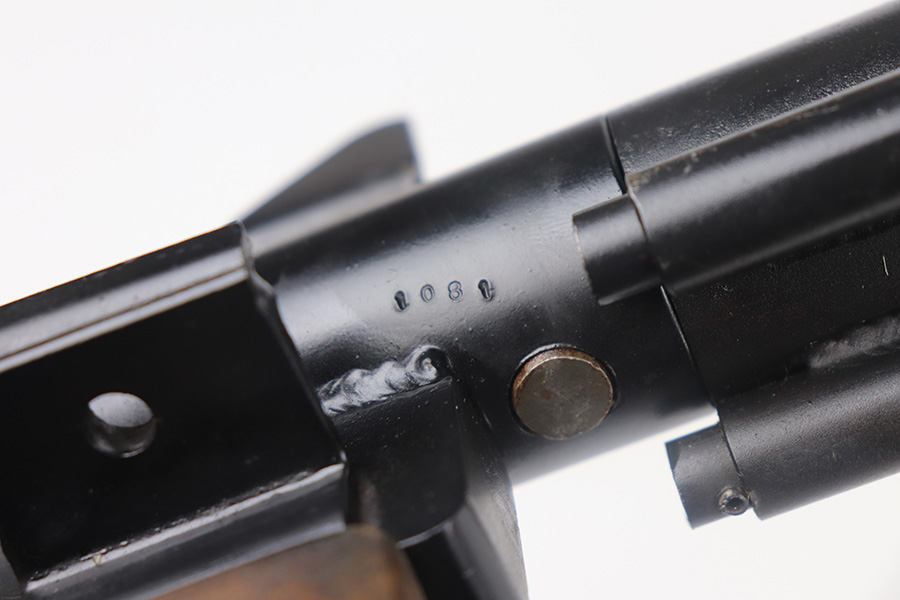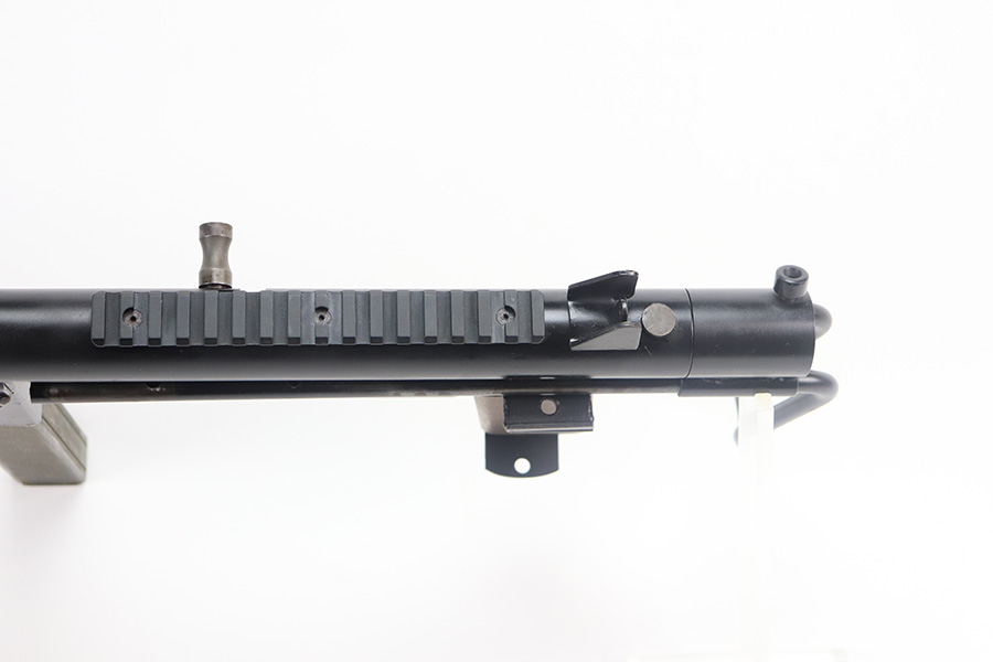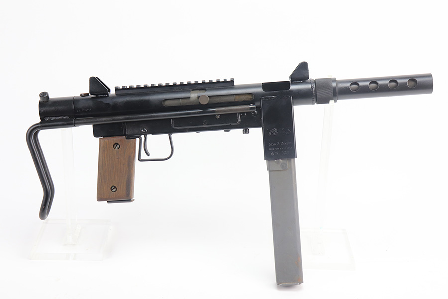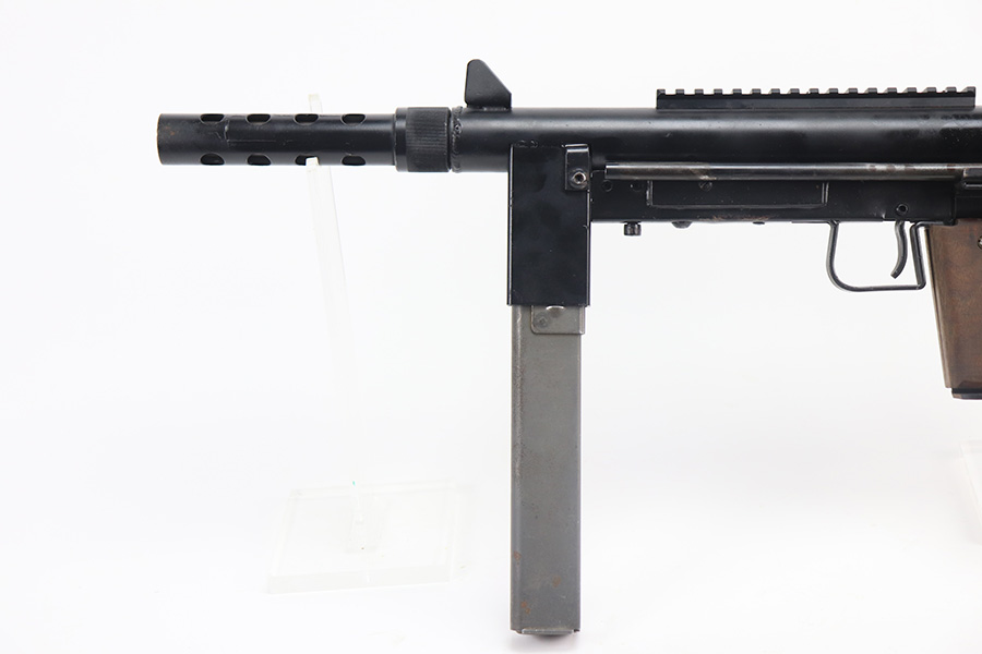 8/12/21 – This is a very close copy of the Smith & Wesson M76 submachine gun chambered in .45 ACP manufactured by John R. Stemple in Groveport, Ohio. Stemple guns were intended mostly for the private US market, and many (about half of the total of 2,000 made and registered prior to 1986 ban) were sold not as complete guns but rather as stripped receivers, so purchasers were able to build their own legal full-automatic guns according to their own tastes and budgets. Similar in design the British STEN and Swedish M-45 submachine guns. It is a blowback operated SMG with a round sheet metal tube receiver, machined bolt, fixed firing pin, and the barrel held in place via a perforated barrel jacket/barrel nut. This design is very convenient as the barrel jacket can be unscrewed so that you can quickly replace the barrel or even change it to another caliber. The magazine housing is marked “M76/45 JOHN R. STEMPLE/GROVEPORT OH./SN1081”. Fixed front and rear sights, with a rubber covered folding wire frame type stock. It only has a notch/cutout on the right side of the receiver tube that acts as a safety to hold back the bolt handle. Includes two phoshpated stick mags. Excellent finish throughout. Strong, shiny bore. Fully transferable.