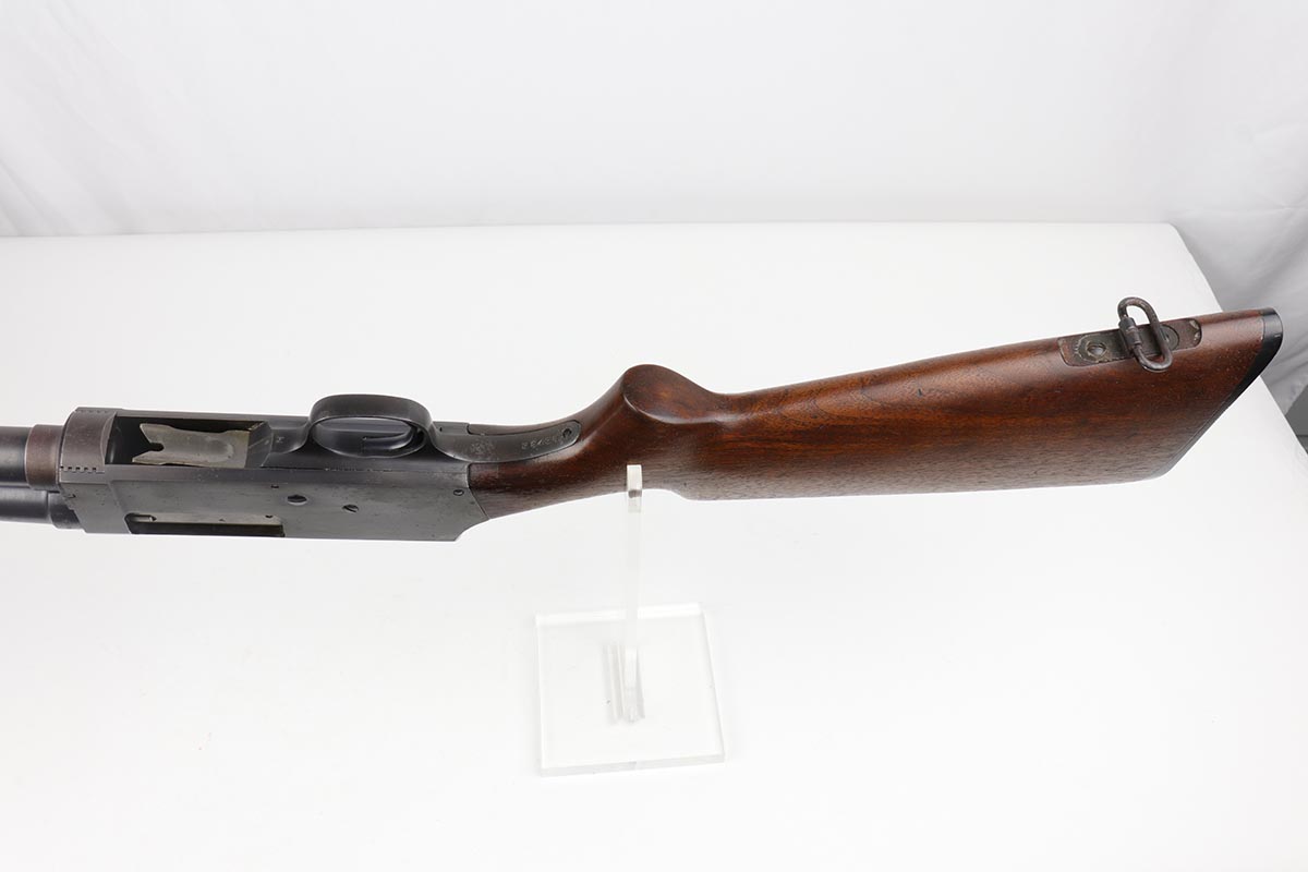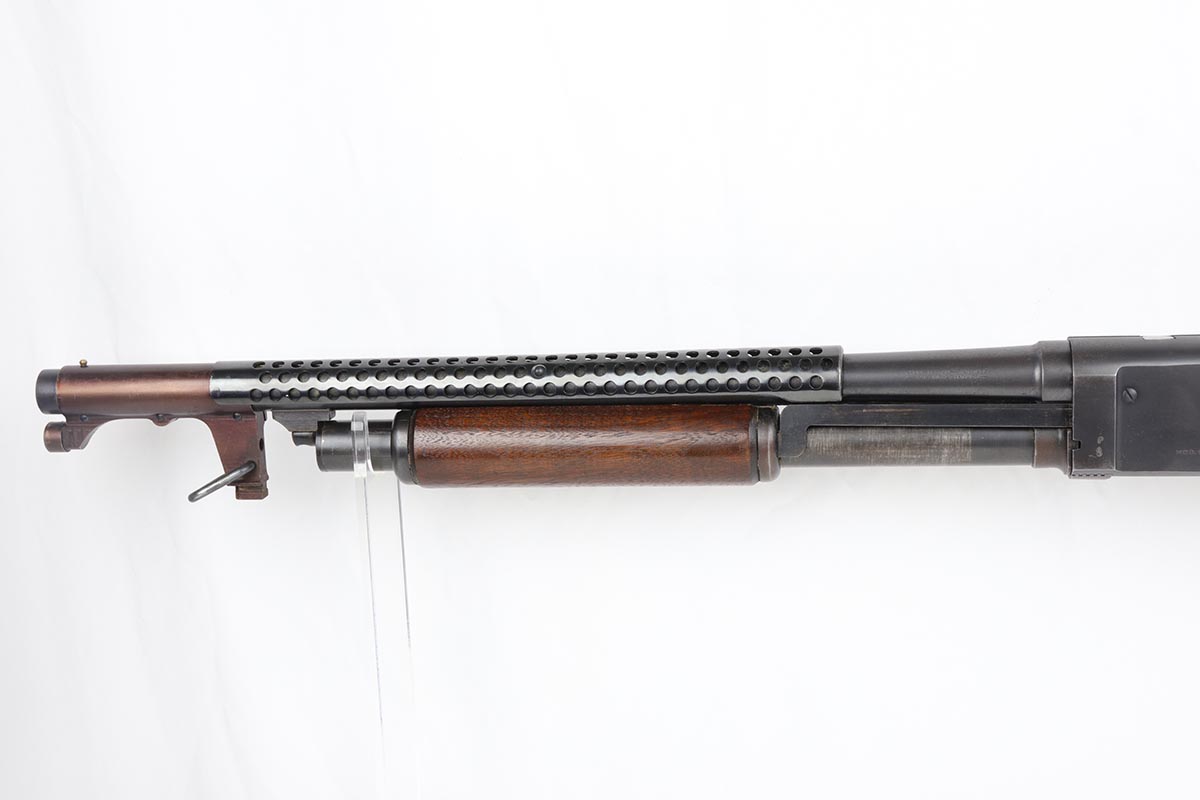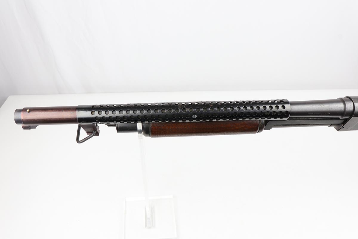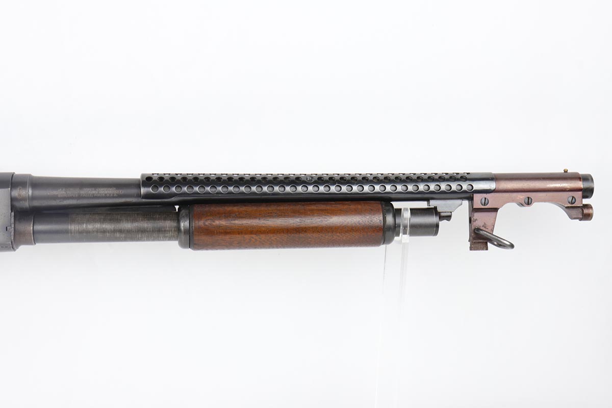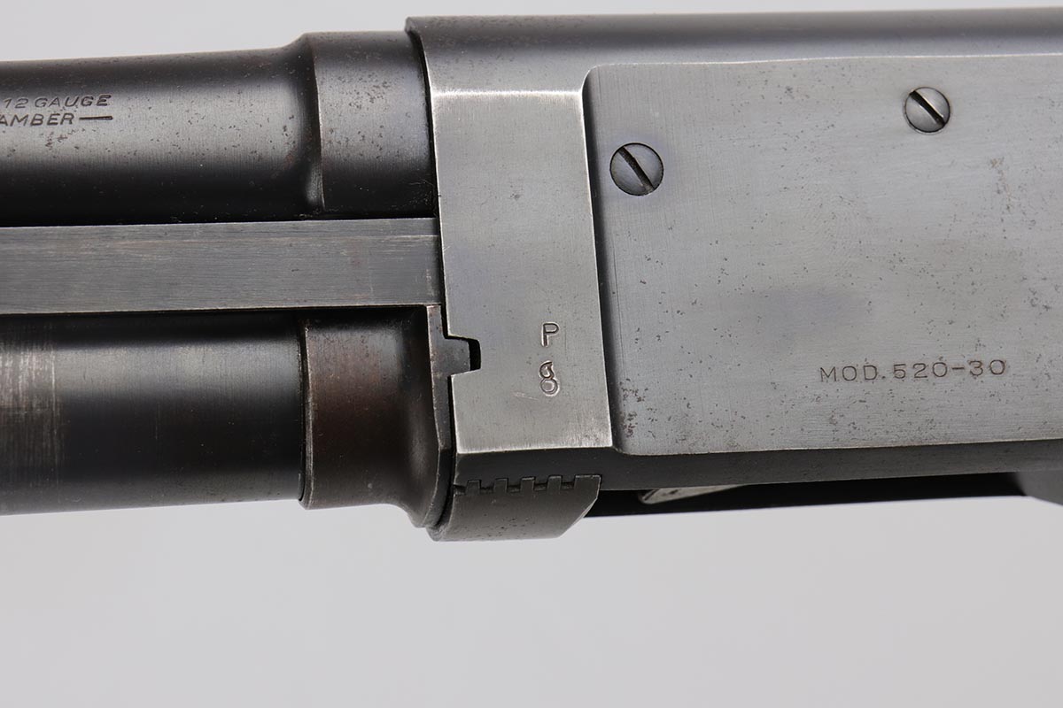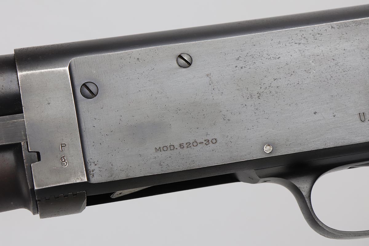 11/8/19 -This is an excellent example of a WWII production of Stevens 520-30 Trench shotgun, that retains around 90-95% of its original dull “brushed blue” finish. There isn’t much actual bluing loss on the gun, but the receiver does have some minor oxidation and pinpricking in a few areas. All correct and original parts. High-polished 6-row heat shield and an unmarked plum color bayonet lug. The wood on the gun is in fantastic condition with no notable defects. There were ~33,000 Stevens 520-30s produced for the war, with a mix of trench guns, riot guns and long-barreled training guns among those 33,000. Smooth action and a mint bore.