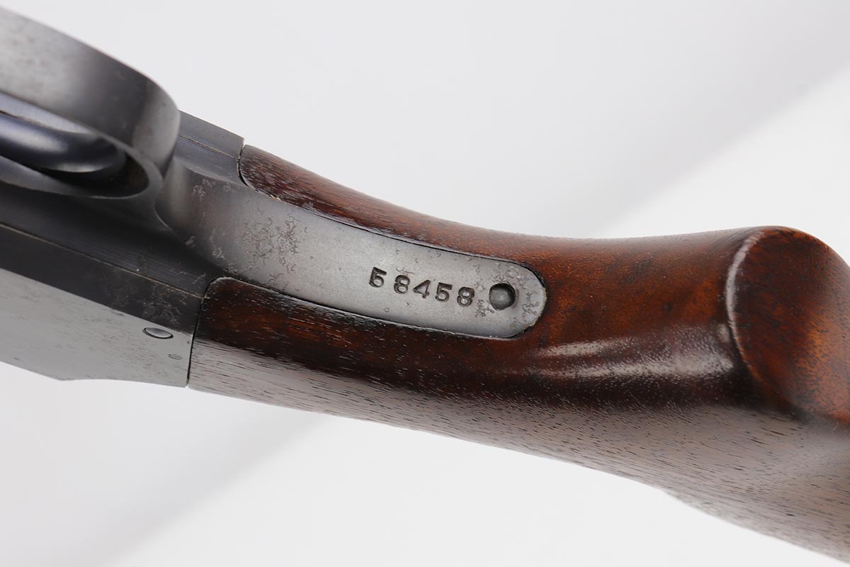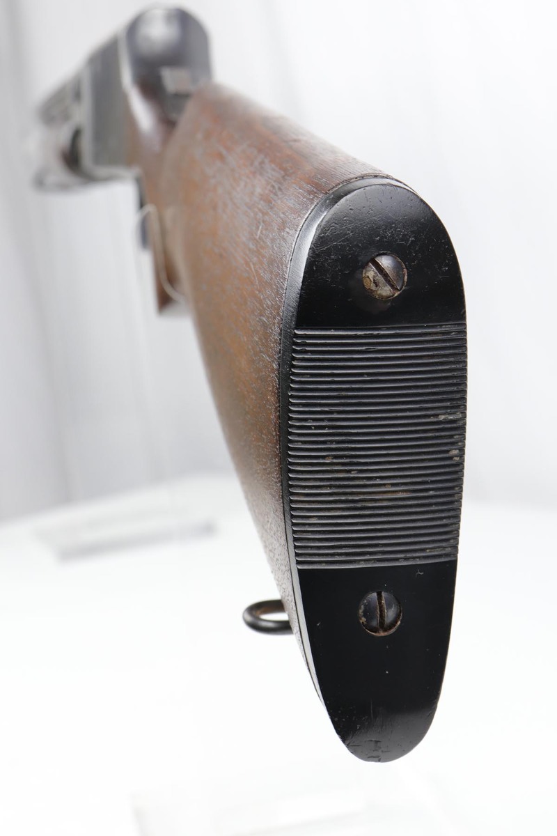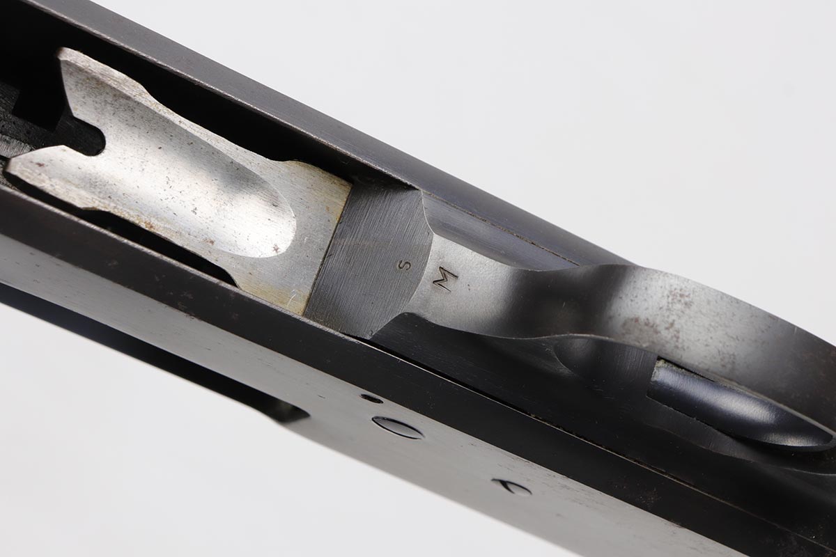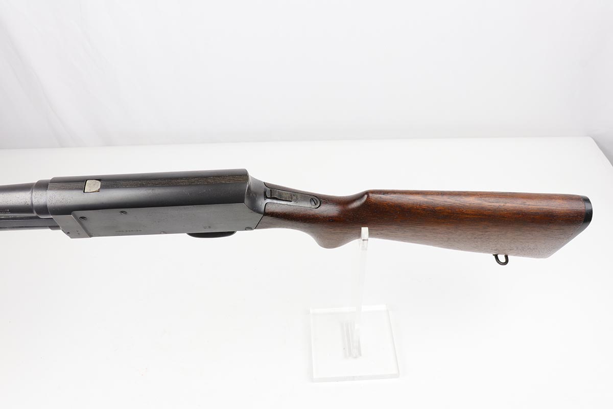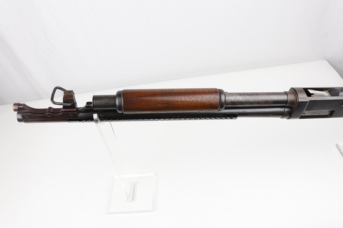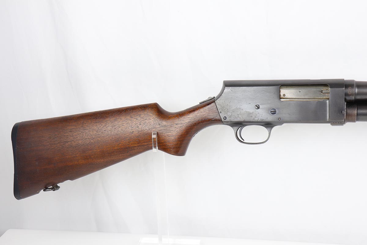 11/8/19 -This is an excellent example of a WWII production of Stevens 520-30 Trench shotgun, that retains around 90-95% of its original dull “brushed blue” finish. There isn’t much actual bluing loss on the gun, but the receiver does have some minor oxidation and pinpricking in a few areas. All correct and original parts. High-polished 6-row heat shield and an unmarked plum color bayonet lug. The wood on the gun is in fantastic condition with no notable defects. There were ~33,000 Stevens 520-30s produced for the war, with a mix of trench guns, riot guns and long-barreled training guns among those 33,000. Smooth action and a mint bore.