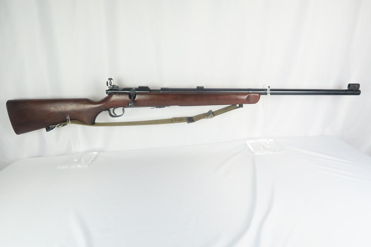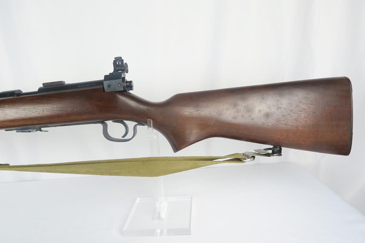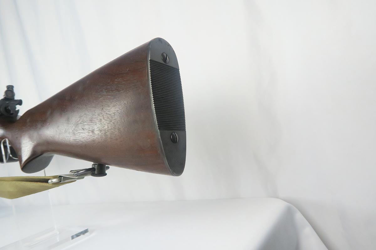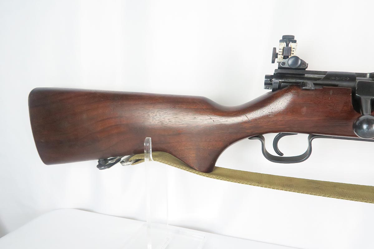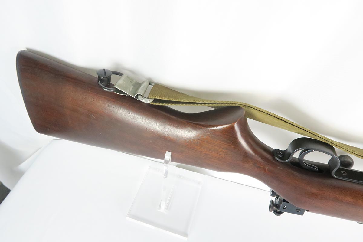1/3/18 – This is a World War II era Stevens model 416 training rifle. This gun was part of a 10,000 rifle contract that the United States military ordered for use in basic firearms training. It is marked U.S. PROPERTY and also shows the flaming bomb on the receiver. It has the original sights, which is rare because most owners had the sights upgraded. The stock is in very good condition with a few minor dings and scratches, but no chips or cracks. The receiver and metal condition is excellent, with very little finish loss and only minor spotting on the muzzle. Comes with an original sling. Minty bore.