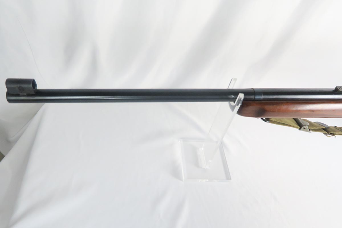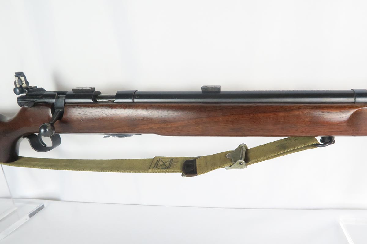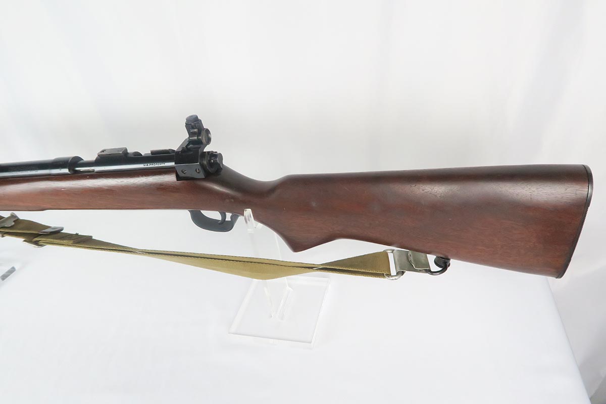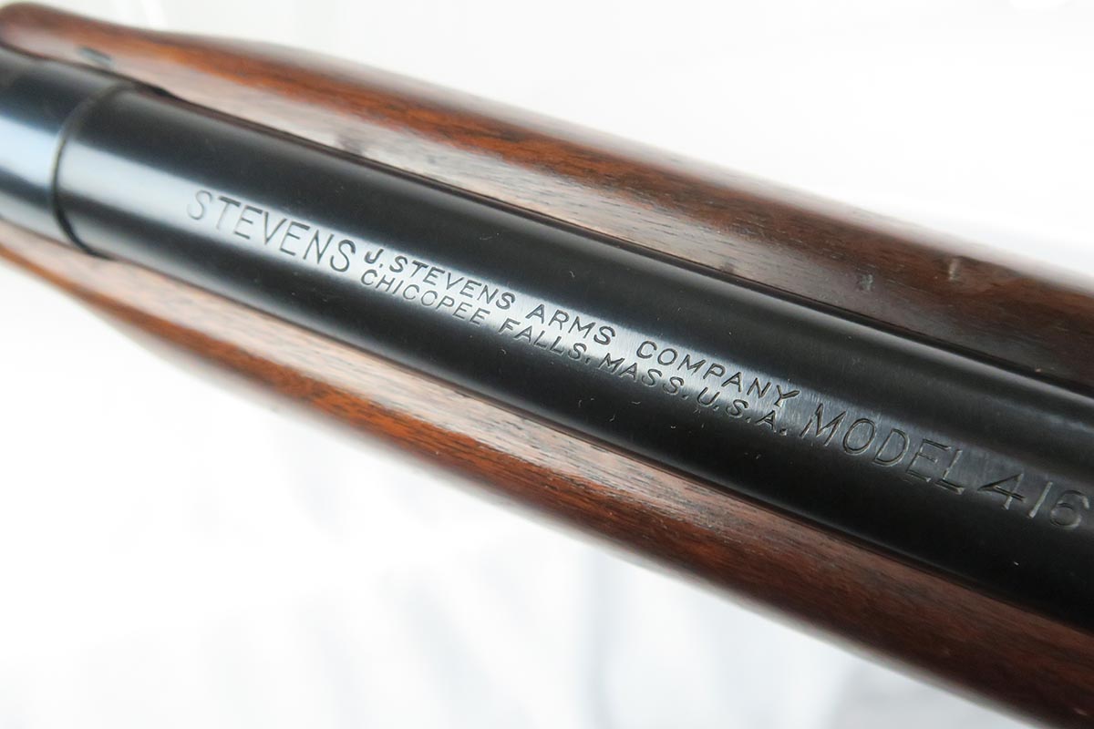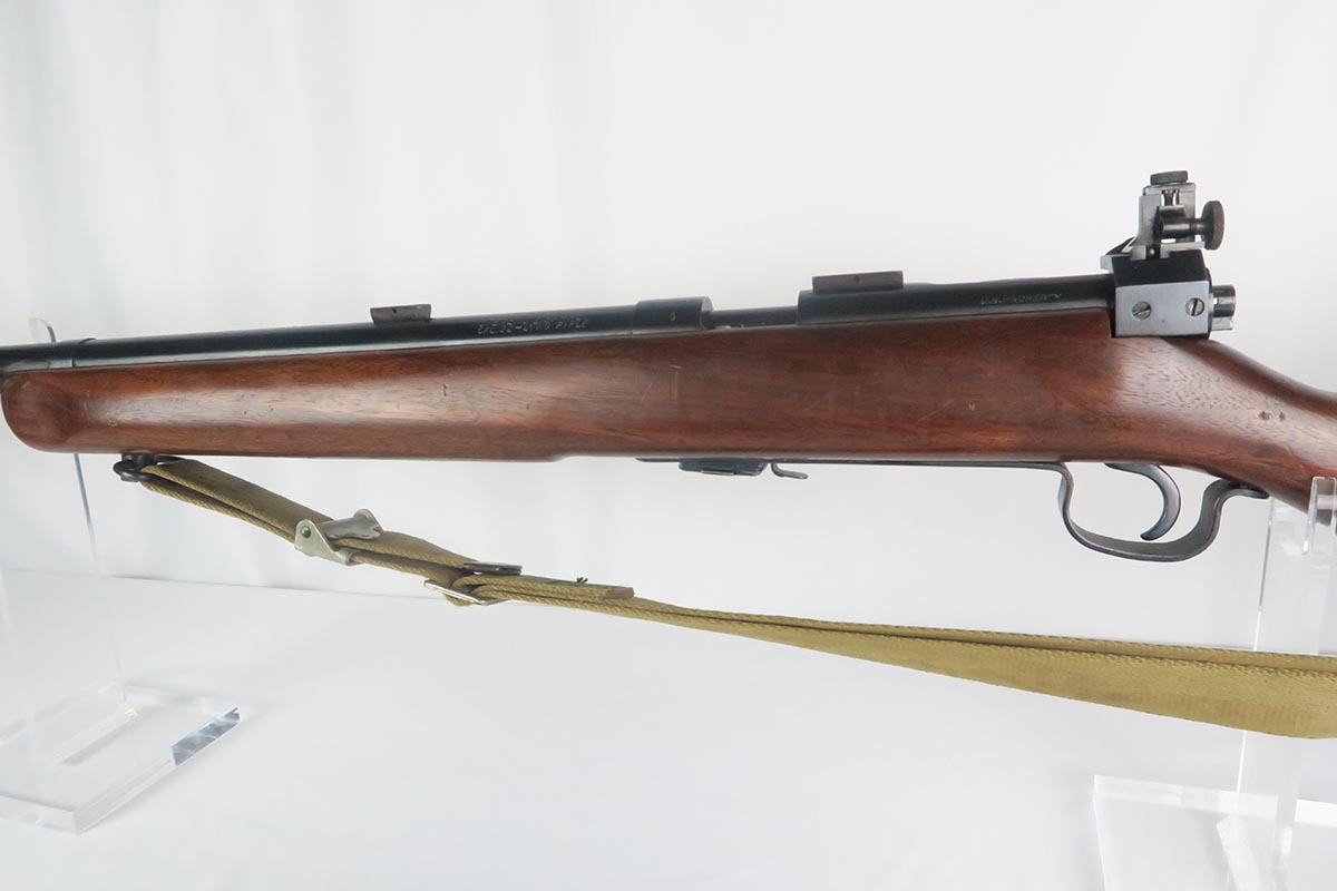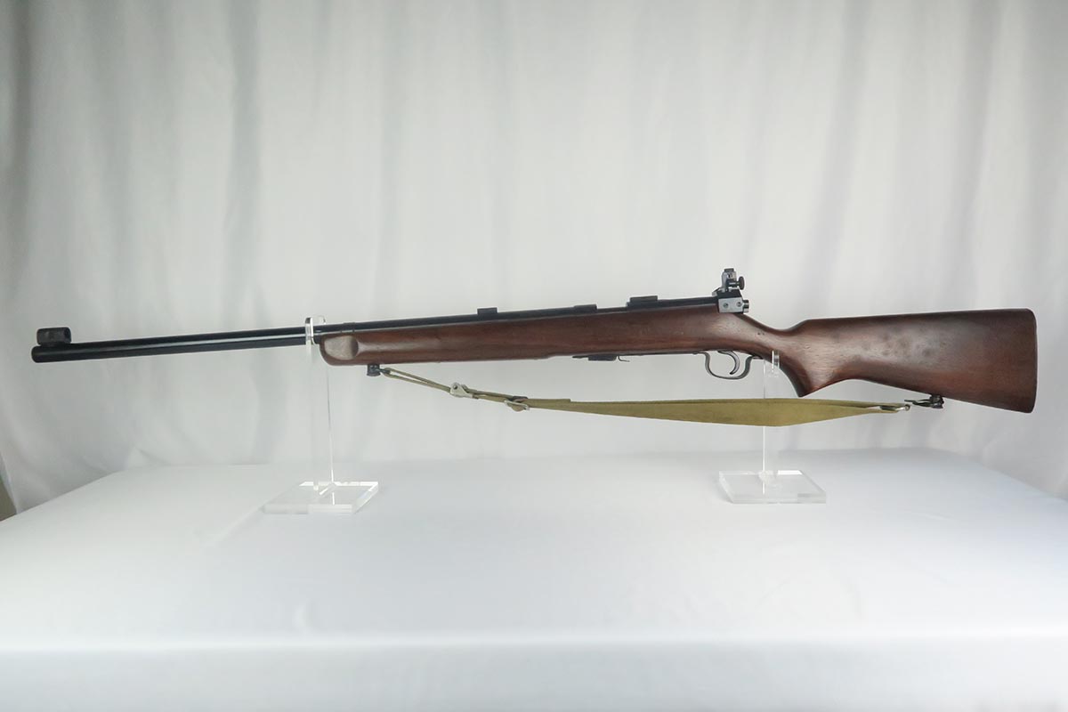 1/3/18 – This is a World War II era Stevens model 416 training rifle. This gun was part of a 10,000 rifle contract that the United States military ordered for use in basic firearms training. It is marked U.S. PROPERTY and also shows the flaming bomb on the receiver. It has the original sights, which is rare because most owners had the sights upgraded. The stock is in very good condition with a few minor dings and scratches, but no chips or cracks. The receiver and metal condition is excellent, with very little finish loss and only minor spotting on the muzzle. Comes with an original sling. Minty bore.
