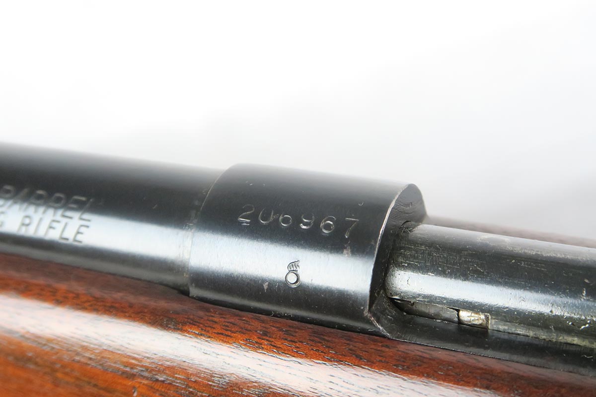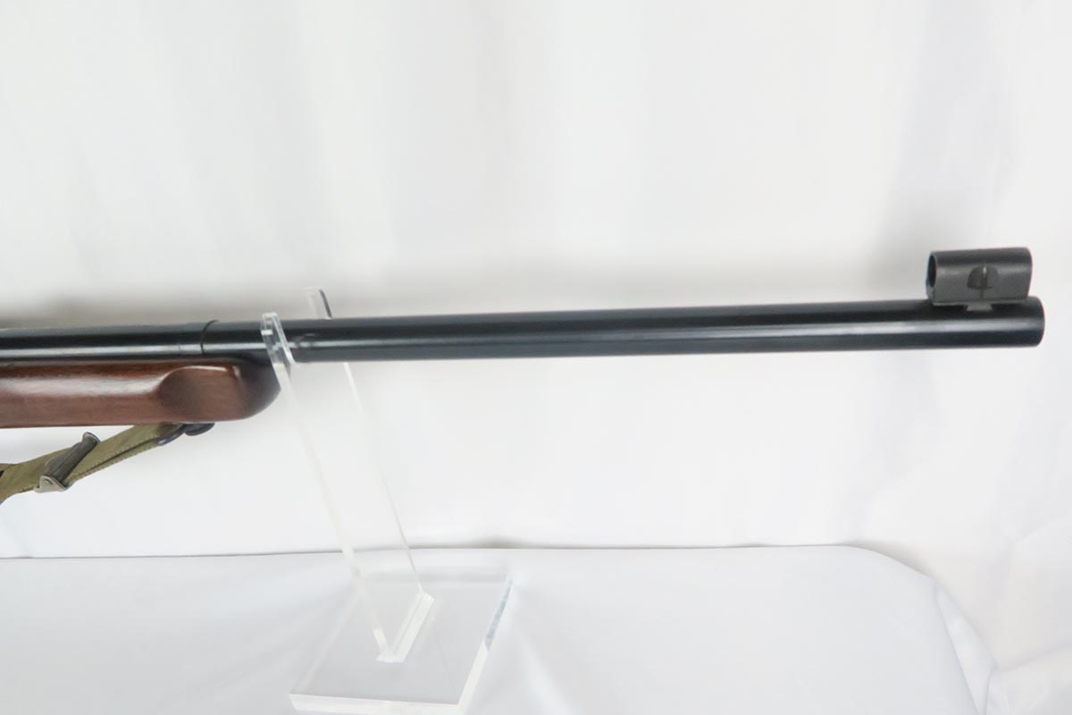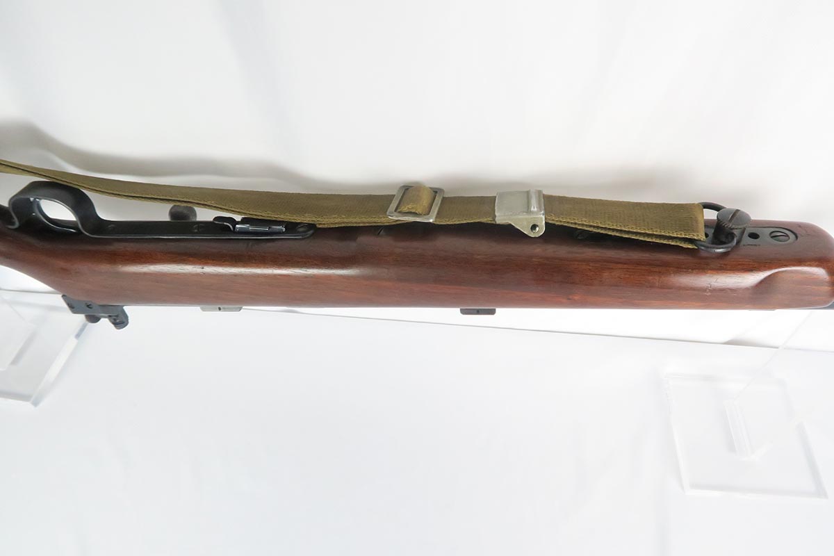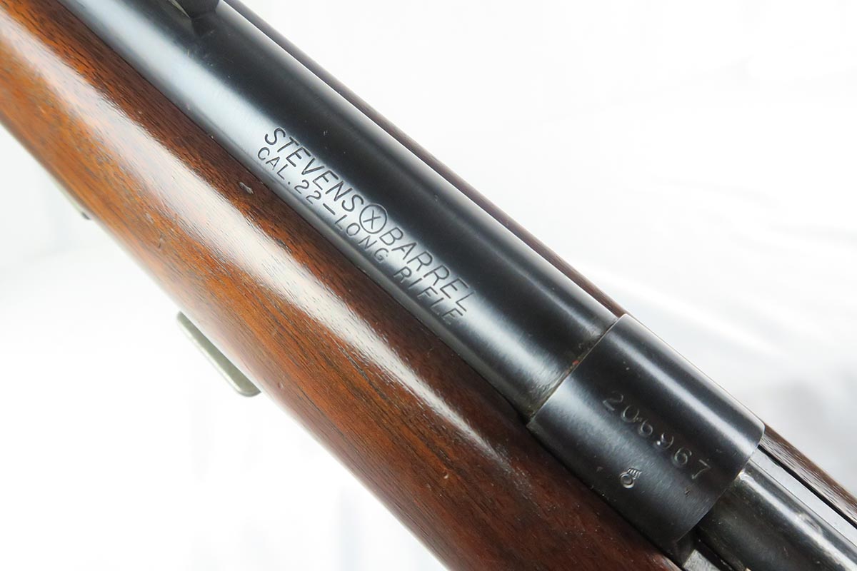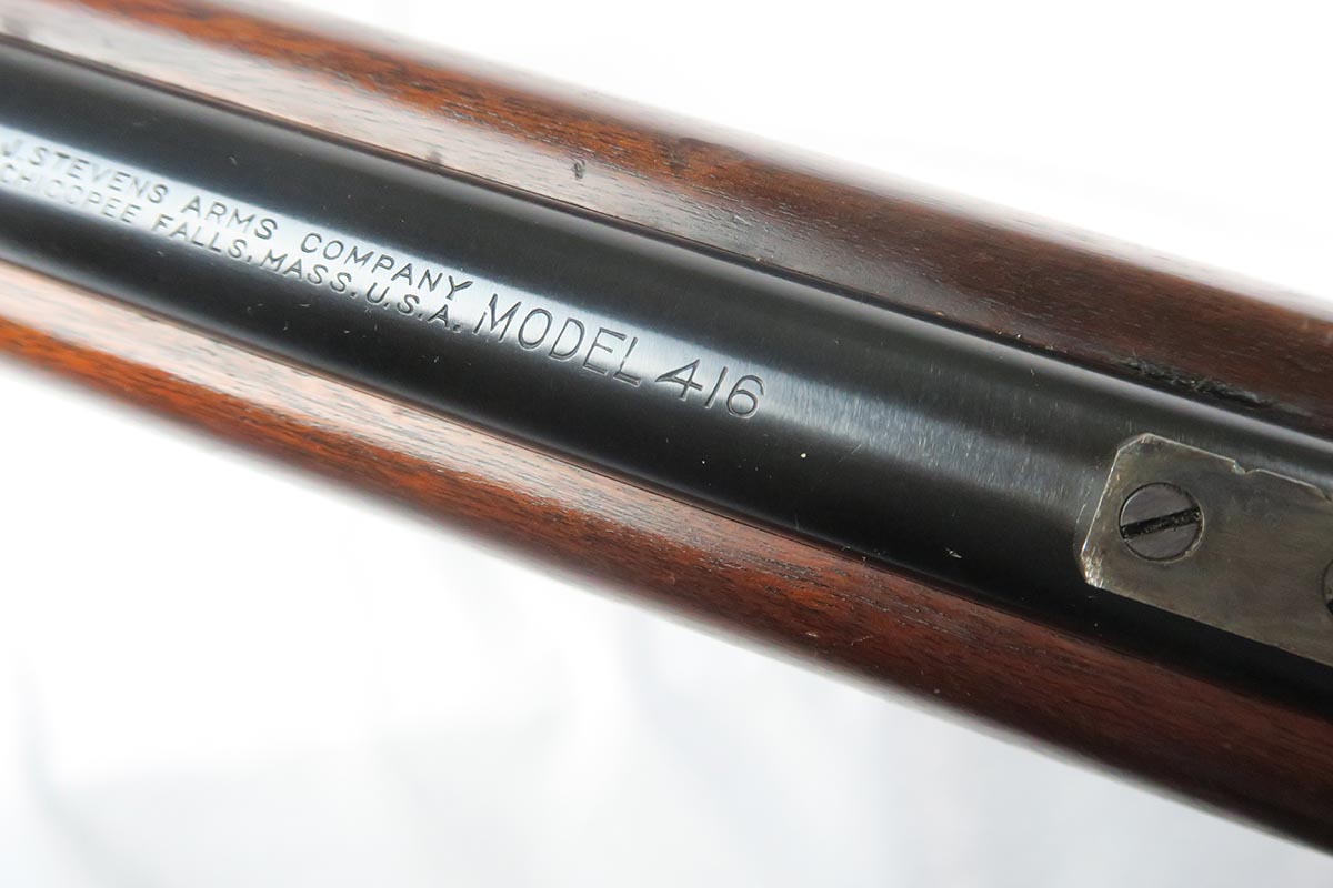 1/3/18 – This is a World War II era Stevens model 416 training rifle. This gun was part of a 10,000 rifle contract that the United States military ordered for use in basic firearms training. It is marked U.S. PROPERTY and also shows the flaming bomb on the receiver. It has the original sights, which is rare because most owners had the sights upgraded. The stock is in very good condition with a few minor dings and scratches, but no chips or cracks. The receiver and metal condition is excellent, with very little finish loss and only minor spotting on the muzzle. Comes with an original sling. Minty bore.