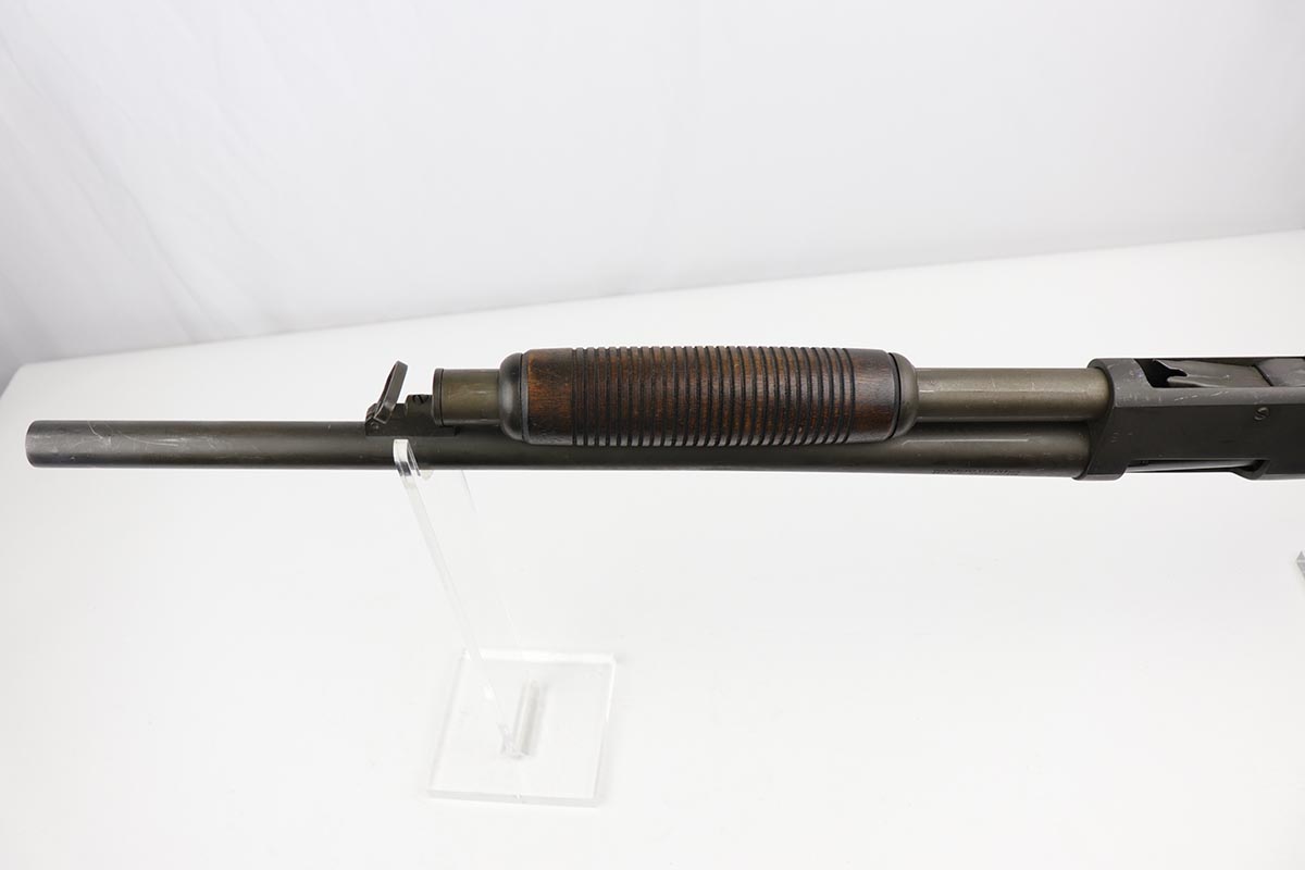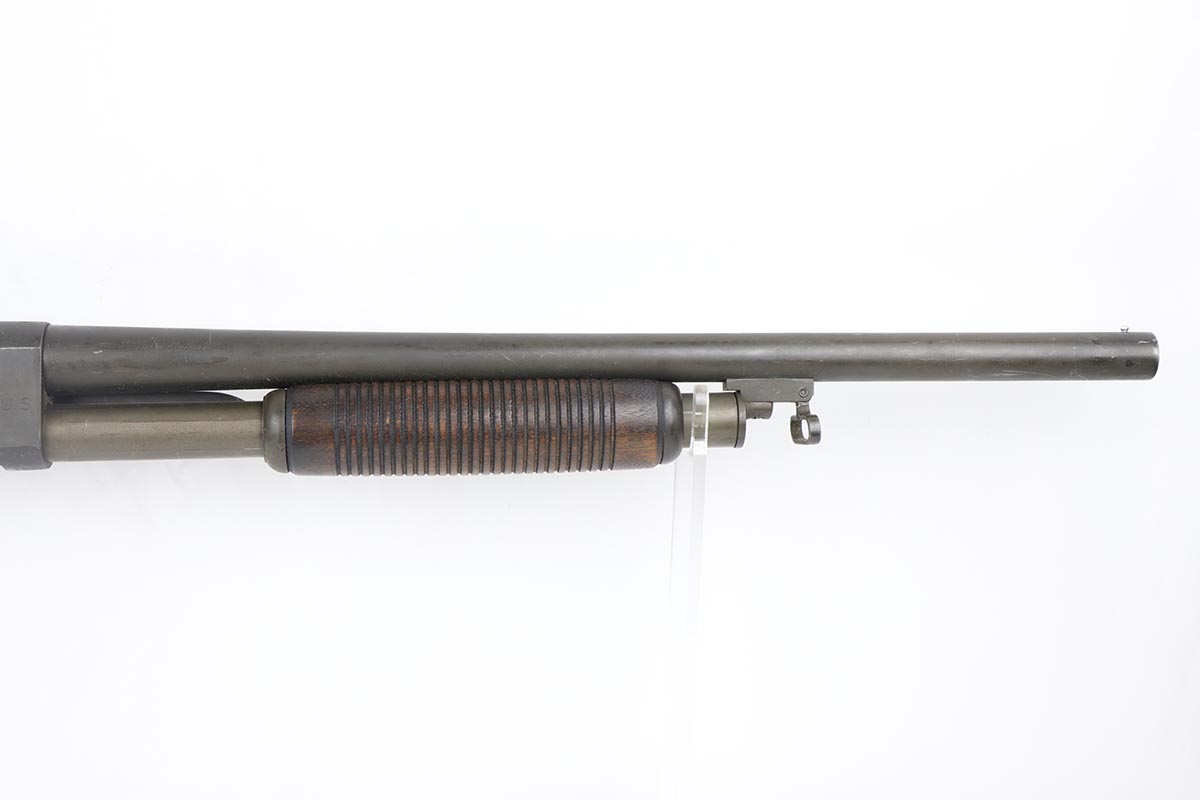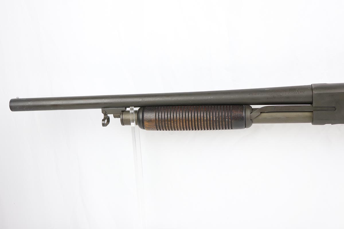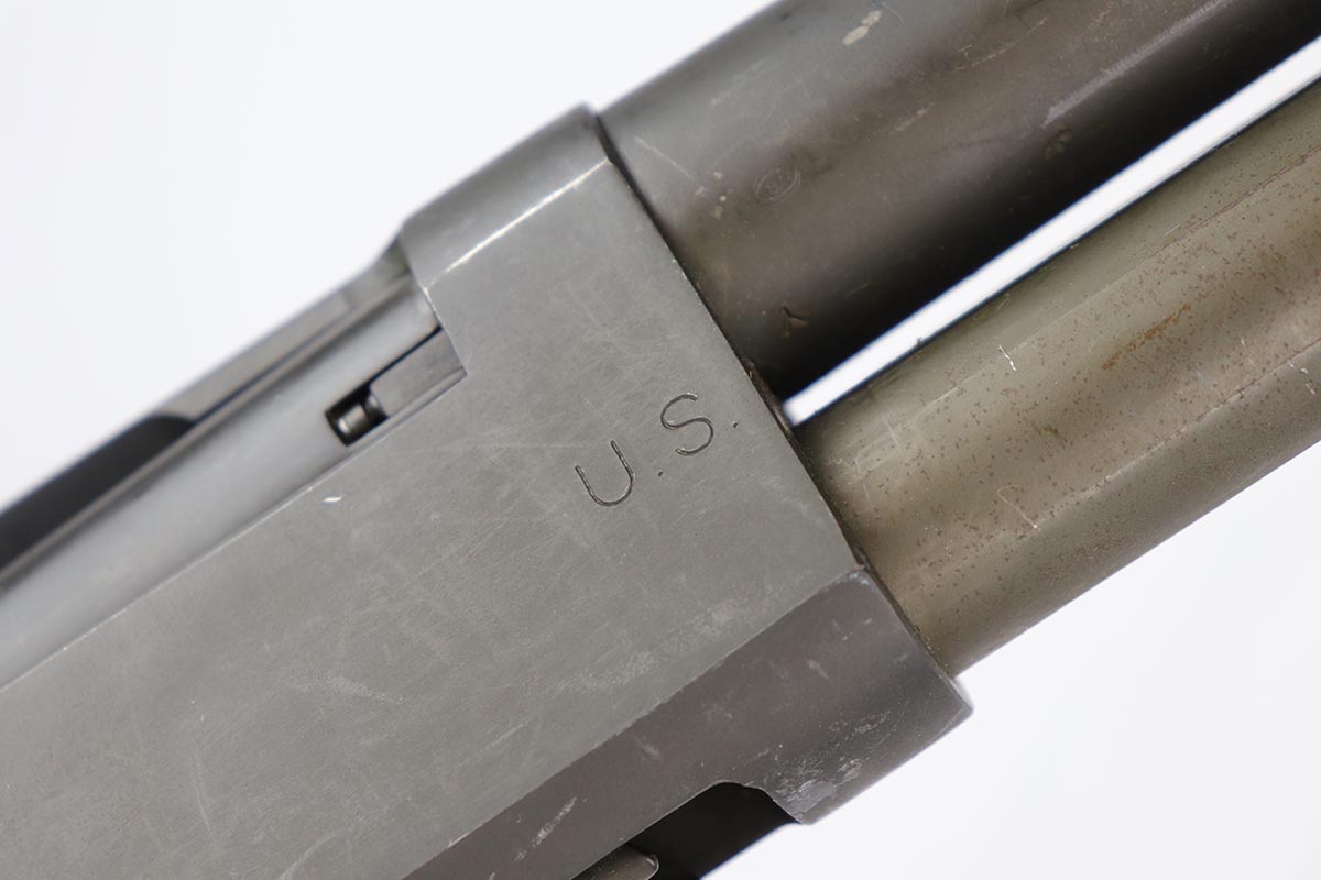 11/7/19 – This is a scarce example of a U.S. marked Stevens Savage Model 77E riot shotung, manufactured about 1963-1964. Beginning in 1963, the U.S. government purchased a total of 69,097 Model 77E riot shotguns from the Savage Arms Corporation for issue to the South Vietnamese Army; however, they were also widely used by U.S. Army and Marine units in Vietnam. Records indicate that 65,724 of the 69,097 Model 77E shotguns purchased under government contract were issued to the Republic of Vietnam or other allied forces. As a result, very few Model 77E shotguns returned from Vietnam, with estimates at only a few thousand. They have a shorter stock than other U.S. military shotguns as they were modified to accommodate South Vietnamese soldiers. They were also the first U.S. combat shotgun equipped with a rubber recoil pad. Military models are parkerized with sling swivels and wooden stocks. The right side of the receiver is ‘U.S.’ marked, and ‘P’ proofs are present on barrel and receiver. There is minor finish loss on the barrel and receiver, with largest spot of wear along the top of the receiver. Of the few that did return from Vietnam, many ended up at police arsenals in the states. This one is marked ‘SCHP’ on the right side, indicating it ended up with the South Carolina Highway Patrol. Just a very uncommon gun with an interesting history. Action is smooth and bore is shiny with only minor frost. Stock has no major cracks or chips.