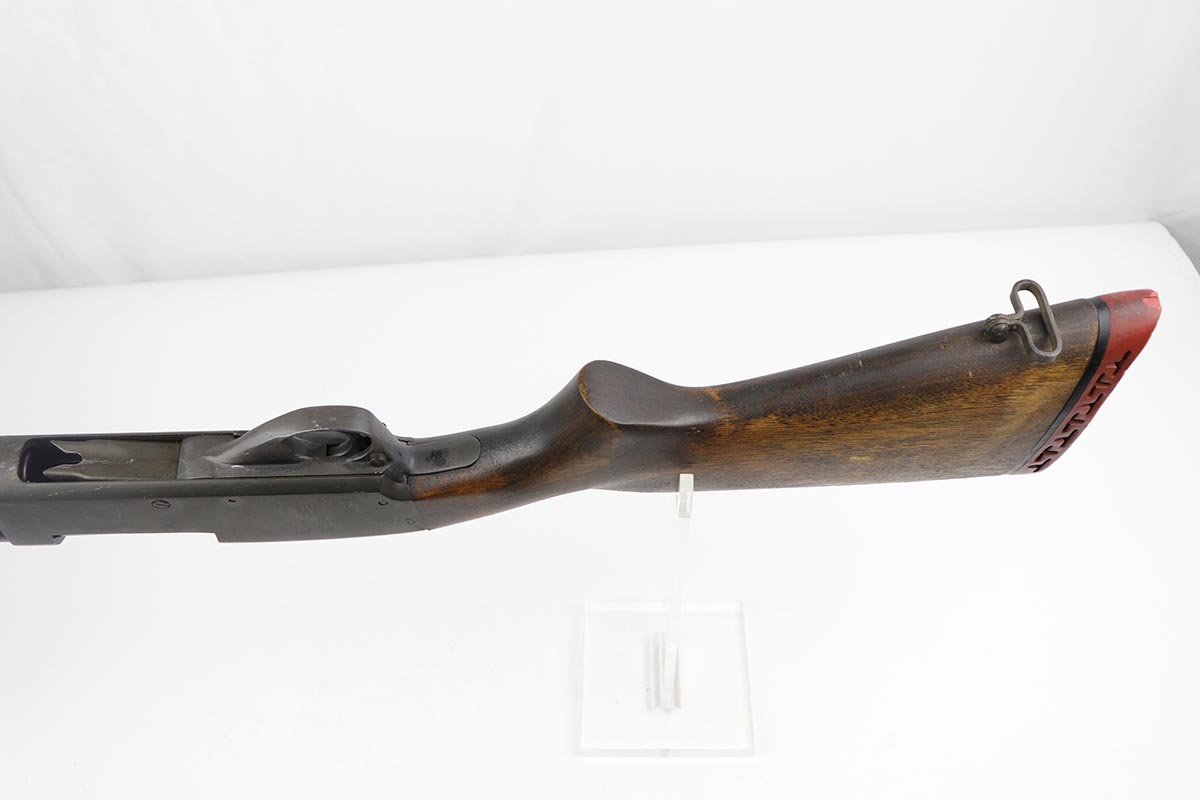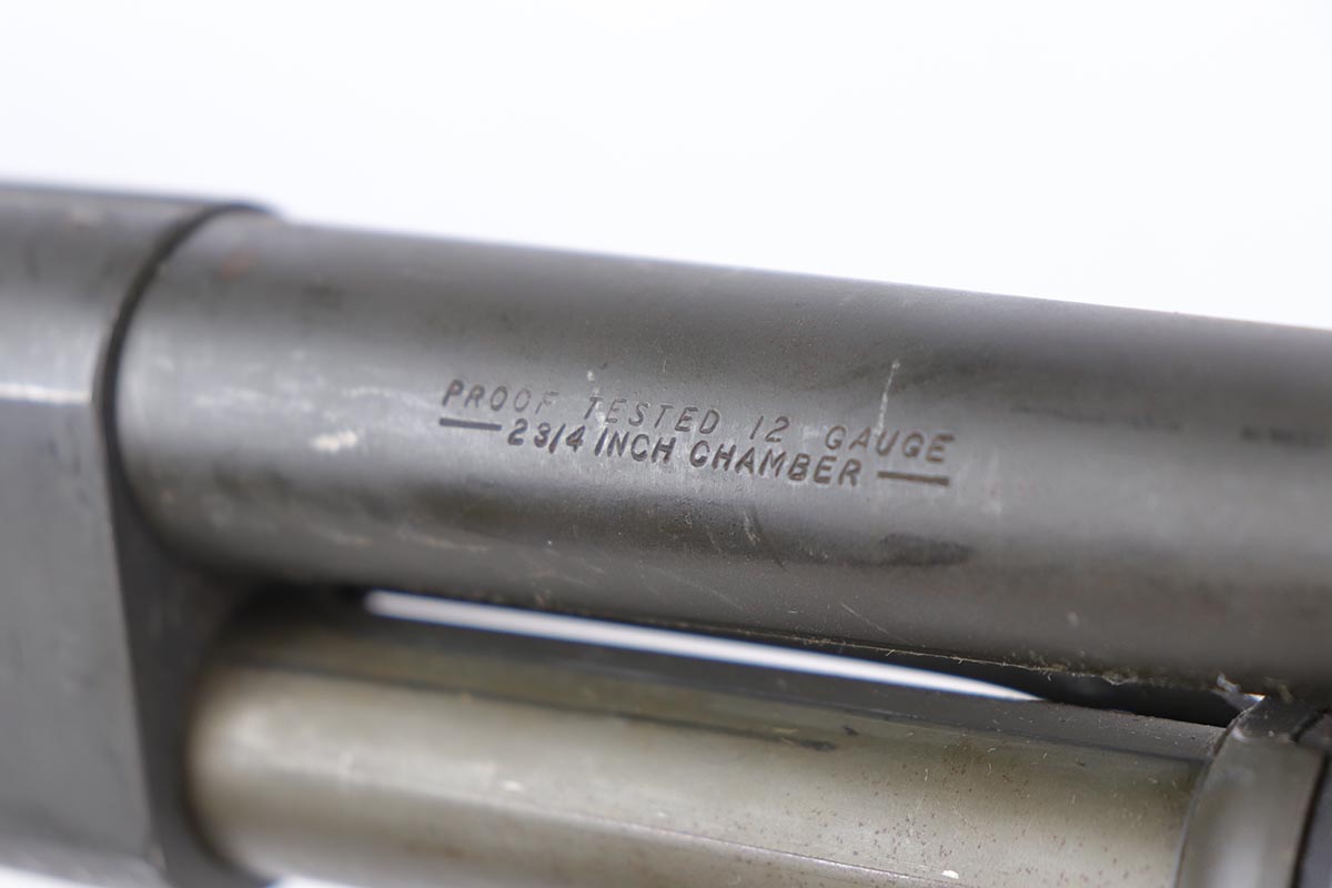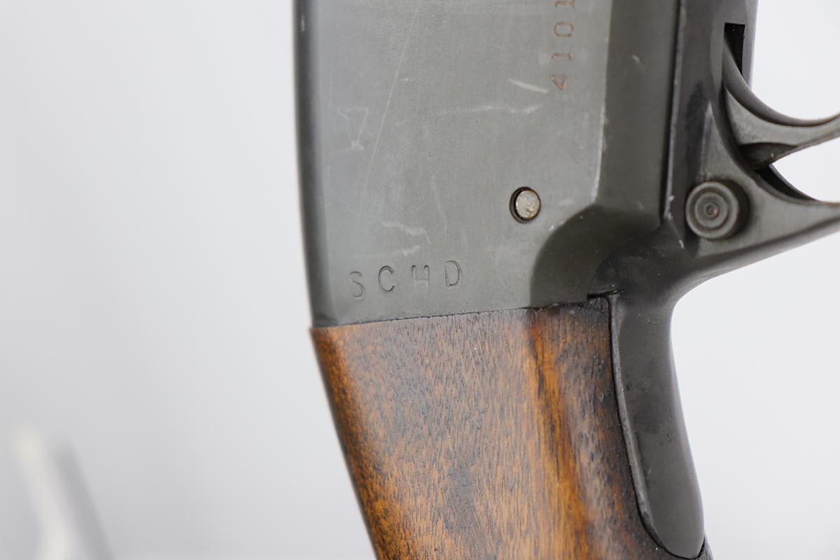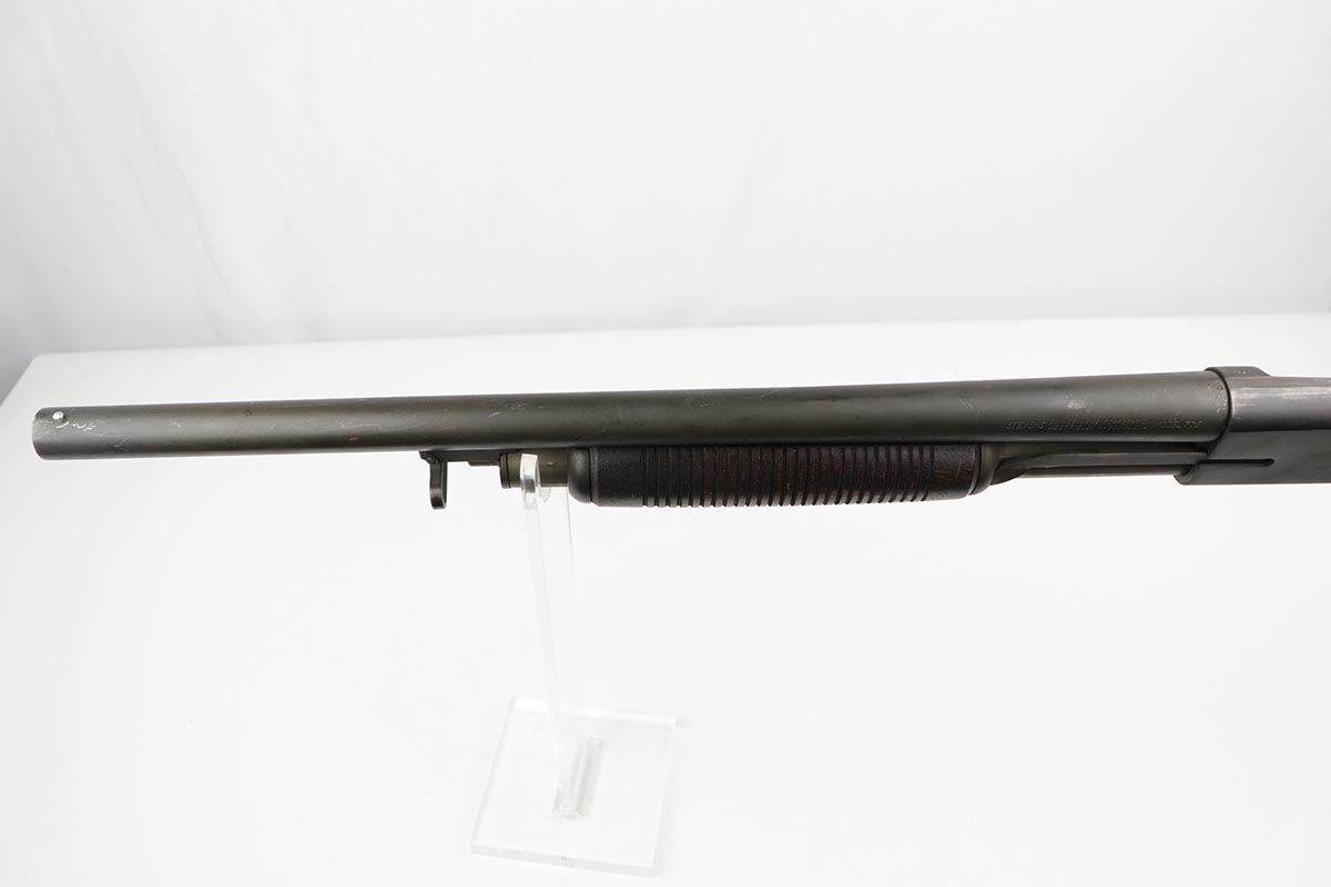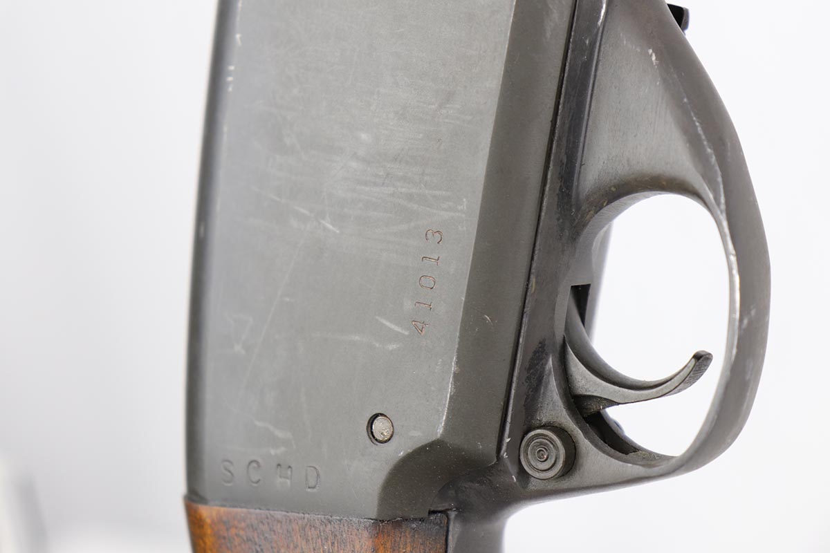 11/7/19 – This is a scarce example of a U.S. marked Stevens Savage Model 77E riot shotung, manufactured about 1963-1964. Beginning in 1963, the U.S. government purchased a total of 69,097 Model 77E riot shotguns from the Savage Arms Corporation for issue to the South Vietnamese Army; however, they were also widely used by U.S. Army and Marine units in Vietnam. Records indicate that 65,724 of the 69,097 Model 77E shotguns purchased under government contract were issued to the Republic of Vietnam or other allied forces. As a result, very few Model 77E shotguns returned from Vietnam, with estimates at only a few thousand. They have a shorter stock than other U.S. military shotguns as they were modified to accommodate South Vietnamese soldiers. They were also the first U.S. combat shotgun equipped with a rubber recoil pad. Military models are parkerized with sling swivels and wooden stocks. The right side of the receiver is ‘U.S.’ marked, and ‘P’ proofs are present on barrel and receiver. There is minor finish loss on the barrel and receiver, with largest spot of wear along the top of the receiver. Of the few that did return from Vietnam, many ended up at police arsenals in the states. This one is marked ‘SCHP’ on the right side, indicating it ended up with the South Carolina Highway Patrol. Just a very uncommon gun with an interesting history. Action is smooth and bore is shiny with only minor frost. Stock has no major cracks or chips.