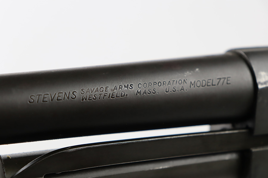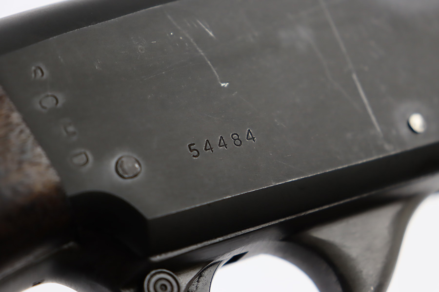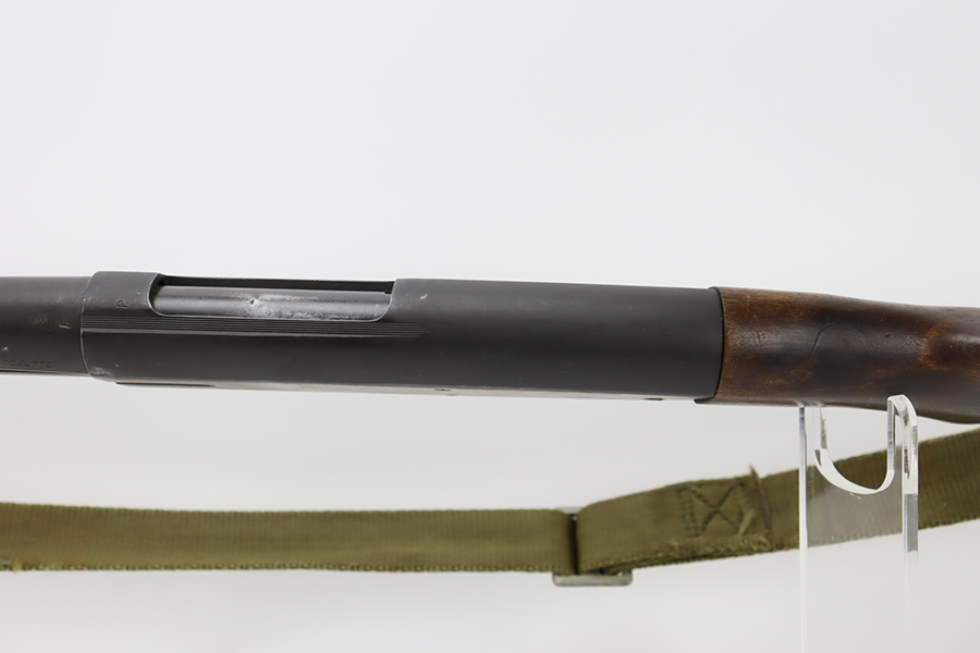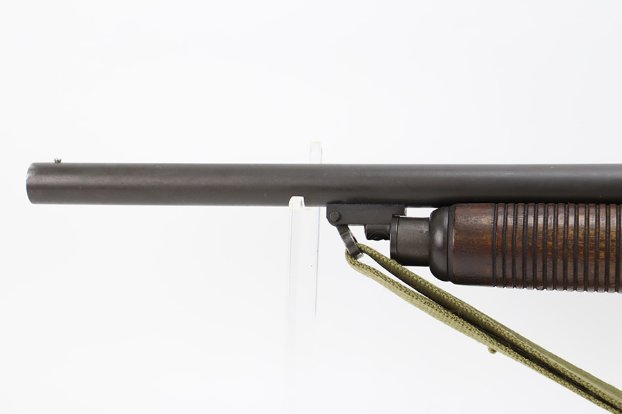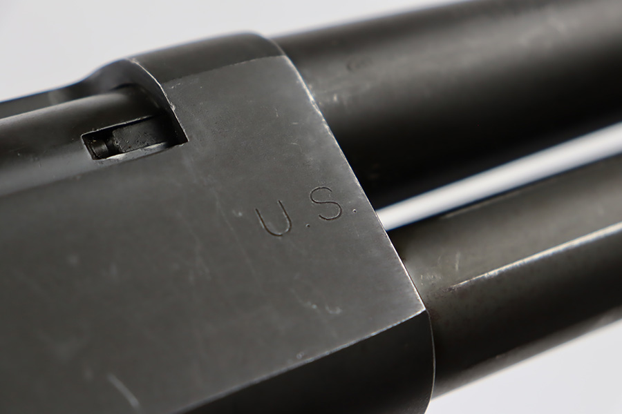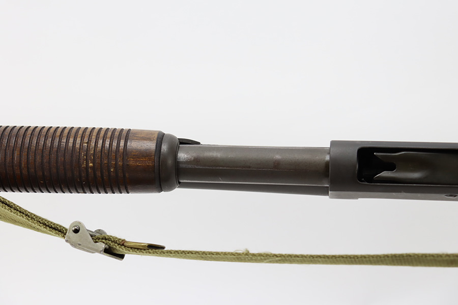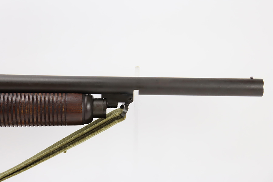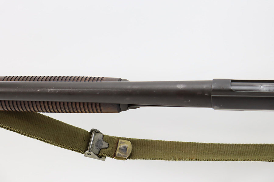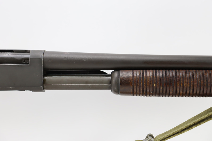11/6/23 – This is a scarce example of a U.S. marked Stevens Savage Model 77E riot shotung, manufactured about 1963-1964. Beginning in 1963, the U.S. government purchased a total of 69,097 Model 77E riot shotguns from the Savage Arms Corporation for issue to the South Vietnamese Army; however, they were also widely used by U.S. Army and Marine units in Vietnam. Records indicate that 65,724 of the 69,097 Model 77E shotguns purchased under government contract were issued to the Republic of Vietnam or other allied forces. As a result, very few Model 77E shotguns returned from Vietnam, with estimates at only a few thousand. They have a shorter stock than other U.S. military shotguns as they were modified to accommodate South Vietnamese soldiers. They were also the first U.S. combat shotgun equipped with a rubber recoil pad. Military models are parkerized with sling swivels and wooden stocks. The right side of the receiver is ‘U.S.’ marked, and ‘P’ proofs are present on barrel and receiver. There is minimal finish loss on the gun, but the left side of the receiver does have a pattern of wear or imprint. Of the few that did return from Vietnam, many ended up at police arsenals in the states. This one is marked ‘SCHP’ on the right side, indicating it ended up with the South Carolina Highway Patrol. Just a very uncommon gun with an interesting history. Action is smooth and bore is shiny with only minor frost. Stock has no major cracks or chips.