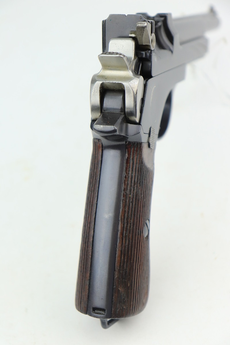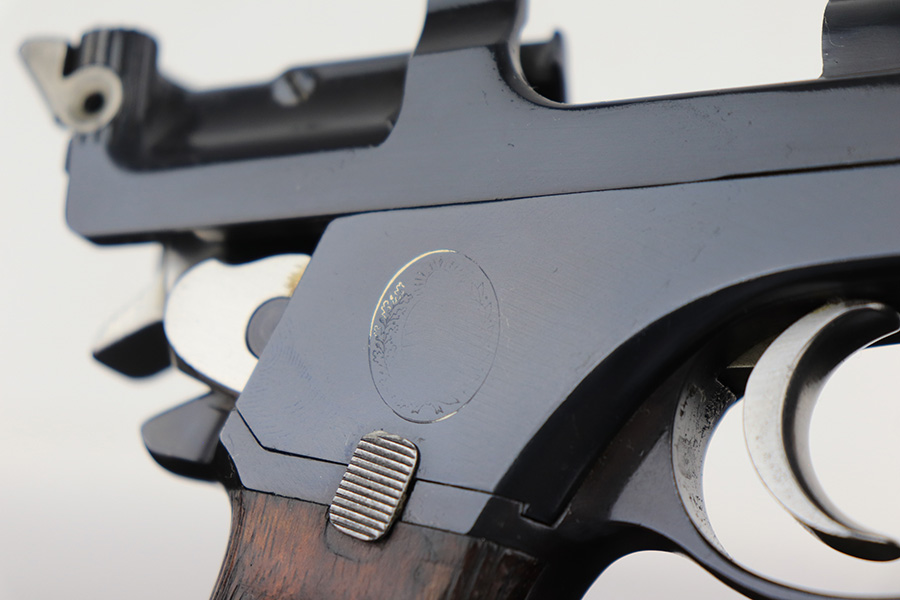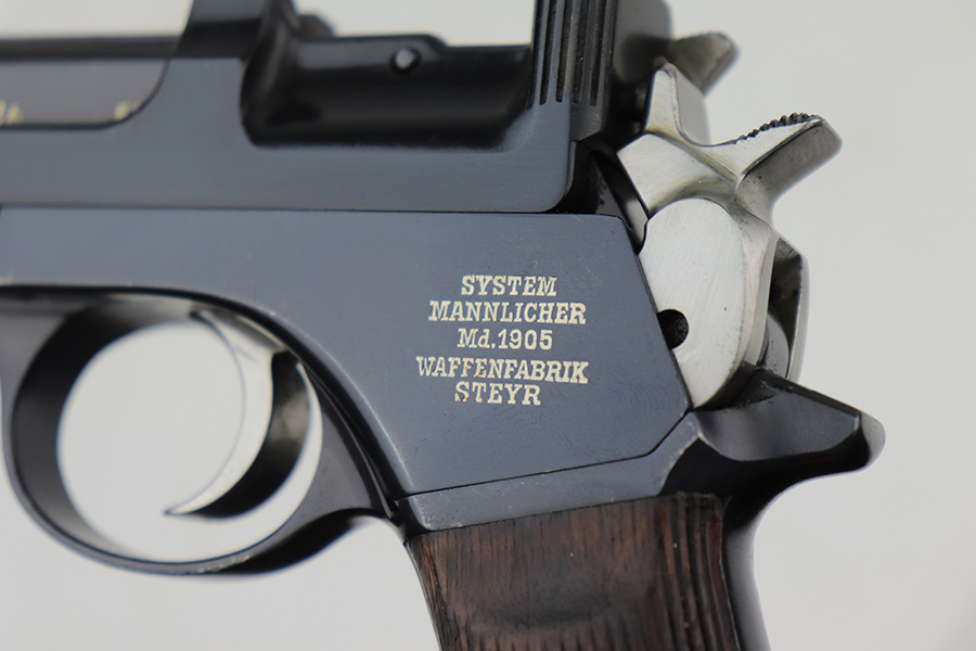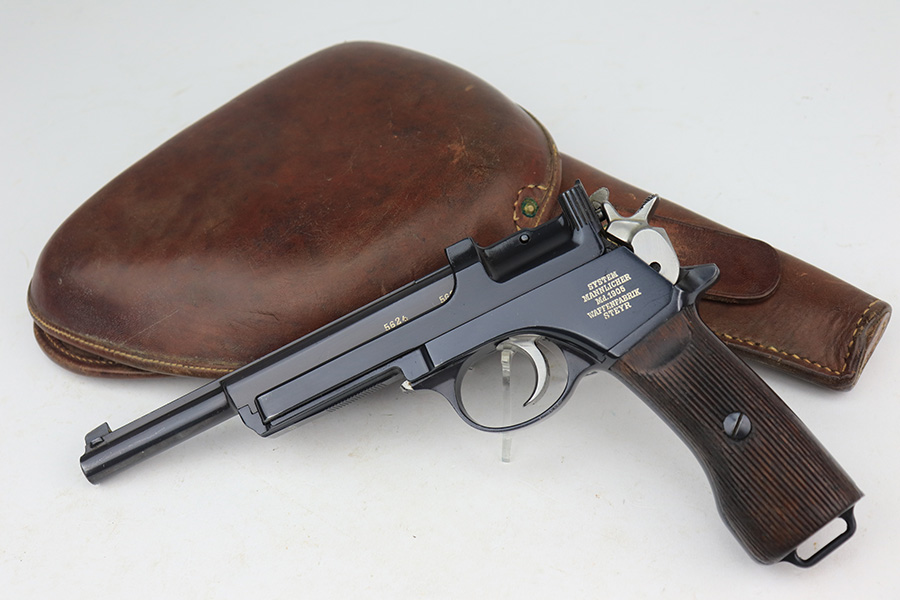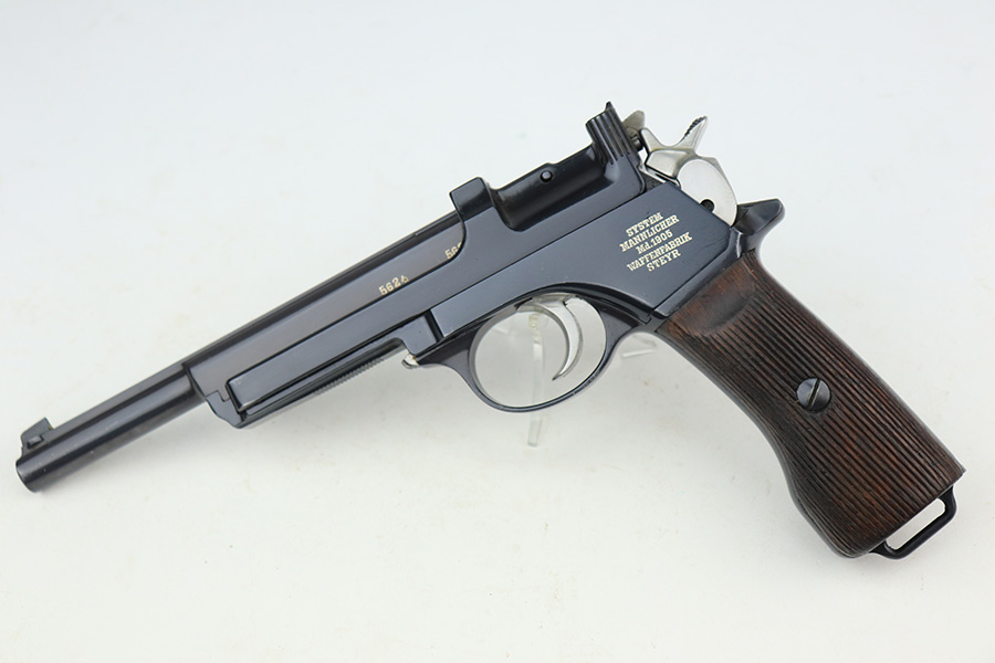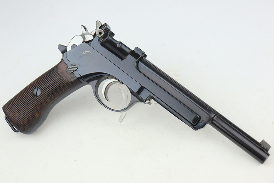 3/24/22 – This is a terrific example of the rare Mannlicher Model 1905. The pistol is arsenal refinished and the original Argentinian crest on the right side of the frame has been scrubbed. The finish is dark throughout, and the straw parts are completely in the white. Further, the top sear bar is not fire blued, but dark blued instead. Overall still in excellent condition. These very elaborately made handguns were made from many complicated machined parts and were very labor intensive to produce. They had an integral magazine and had to be fed from the top with stripper clips or individual rounds. Only about 5,000 were made in various configurations and were popular with the army officers who had to purchase their own guns. Excellent grips and bore. All matching numbers. Comes with an excellent tan leather holster.