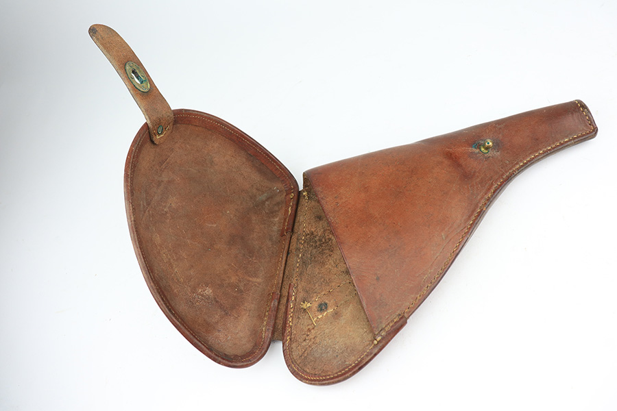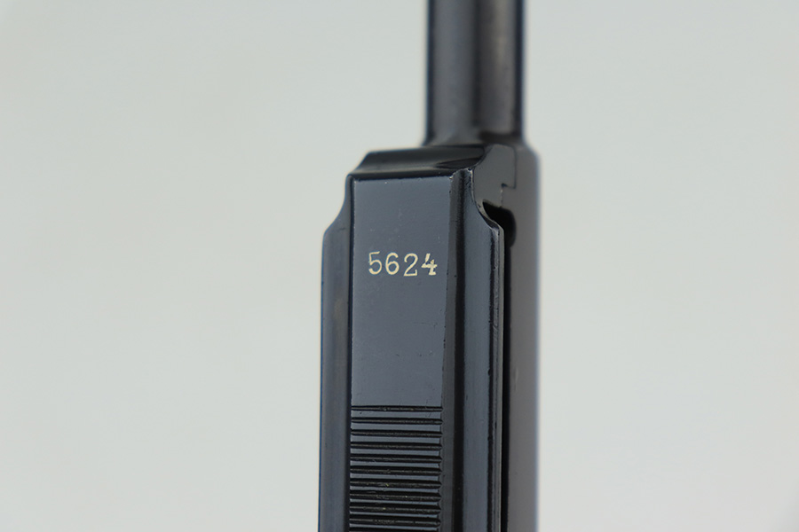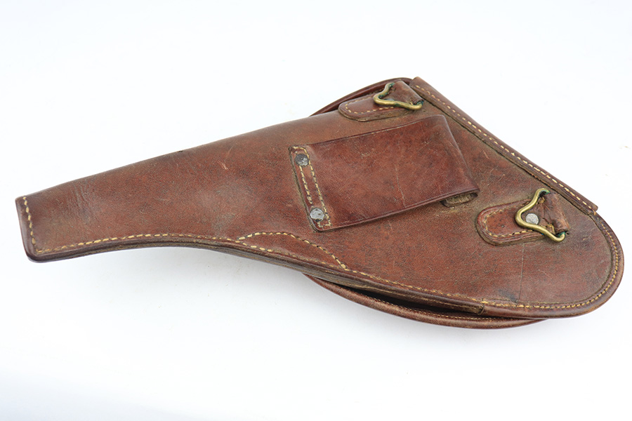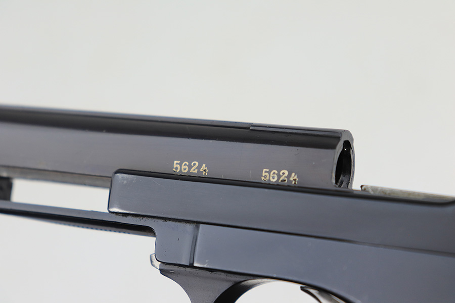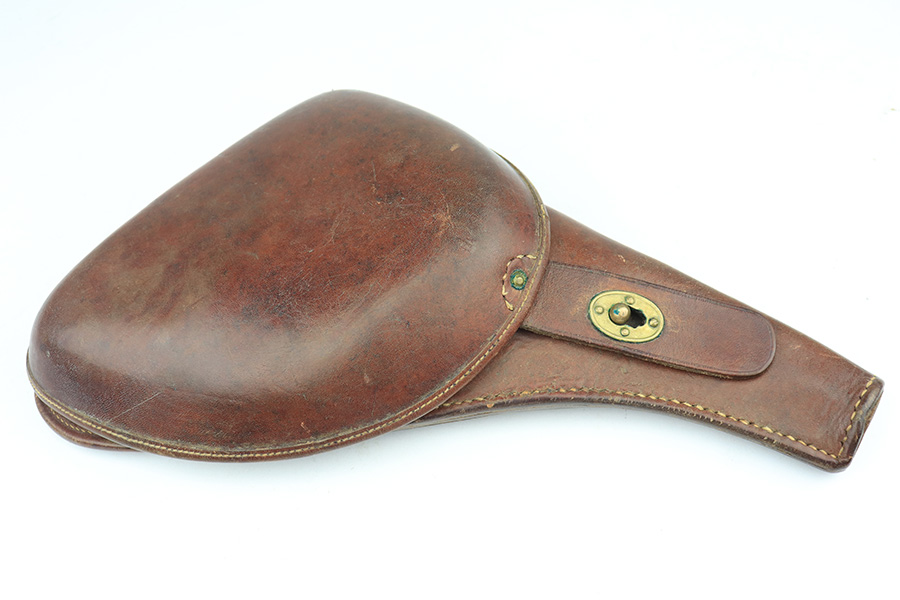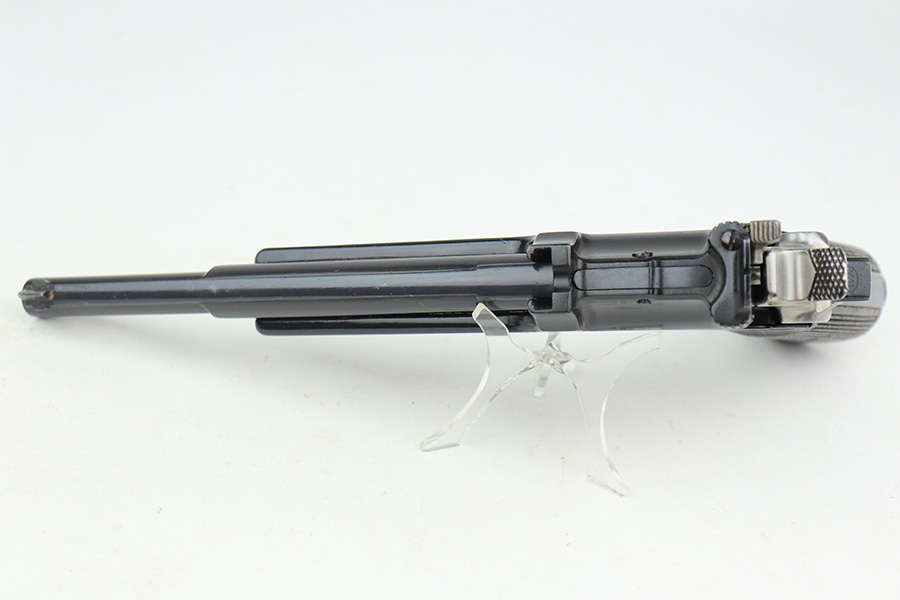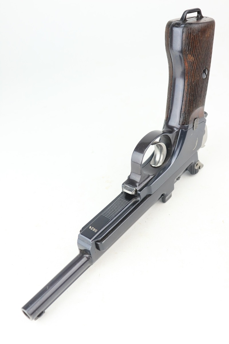 3/24/22 – This is a terrific example of the rare Mannlicher Model 1905. The pistol is arsenal refinished and the original Argentinian crest on the right side of the frame has been scrubbed. The finish is dark throughout, and the straw parts are completely in the white. Further, the top sear bar is not fire blued, but dark blued instead. Overall still in excellent condition. These very elaborately made handguns were made from many complicated machined parts and were very labor intensive to produce. They had an integral magazine and had to be fed from the top with stripper clips or individual rounds. Only about 5,000 were made in various configurations and were popular with the army officers who had to purchase their own guns. Excellent grips and bore. All matching numbers. Comes with an excellent tan leather holster.