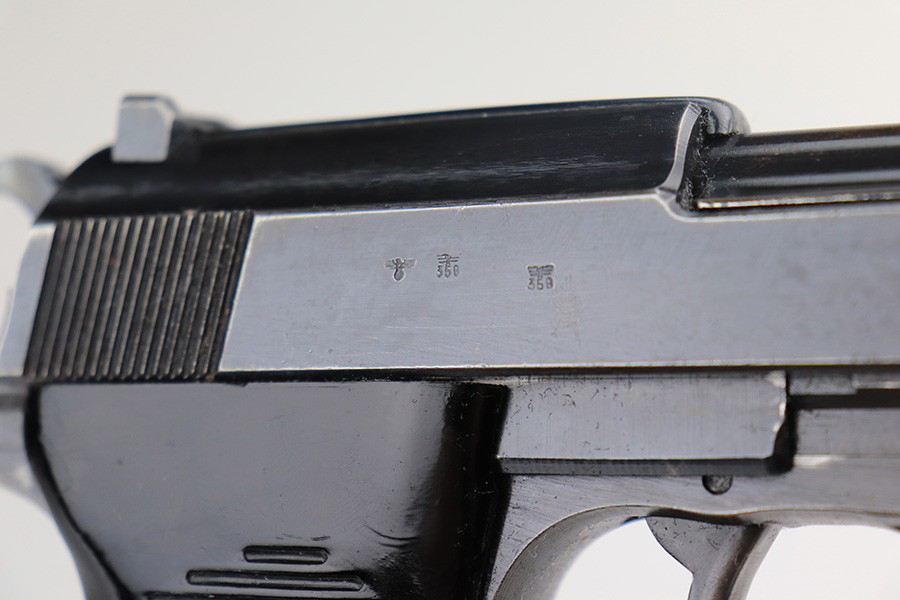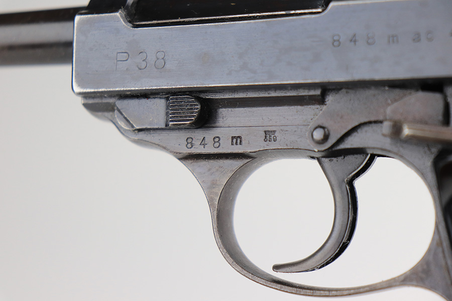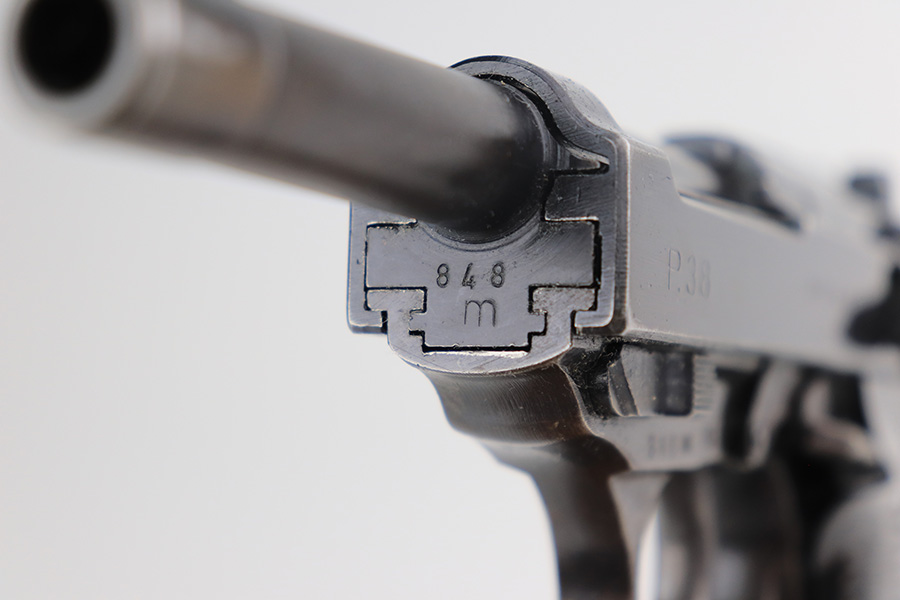 3/1/22 – This is a nice example of a Walther P.38 issued to the Nazi military in 1943. It is all matching and has the proper “Eagle 359” military proofs. This one is scarce because it has a single-line slide legend. It is in the proper “m” serial block for this variation. It has retained somewhere between 85-90% of its original finish. Most of the wear is on the front strap, where there is also brown patina. There is muzzle wear, hints of wear on the high edges of the slide, and light brown patina on the barrel. Comes with black bakelite grips and a period-correct Walther magazine. The bore has good rifling with minor frosting throughout. De-cocker is functional.