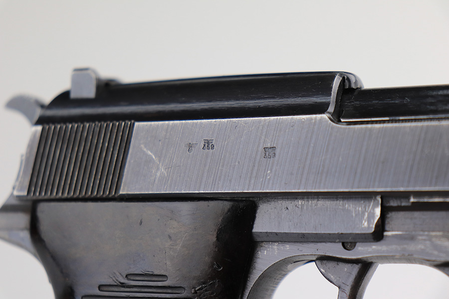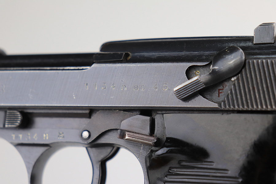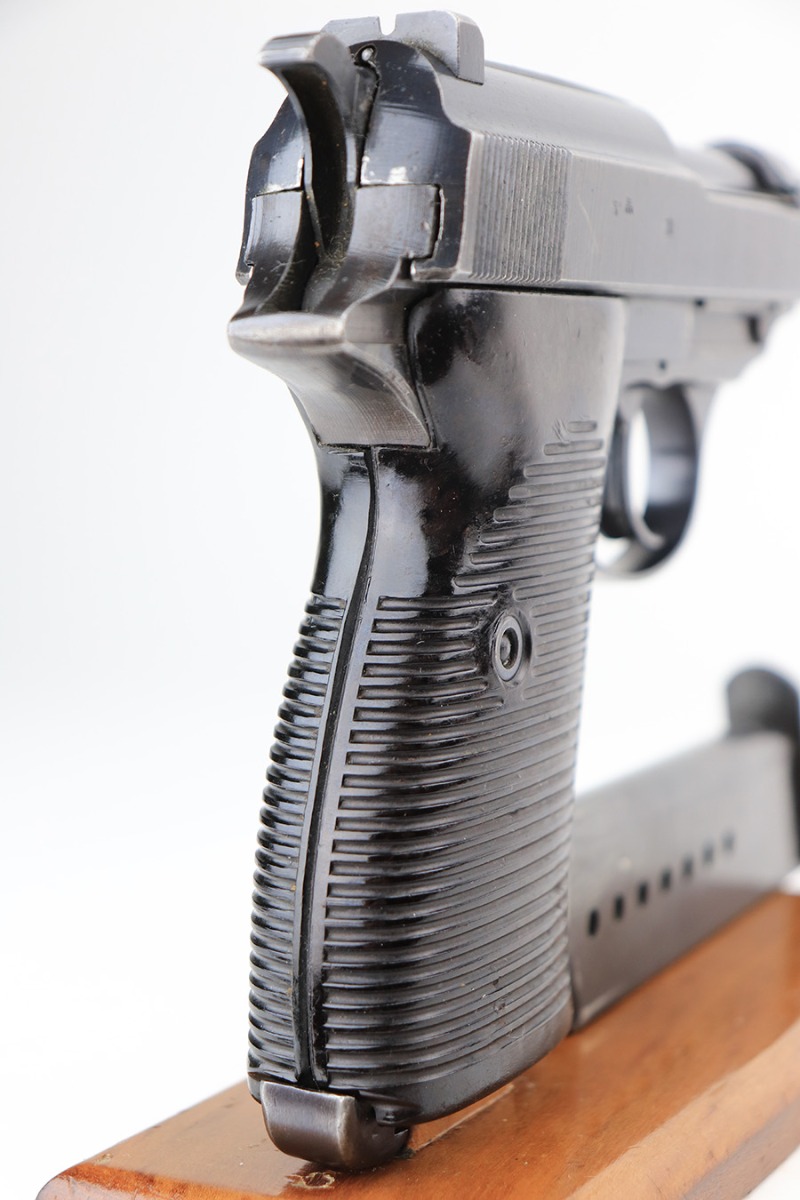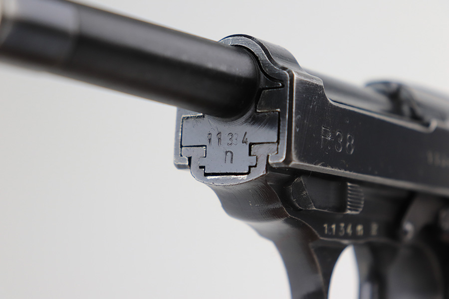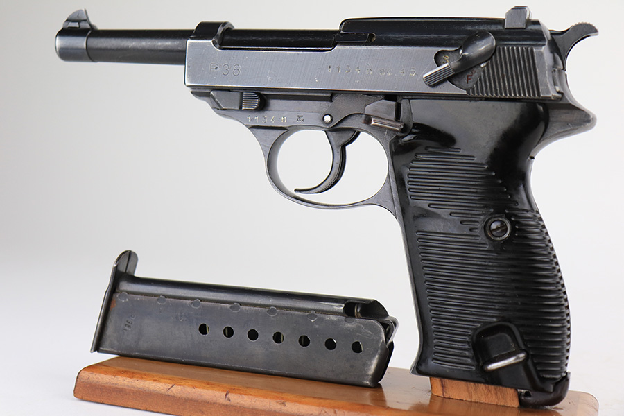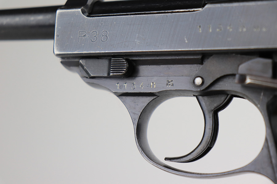 3/16/22 – This is an excellent example of a Walther P.38 issued to the Nazi military in 1943. It is all matching and has the proper “Eagle 359” military proofs. This one is scarce because it has a single-line slide legend. It is in the proper “m/n” serial block for this variation. It has retained somewhere between95% of its original finish. There is very minor thinning on the front strap and minor wear around the muzzle and high edges of the slide. A few light scratches on the right side of the slide. One small dot of discoloration on the underside of the trigger guard. Comes with excellent period-correct grips and a proper Walther magazine. The bore is mint. De-cocker is functional.