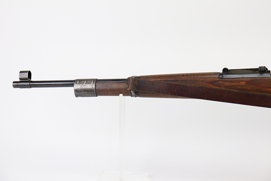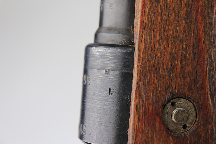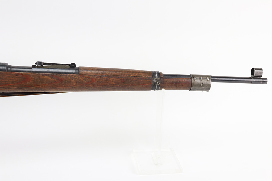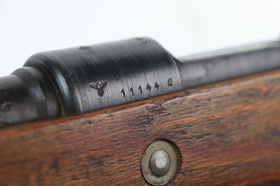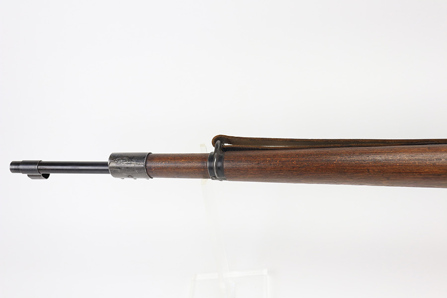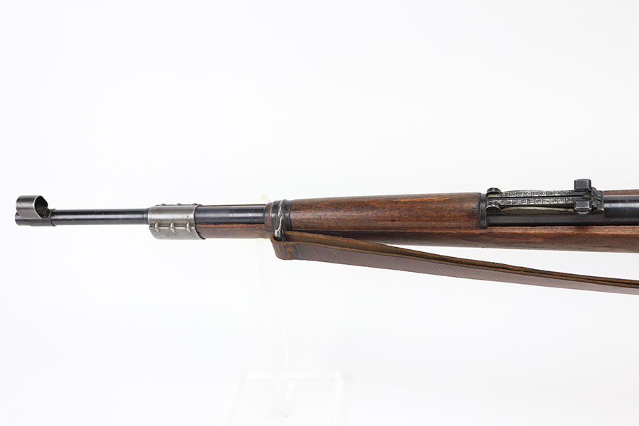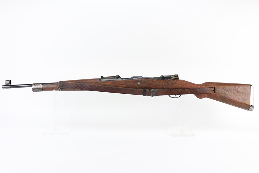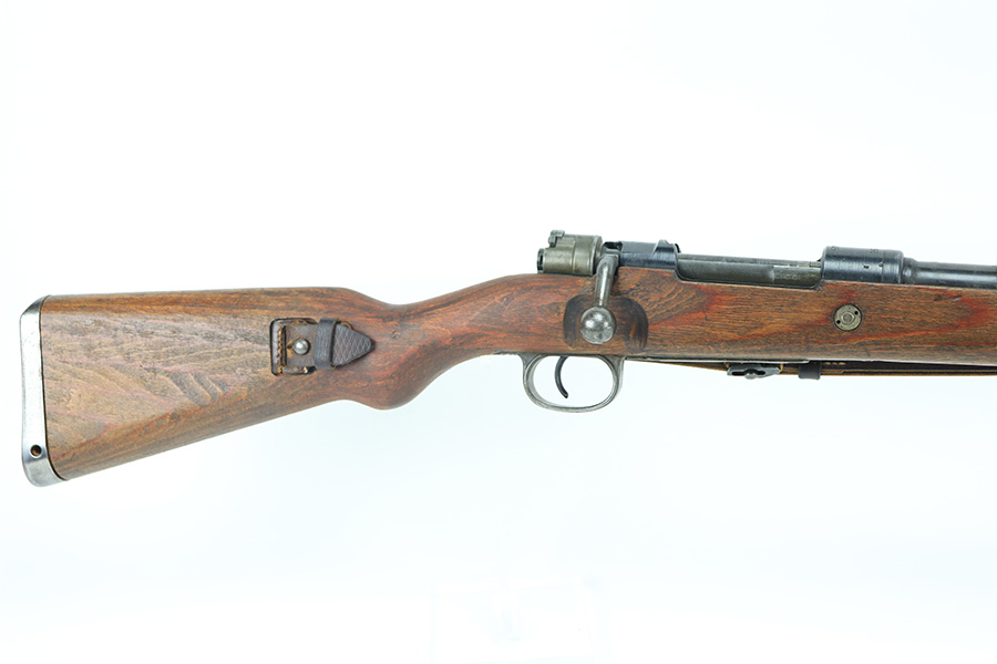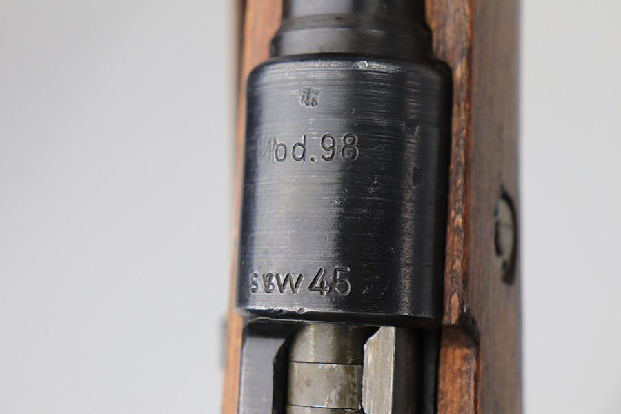 3/15/22 – This is a very nice example of a Mauser K98 Kriegsmodell issued to the Nazi military in 1945. It has typical late-war features for a Kriegsmodell such as no cleaning rod slot, no bayonet lug and no disassembly disc. It also has a rare “svw 45” Mauser makers mark on the receiver. The only numbered parts are the receiver and bolt assembly, which are mismatched. Comes with a period-correct leather sling. The floor plate/trigger assembly do not fit perfectly in the rifle – there is a small gap between the wood and metal. There is no visible numbering on the stock, but there are faint waffen proofs on the right side and underside of the butt stock. There are some light scratches on the receiver and barrel. The front barrel band, floor plate, and trigger assembly have almost no finish. The wood stock is very nice, but it looks like there were a couple of wood repairs and a repaired hairline crack around the wrist. The bore is mint.
