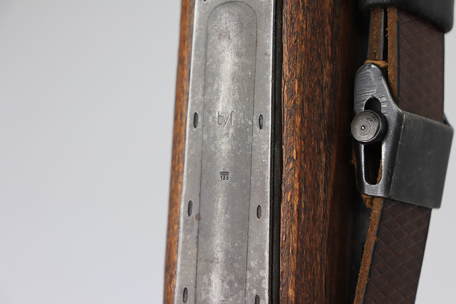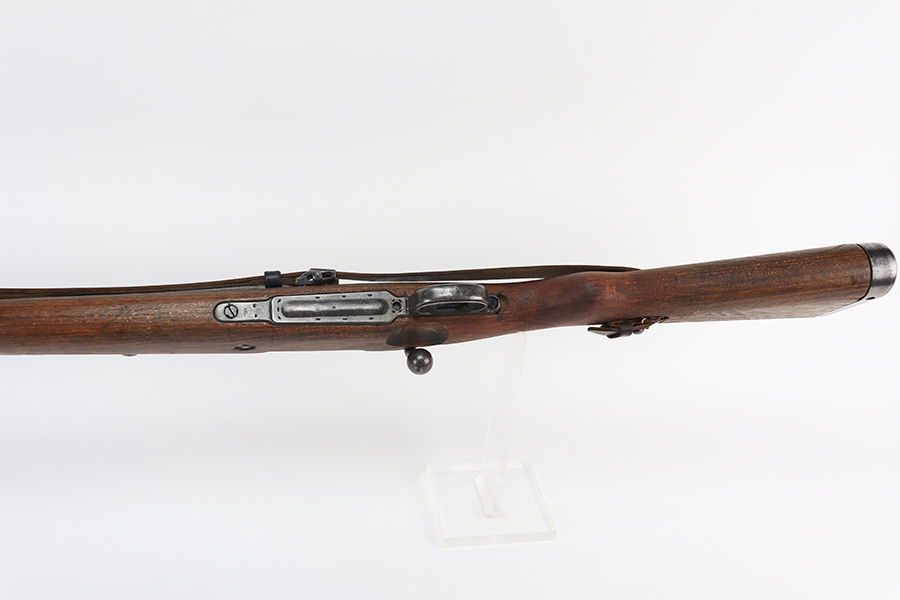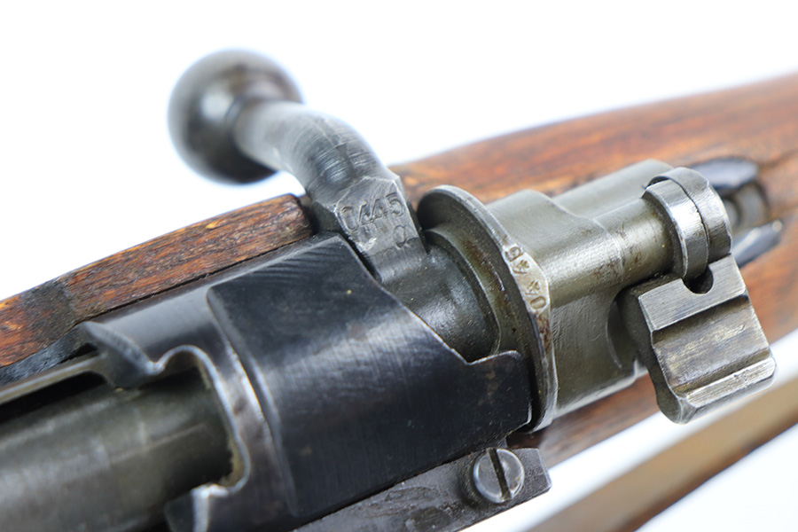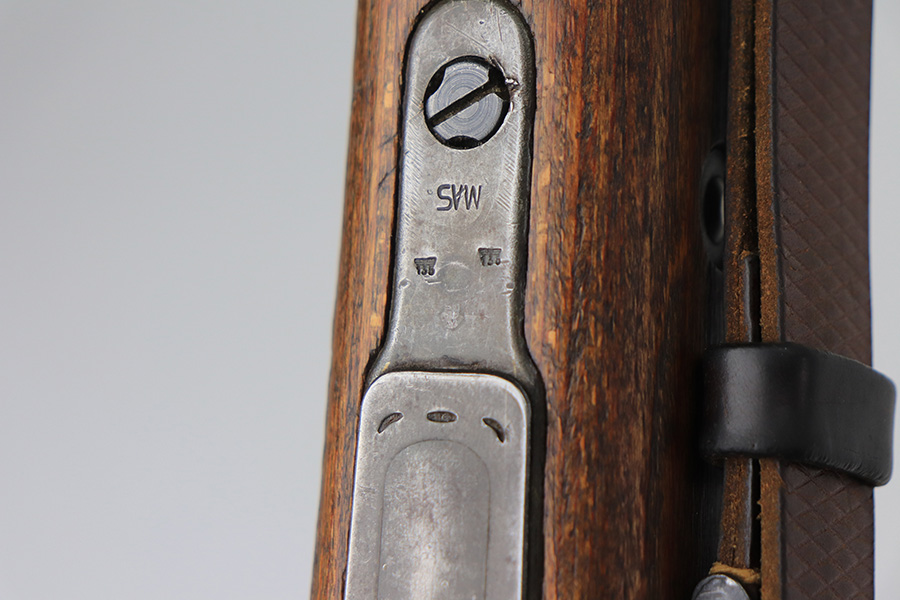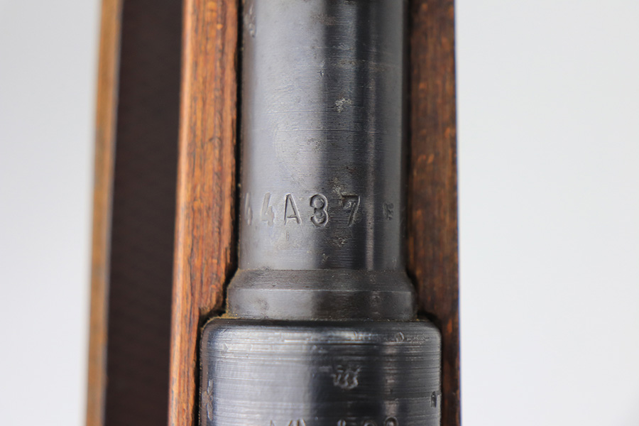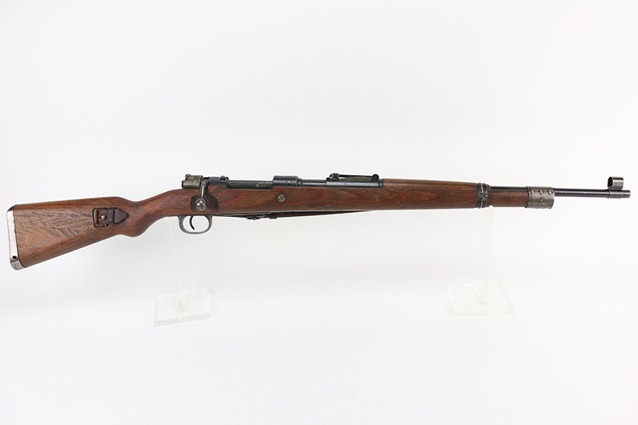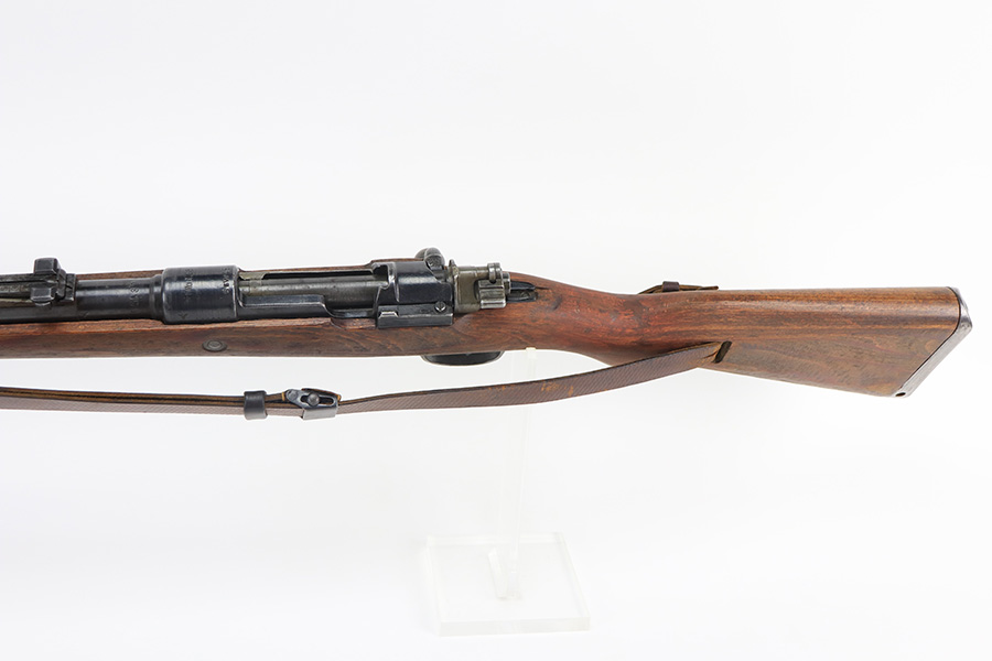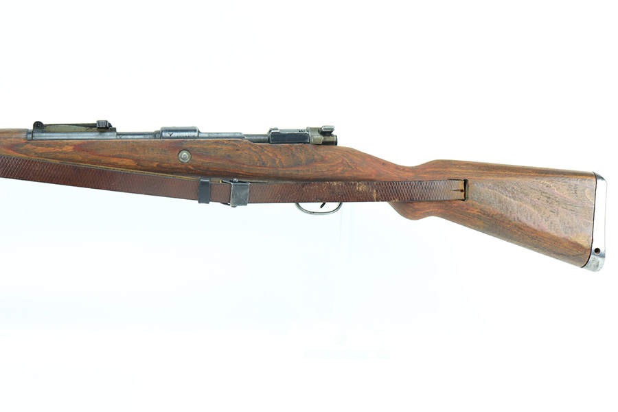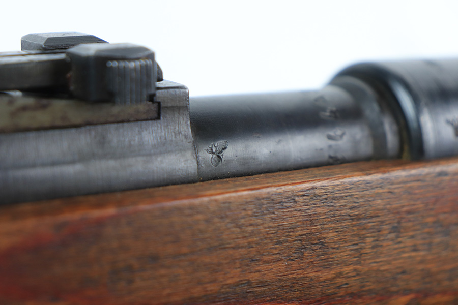 3/15/22 – This is a very nice example of a Mauser K98 Kriegsmodell issued to the Nazi military in 1945. It has typical late-war features for a Kriegsmodell such as no cleaning rod slot, no bayonet lug and no disassembly disc. It also has a rare “svw 45” Mauser makers mark on the receiver. The only numbered parts are the receiver and bolt assembly, which are mismatched. Comes with a period-correct leather sling. The floor plate/trigger assembly do not fit perfectly in the rifle – there is a small gap between the wood and metal. There is no visible numbering on the stock, but there are faint waffen proofs on the right side and underside of the butt stock. There are some light scratches on the receiver and barrel. The front barrel band, floor plate, and trigger assembly have almost no finish. The wood stock is very nice, but it looks like there were a couple of wood repairs and a repaired hairline crack around the wrist. The bore is mint.