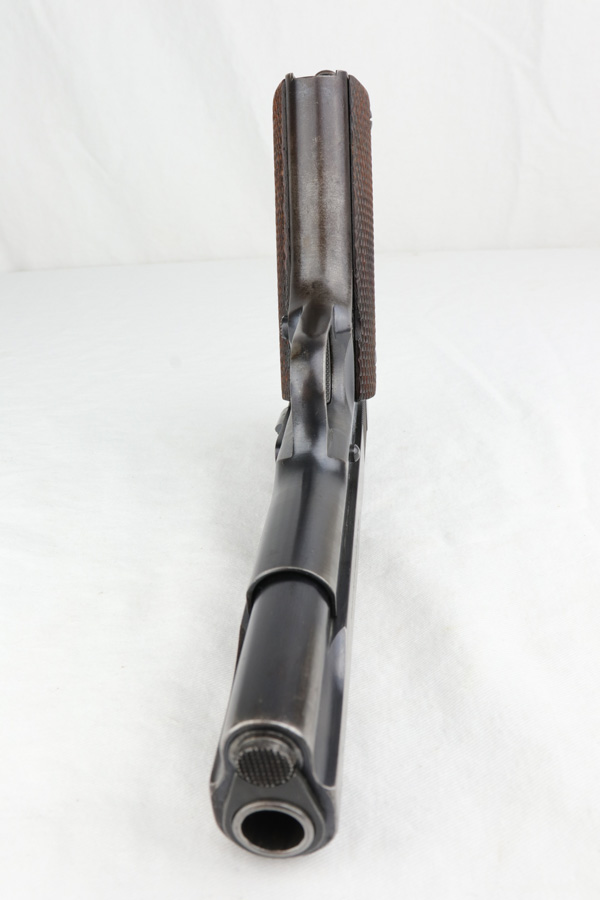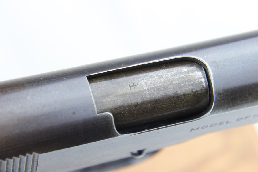 12/31/18 – This is a rare transitional Colt 1911 that was manufactured in 1924. Fewer than 10,000 Colt 1911s were made that year, and they are known to have transitional features from the 1911 to the 1911A1. This one is all original and correct with about 85-90% blue remaining. The most notable wear is on the front strap, with some thinning and edge wear on the slide. The pistol has solid checkered walnut grips and a type 5 Colt barrel (intertwined HP mark on top of barrel). WTG inspector logo. H and G proofs on top of frame. Very nice bore with no pitting or frost. Two-tone magazine.