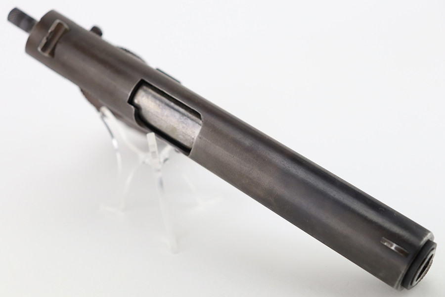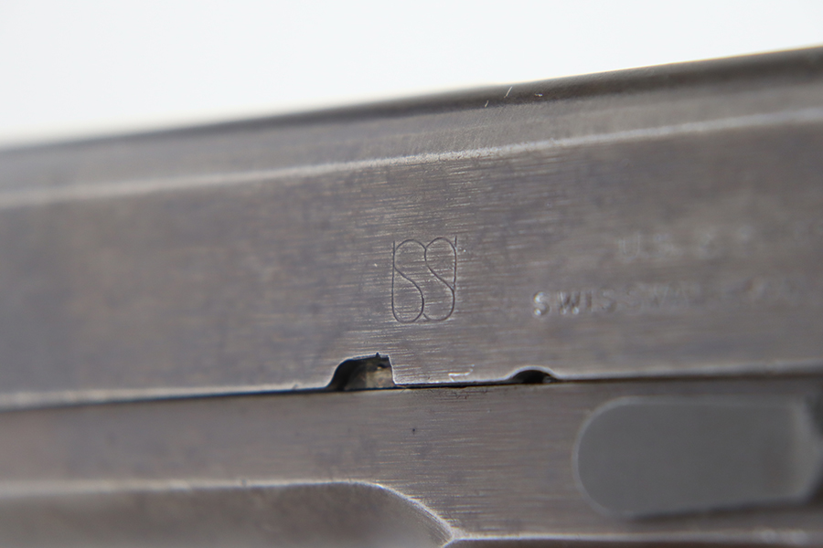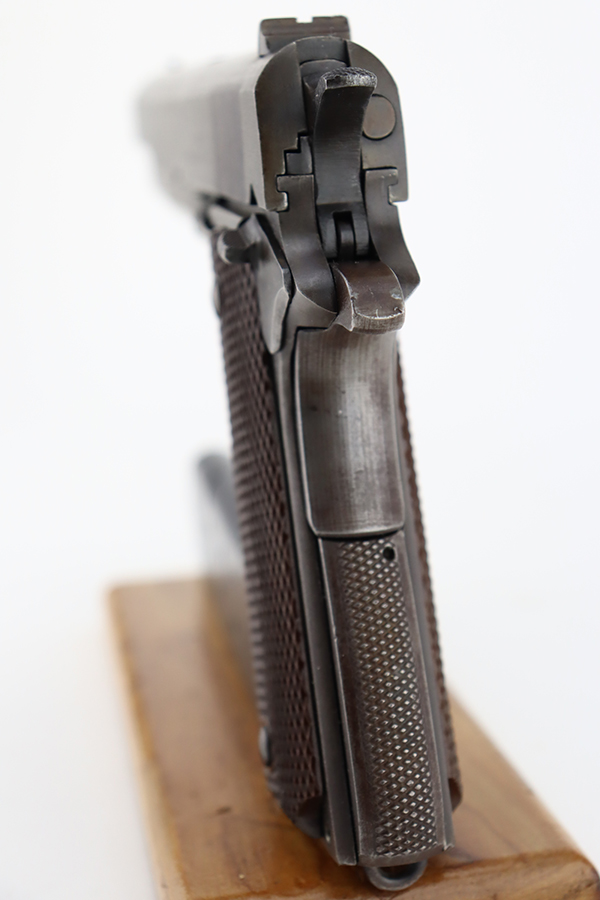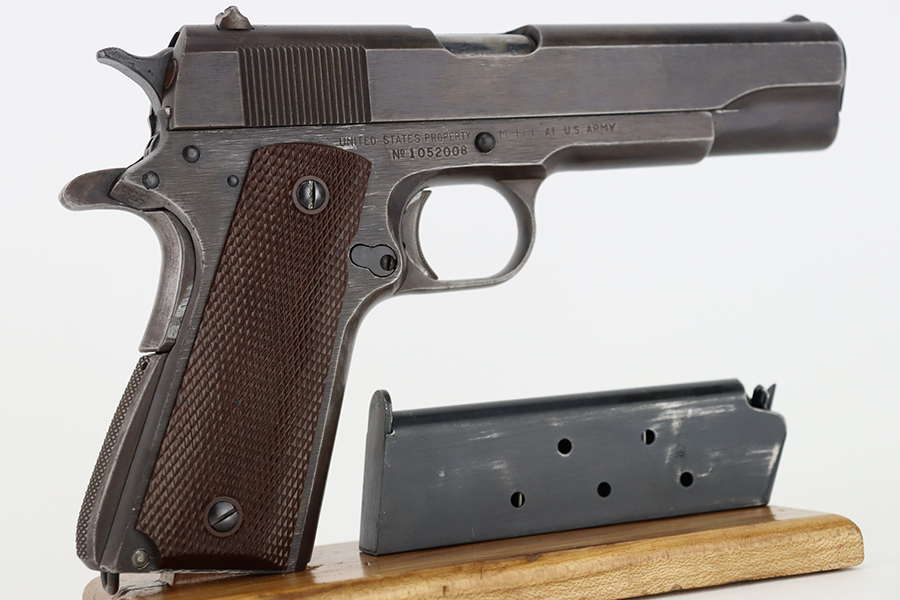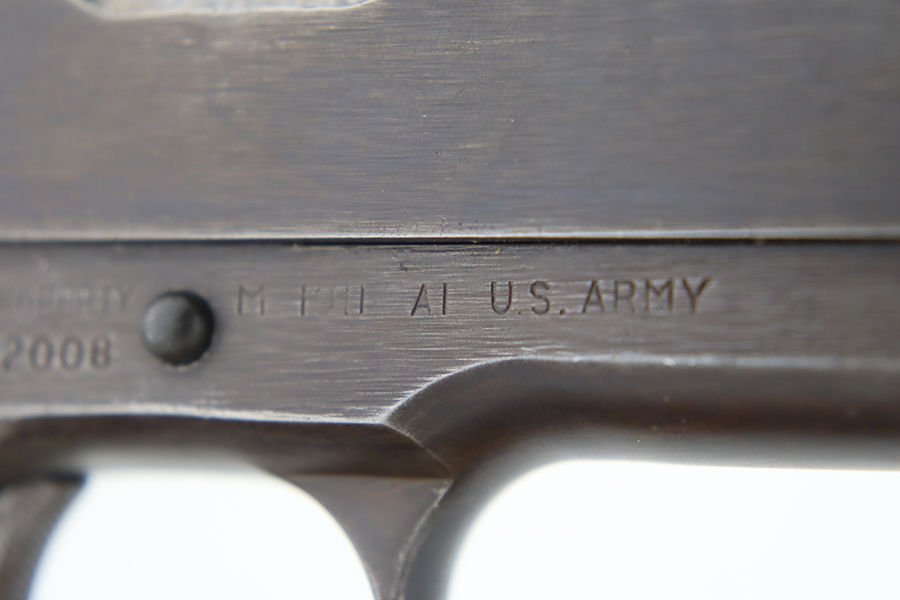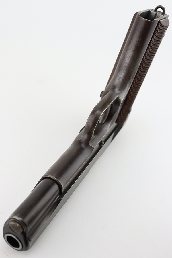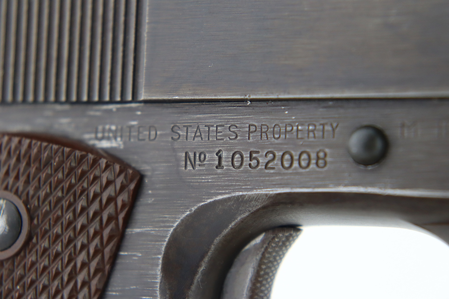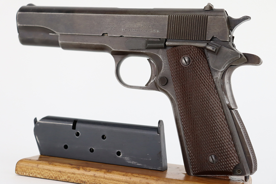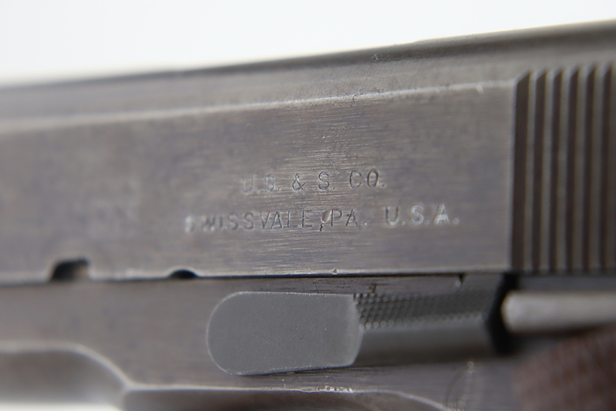 The Union Switch & Signal company of Swissvale Pennsylvania, primarily made railroad signaling equipment but received a contract on May 5, 1942 for the manufacture of M1911A1 pistols. The first pistols were accepted by Ordnance inspectors in January 1943, but the company received word that their contract would be canceled. Within a month U.S.&S. had signed a contract to supply carbine parts. On March 8, 1943 the company was officially notified that their contract had been cut back from 200,000 pistols to 30,000 pistols. However on June 26th, when the contract was nearly complete, and many of the workers had been transferred to Carbine operations, the company received a letter of intent to purchase an additional 25,000 pistols. The last of the pistols was shipped on November 27, 1943. 55,000 Union Switch and Signal pistols were delivered serial numbered from 1041405 to 1096404. U.S.&S. pistols are the second rarest of the M1911A1s (55,000 produced), only the Singer is rarer (500 produced). None of the Union Switch & Signal 1911A1s have the crossed cannons ordnance stamp. We are told these were issued to the Army Air Corps during the war.