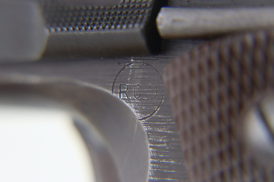 1/16/24 – This is a rare Union Switch & Signal made 1911A1 from 1943 in all original condition. The serial dates this pistol to May of that year.  It is all  correct with about 92-70-75% dulite finish remaining. The slide is nice overall but with some browning throughout.  The frame shows a good amount of thinning and finish loss, though.  Proper RCD inspector proof on frame. Concentric circles on the barrel bushing. HS marked barrel. ‘S’ marked magazine.  Excellent grips and bore.  No P proof on the exterior of slide or frame which is correct for the early 1.05 million serial range.