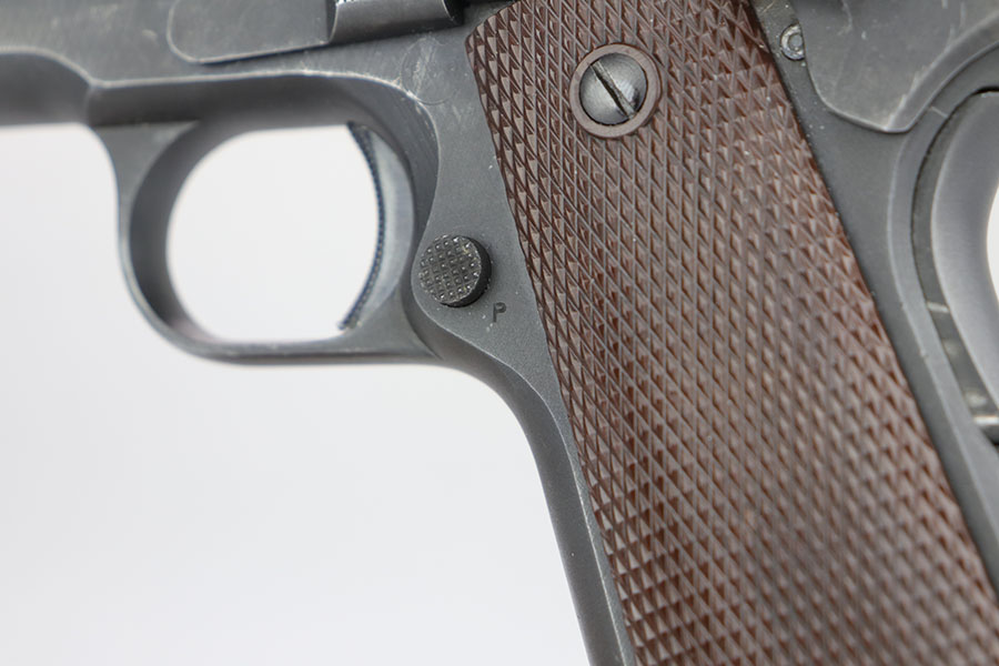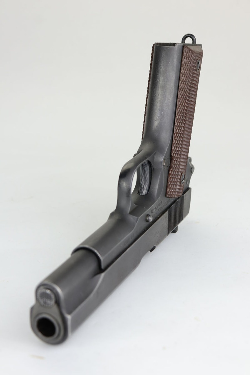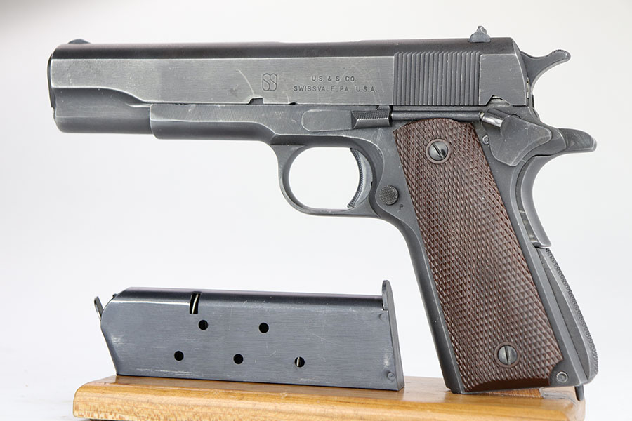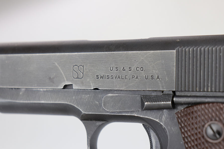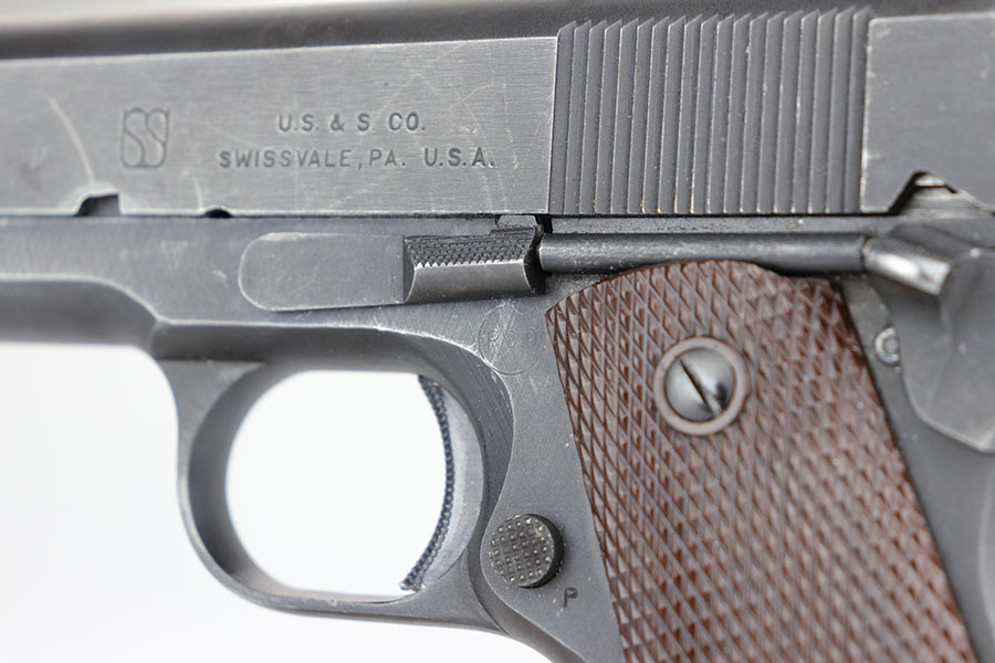 The Union Switch & Signal company of Swissvale Pennsylvania, primarily made railroad signaling equipment but received a contract on May 5, 1942 for the manufacture of M1911A1 pistols. The first pistols were accepted by Ordnance inspectors in January 1943, but the company received word that their contract would be canceled. Within a month U.S.&S. had signed a contract to supply carbine parts. On March 8, 1943 the company was officially notified that their contract had been cut back from 200,000 pistols to 30,000 pistols. However on June 26th, when the contract was nearly complete, and many of the workers had been transferred to Carbine operations, the company received a letter of intent to purchase an additional 25,000 pistols. The last of the pistols was shipped on November 27, 1943. 55,000 Union Switch and Signal pistols were delivered serial numbered from 1041405 to 1096404. U.S.&S. pistols are the second rarest of the M1911A1s (55,000 produced), only the Singer is rarer (500 produced). None of the Union Switch & Signal 1911A1s have the crossed cannons ordnance stamp. We are told these were issued to the Army Air Corps during the war.