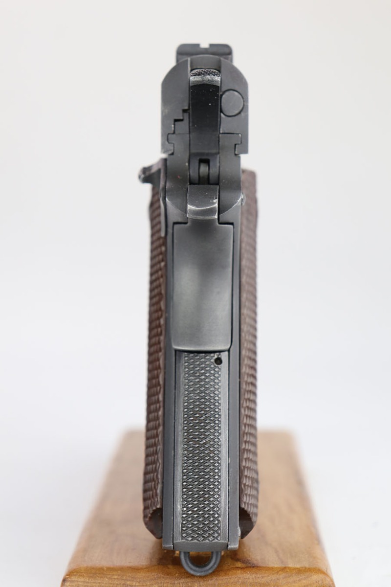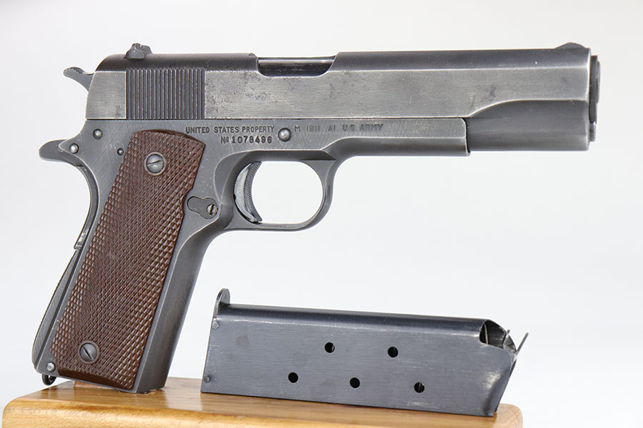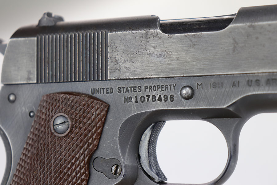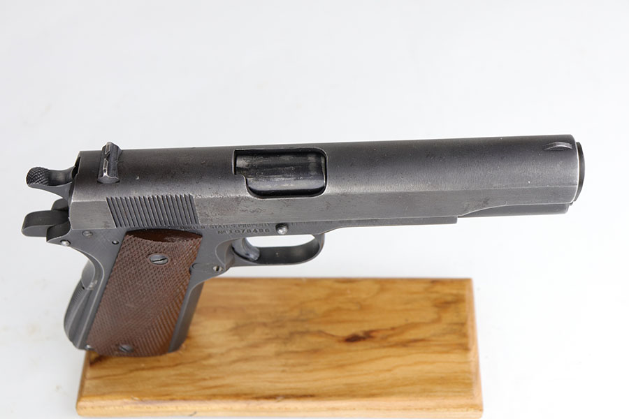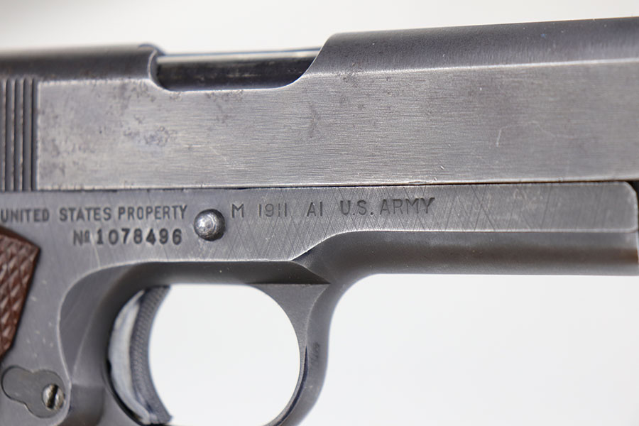 The Union Switch & Signal company of Swissvale Pennsylvania, primarily made railroad signaling equipment but received a contract on May 5, 1942 for the manufacture of M1911A1 pistols. The first pistols were accepted by Ordnance inspectors in January 1943, but the company received word that their contract would be canceled. Within a month U.S.&S. had signed a contract to supply carbine parts. On March 8, 1943 the company was officially notified that their contract had been cut back from 200,000 pistols to 30,000 pistols. However on June 26th, when the contract was nearly complete, and many of the workers had been transferred to Carbine operations, the company received a letter of intent to purchase an additional 25,000 pistols. The last of the pistols was shipped on November 27, 1943. 55,000 Union Switch and Signal pistols were delivered serial numbered from 1041405 to 1096404. U.S.&S. pistols are the second rarest of the M1911A1s (55,000 produced), only the Singer is rarer (500 produced). None of the Union Switch & Signal 1911A1s have the crossed cannons ordnance stamp. We are told these were issued to the Army Air Corps during the war.