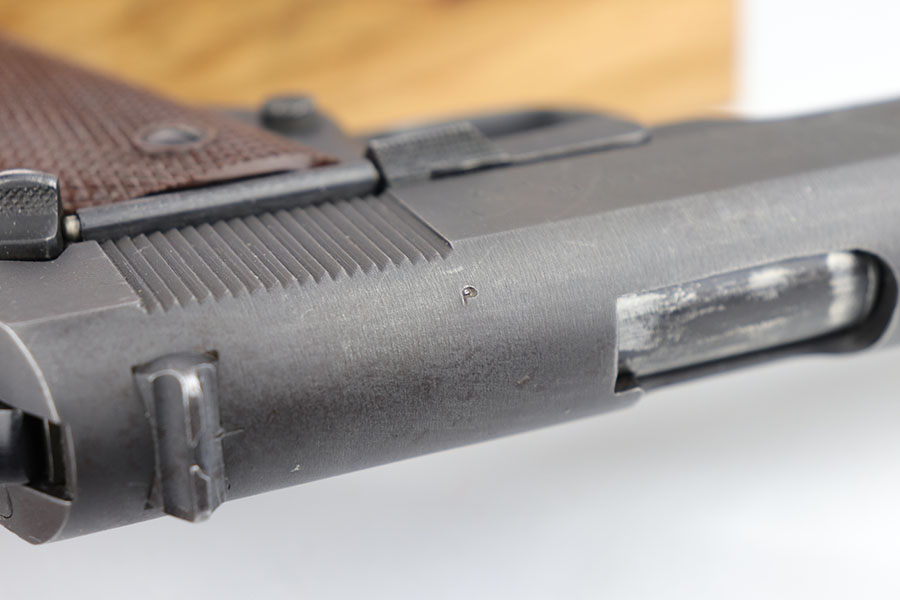4/16/20 – This is a rare Union Switch & Signal made 1911A1 from 1943 in very nice, original condition. The serial dates this pistol to August of that year. It is all original and correct with about 93-95% dulite finish remaining, though it’s a little tough to rate. There is some minor thinning on the front strap, and edge wear on the left side of the pistol. But, most of the actual finish loss comes from some general thinning on the right side of the slide, and there is also some surface freckling on that side. Sharp RCD inspector proof on frame. Concentric circles on the barrel bushing. HS marked barrel. ‘R’ marked magazine. Excellent grips and bore.