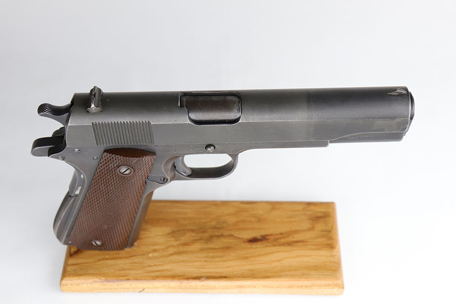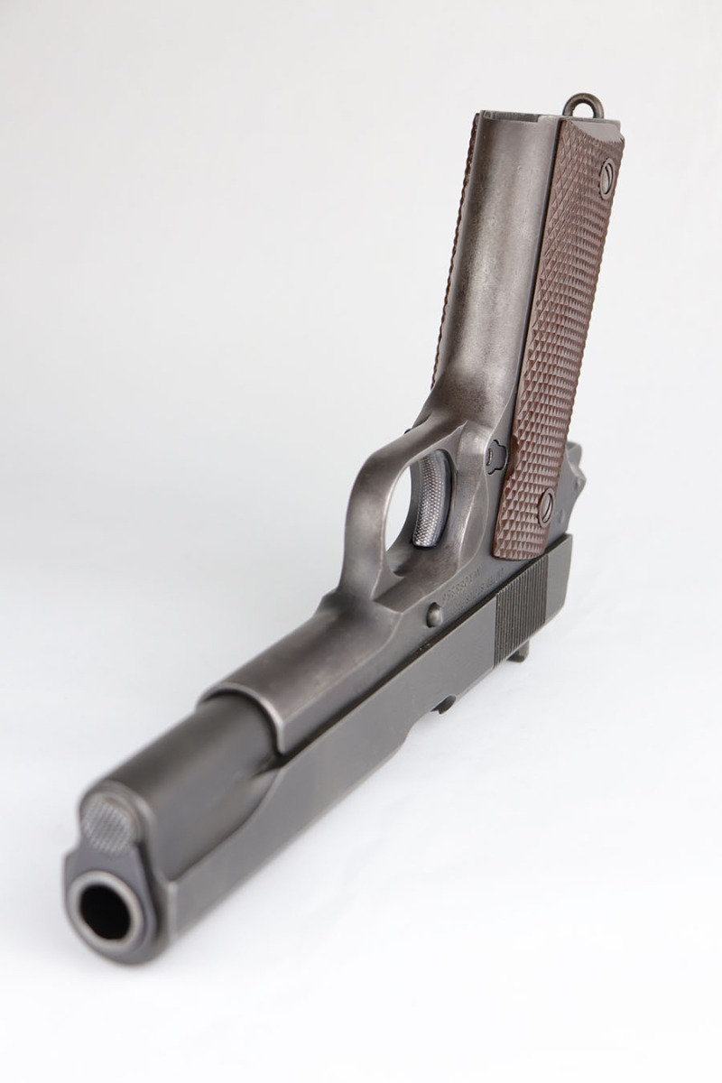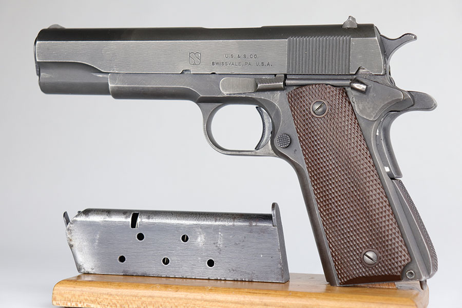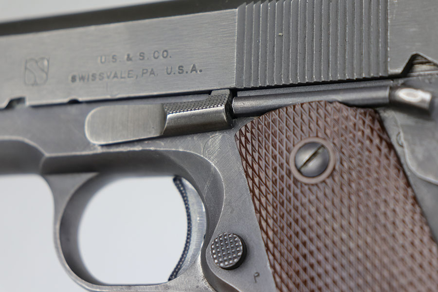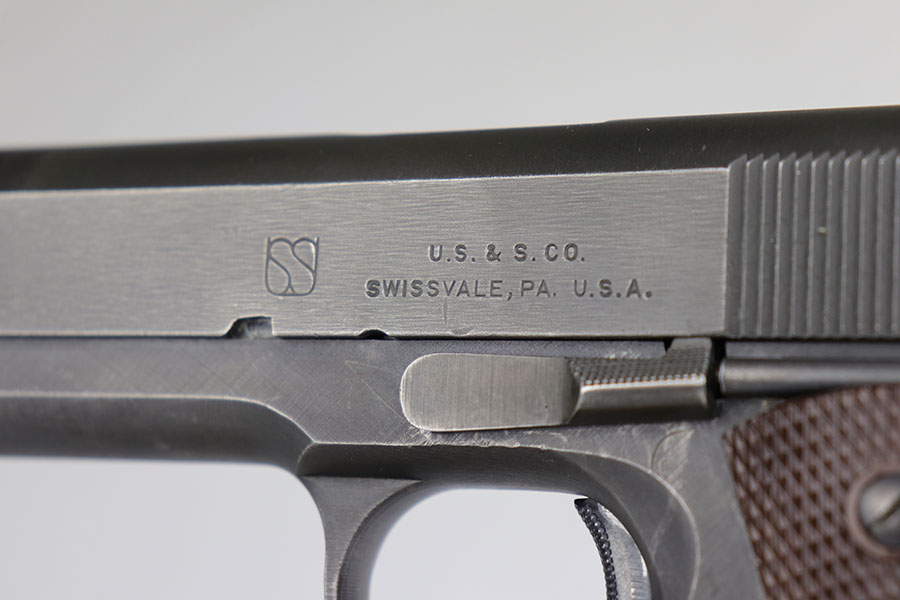 The Union Switch & Signal company of Swissvale Pennsylvania, primarily made railroad signaling equipment but received a contract on May 5, 1942 for the manufacture of M1911A1 pistols. The first pistols were accepted by Ordnance inspectors in January 1943, but the company received word that their contract would be canceled. Within a month U.S.&S. had signed a contract to supply carbine parts. On March 8, 1943 the company was officially notified that their contract had been cut back from 200,000 pistols to 30,000 pistols. However on June 26th, when the contract was nearly complete, and many of the workers had been transferred to Carbine operations, the company received a letter of intent to purchase an additional 25,000 pistols. The last of the pistols was shipped on November 27, 1943. 55,000 Union Switch and Signal pistols were delivered serial numbered from 1041405 to 1096404. U.S.&S. pistols are the second rarest of the M1911A1s (55,000 produced), only the Singer is rarer (500 produced). None of the Union Switch & Signal 1911A1s have the crossed cannons ordnance stamp. We are told these were issued to the Army Air Corps during the war.