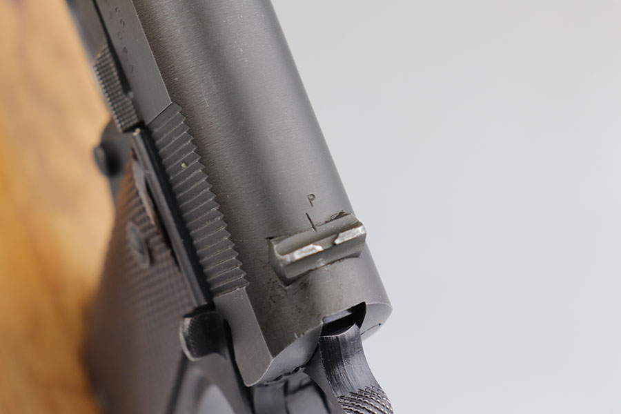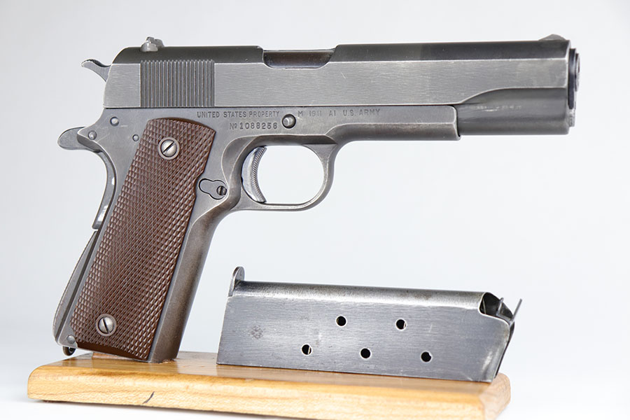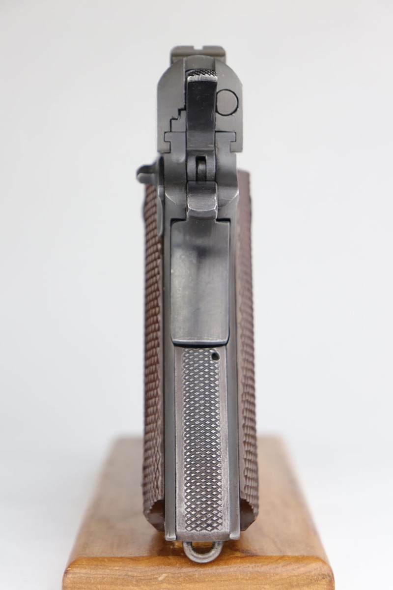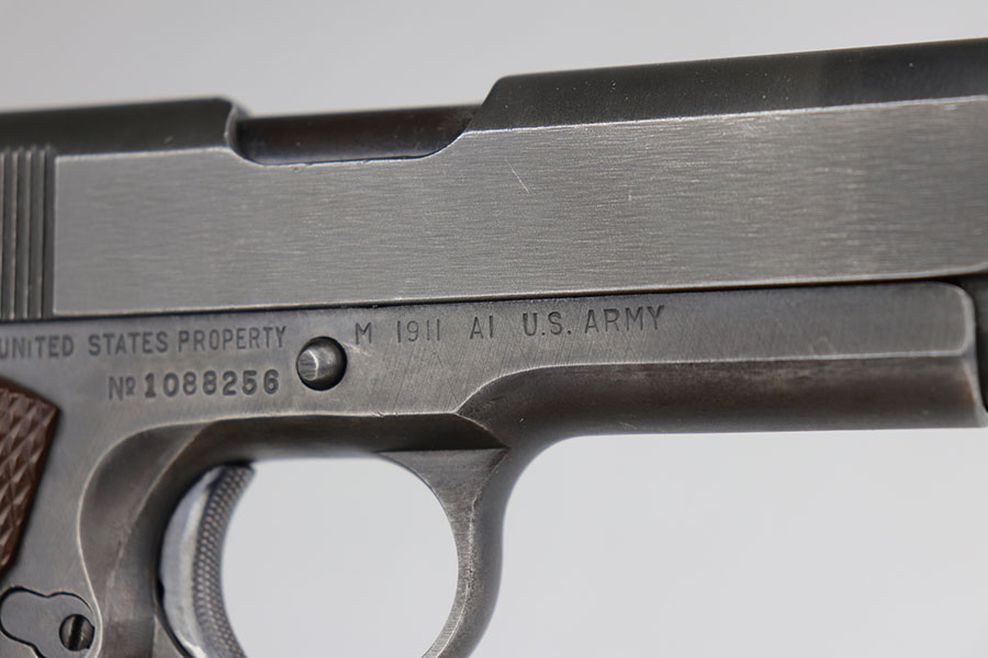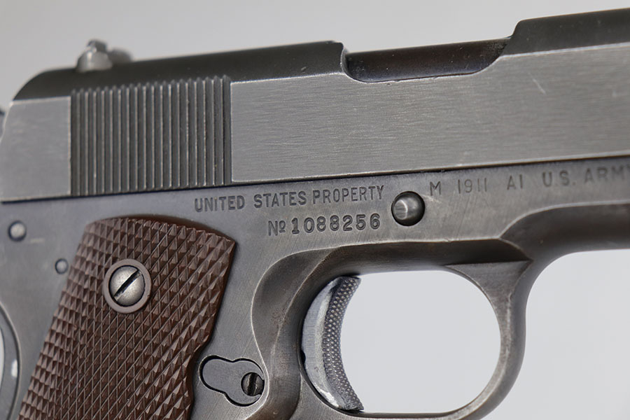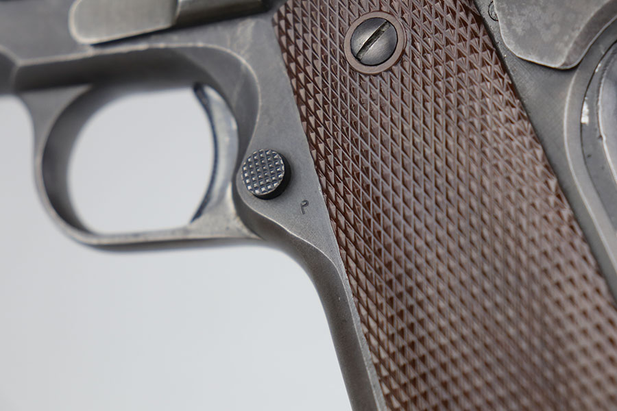 The Union Switch & Signal company of Swissvale Pennsylvania, primarily made railroad signaling equipment but received a contract on May 5, 1942 for the manufacture of M1911A1 pistols. The first pistols were accepted by Ordnance inspectors in January 1943, but the company received word that their contract would be canceled. Within a month U.S.&S. had signed a contract to supply carbine parts. On March 8, 1943 the company was officially notified that their contract had been cut back from 200,000 pistols to 30,000 pistols. However on June 26th, when the contract was nearly complete, and many of the workers had been transferred to Carbine operations, the company received a letter of intent to purchase an additional 25,000 pistols. The last of the pistols was shipped on November 27, 1943. 55,000 Union Switch and Signal pistols were delivered serial numbered from 1041405 to 1096404. U.S.&S. pistols are the second rarest of the M1911A1s (55,000 produced), only the Singer is rarer (500 produced). None of the Union Switch & Signal 1911A1s have the crossed cannons ordnance stamp. We are told these were issued to the Army Air Corps during the war.