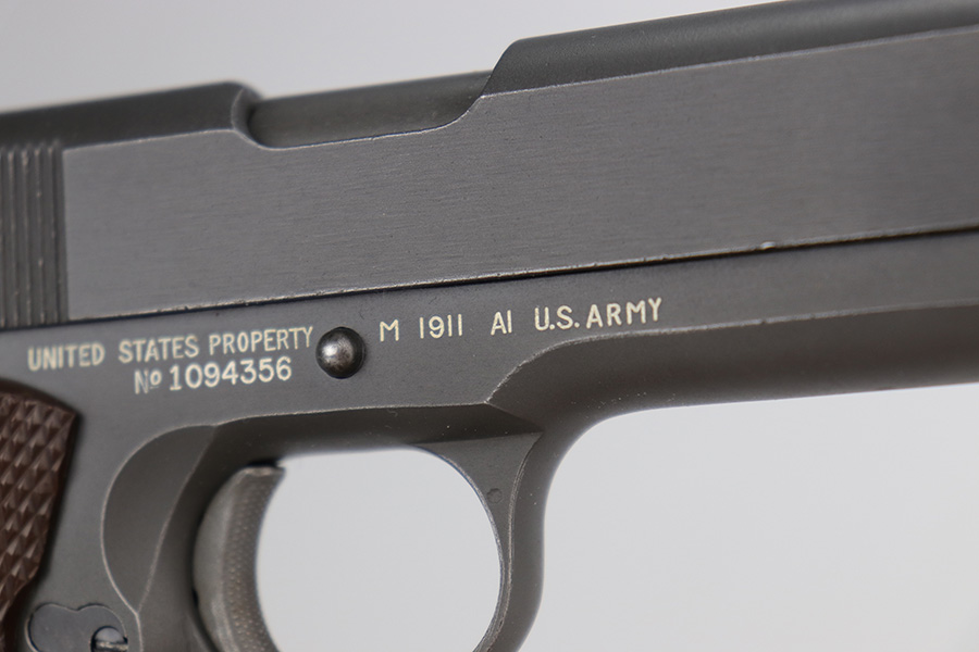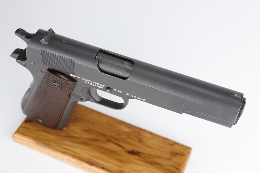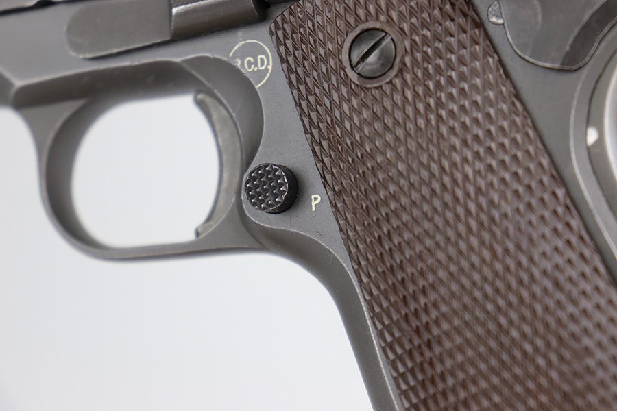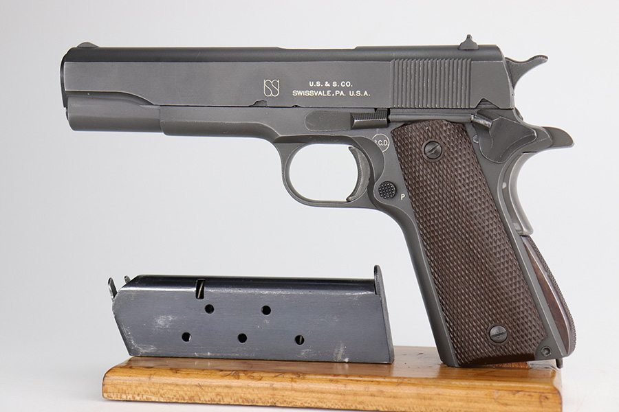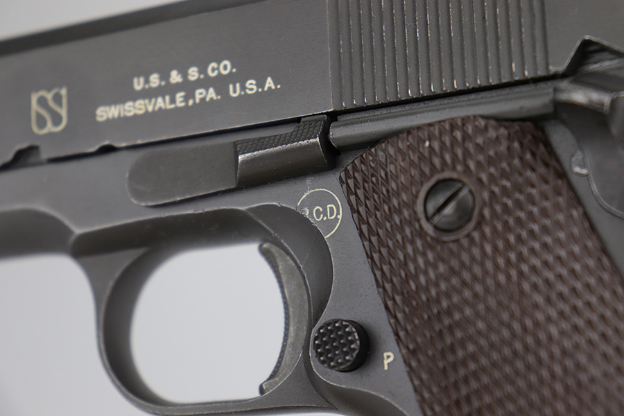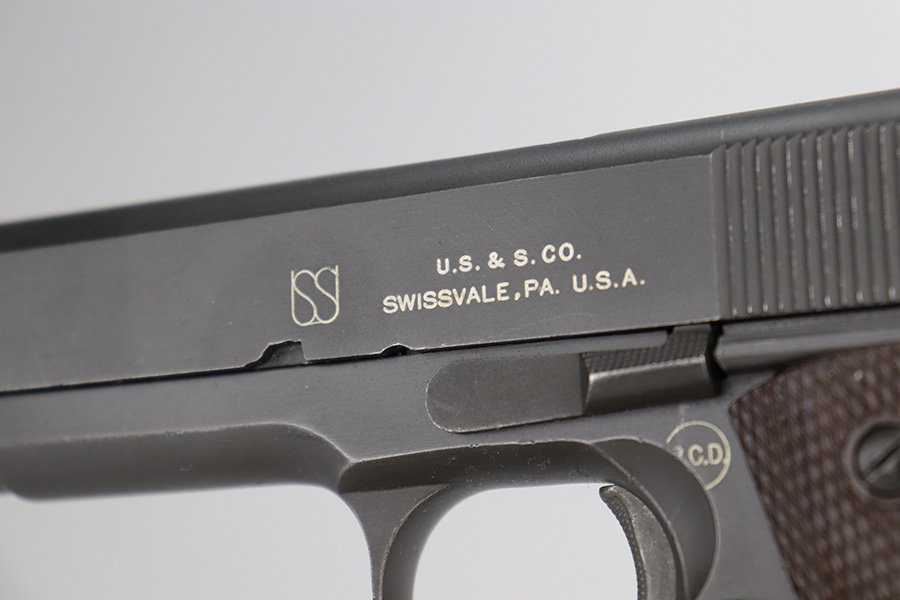 The Union Switch & Signal company of Swissvale Pennsylvania, primarily made railroad signaling equipment but received a contract on May 5, 1942 for the manufacture of M1911A1 pistols. The first pistols were accepted by Ordnance inspectors in January 1943, but the company received word that their contract would be canceled. Within a month U.S.&S. had signed a contract to supply carbine parts. On March 8, 1943 the company was officially notified that their contract had been cut back from 200,000 pistols to 30,000 pistols. However on June 26th, when the contract was nearly complete, and many of the workers had been transferred to Carbine operations, the company received a letter of intent to purchase an additional 25,000 pistols. The last of the pistols was shipped on November 27, 1943. 55,000 Union Switch and Signal pistols were delivered serial numbered from 1041405 to 1096404. U.S.&S. pistols are the second rarest of the M1911A1s (55,000 produced), only the Singer is rarer (500 produced). None of the Union Switch & Signal 1911A1s have the crossed cannons ordnance stamp. We are told these were issued to the Army Air Corps during the war.