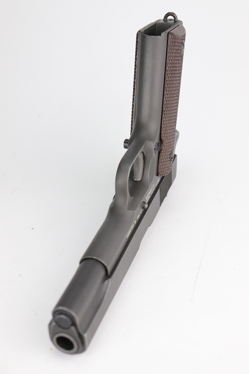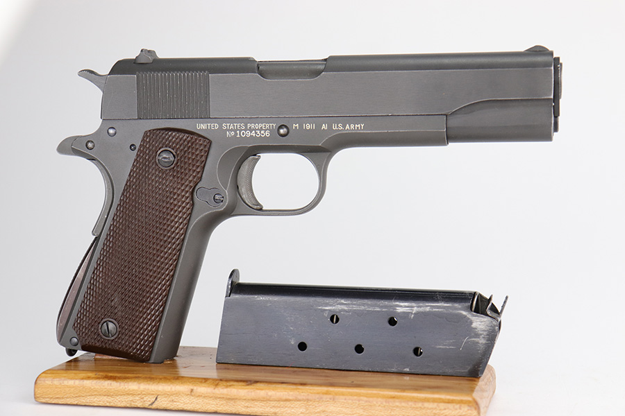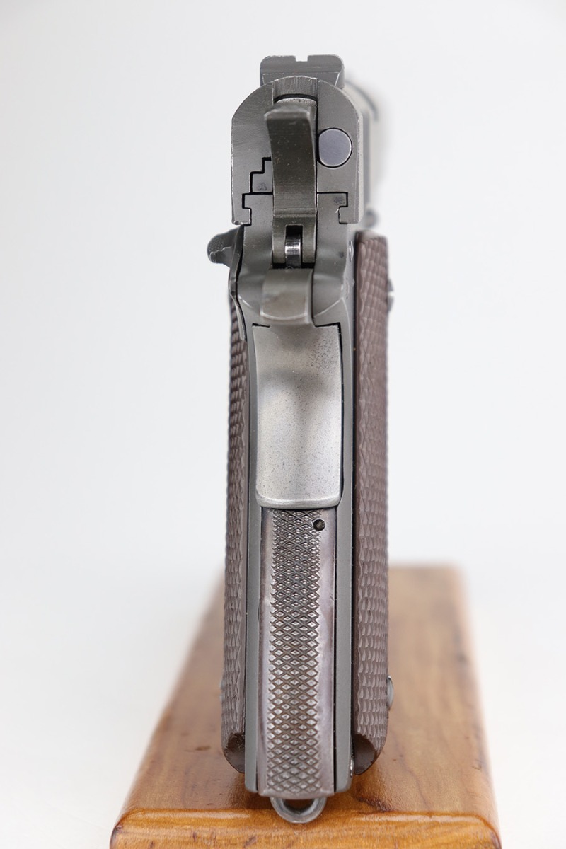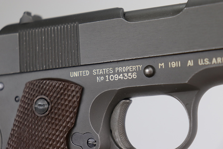 The Union Switch & Signal company of Swissvale Pennsylvania, primarily made railroad signaling equipment but received a contract on May 5, 1942 for the manufacture of M1911A1 pistols. The first pistols were accepted by Ordnance inspectors in January 1943, but the company received word that their contract would be canceled. Within a month U.S.&S. had signed a contract to supply carbine parts. On March 8, 1943 the company was officially notified that their contract had been cut back from 200,000 pistols to 30,000 pistols. However on June 26th, when the contract was nearly complete, and many of the workers had been transferred to Carbine operations, the company received a letter of intent to purchase an additional 25,000 pistols. The last of the pistols was shipped on November 27, 1943. 55,000 Union Switch and Signal pistols were delivered serial numbered from 1041405 to 1096404. U.S.&S. pistols are the second rarest of the M1911A1s (55,000 produced), only the Singer is rarer (500 produced). None of the Union Switch & Signal 1911A1s have the crossed cannons ordnance stamp. We are told these were issued to the Army Air Corps during the war.