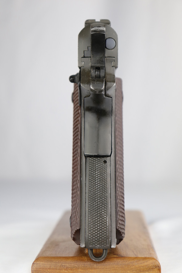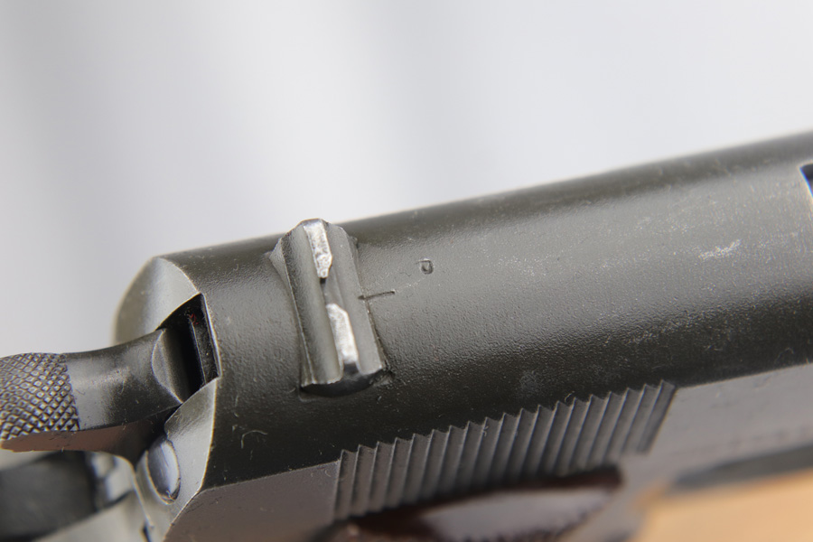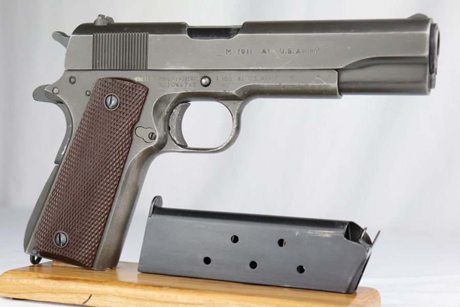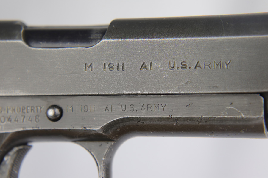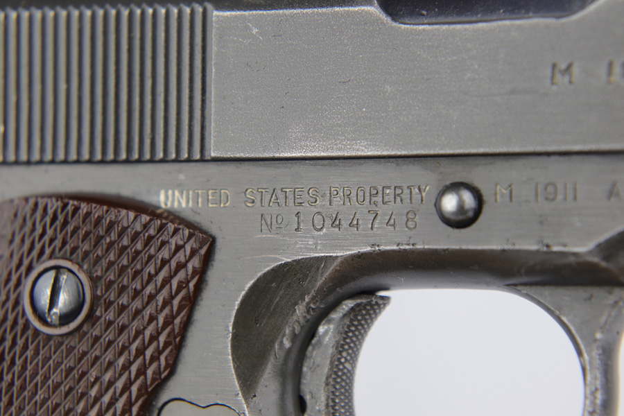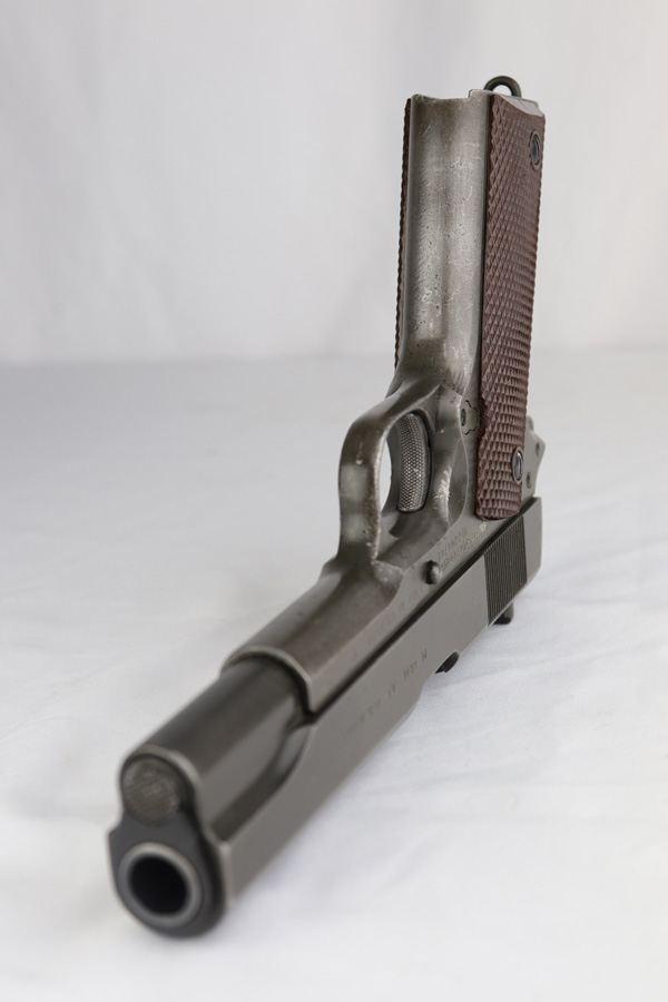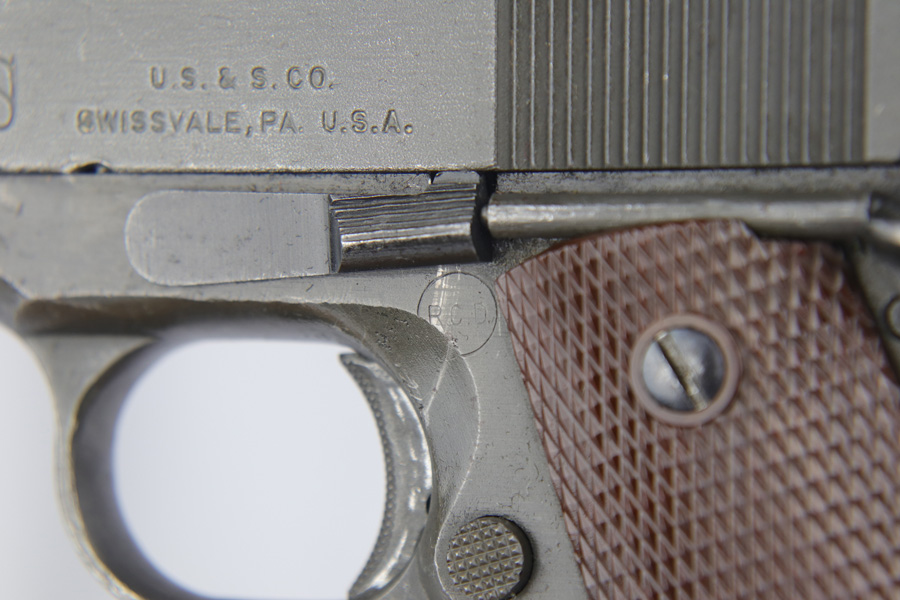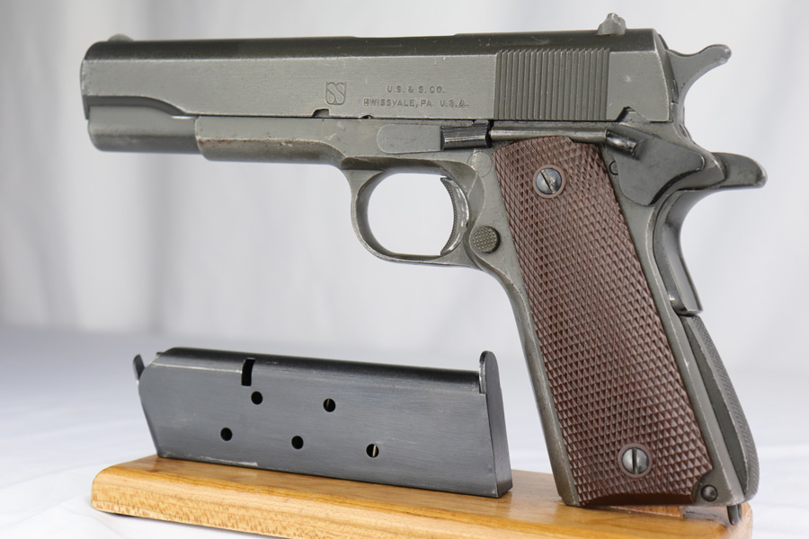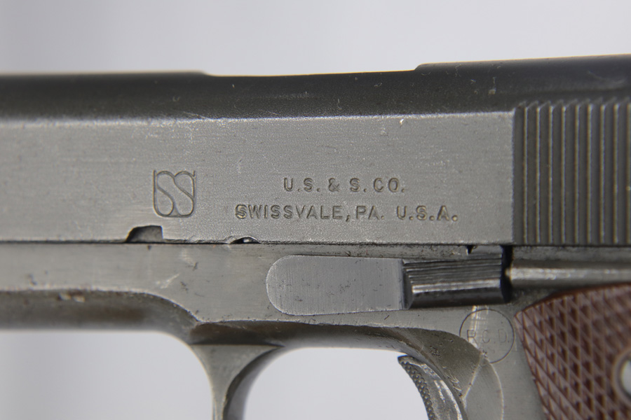 The Union Switch & Signal company of Swissvale Pennsylvania, primarily made railroad signaling equipment but received a contract on May 5, 1942 for the manufacture of M1911A1 pistols. The first pistols were accepted by Ordnance inspectors in January 1943, but the company received word that their contract would be canceled. Within a month U.S.&S. had signed a contract to supply carbine parts. On March 8, 1943 the company was officially notified that their contract had been cut back from 200,000 pistols to 30,000 pistols. However on June 26th, when the contract was nearly complete, and many of the workers had been transferred to Carbine operations, the company received a letter of intent to purchase an additional 25,000 pistols. The last of the pistols was shipped on November 27, 1943. 55,000 Union Switch and Signal pistols were delivered serial numbered from 1041405 to 1096404. U.S.&S. pistols are the second rarest of the M1911A1s (55,000 produced), only the Singer is rarer (500 produced). None of the Union Switch & Signal 1911A1s have the crossed cannons ordnance stamp. We are told these were issued to the Army Air Corps during the war.
