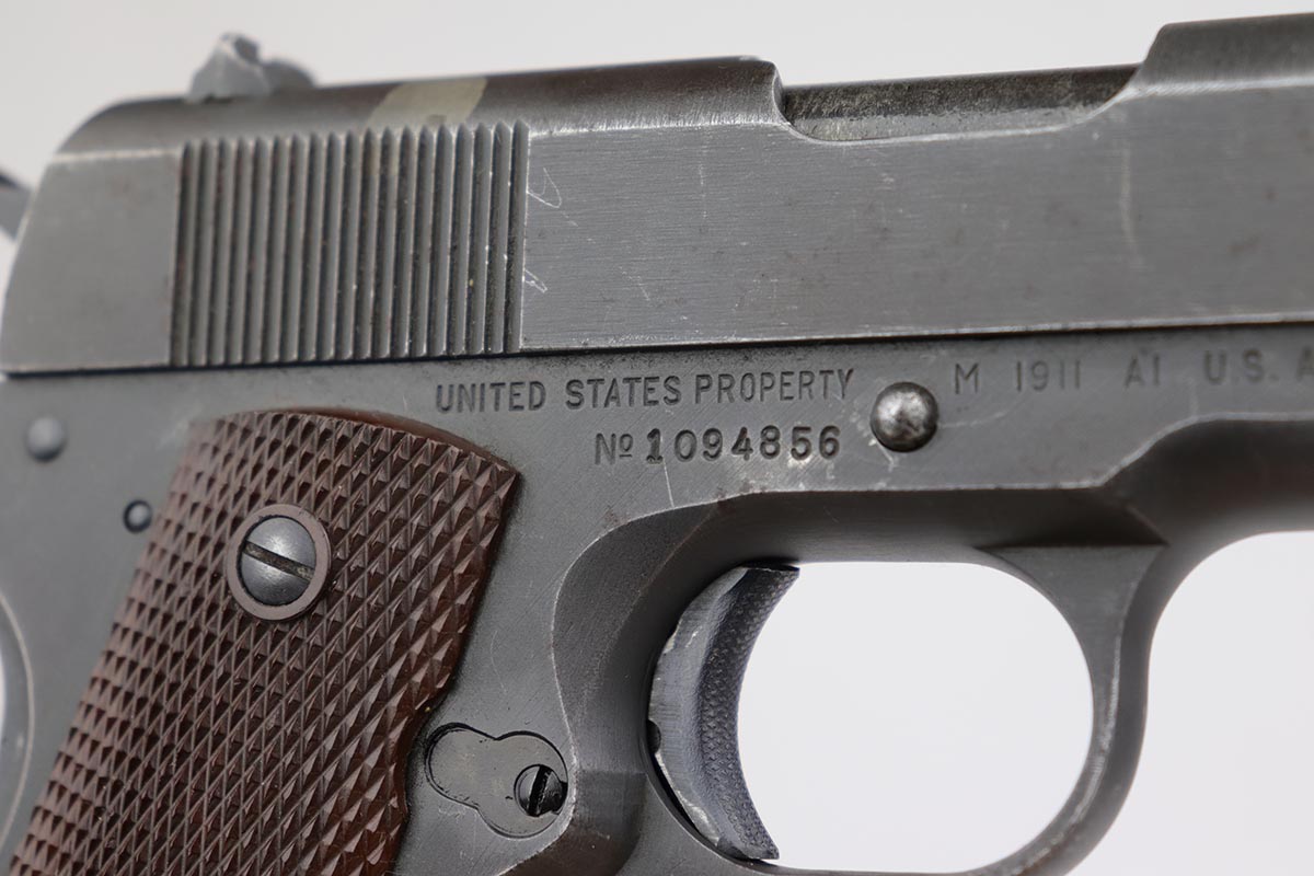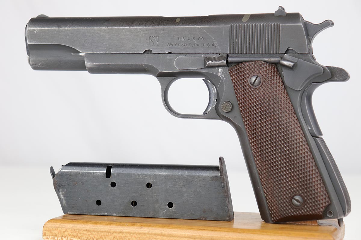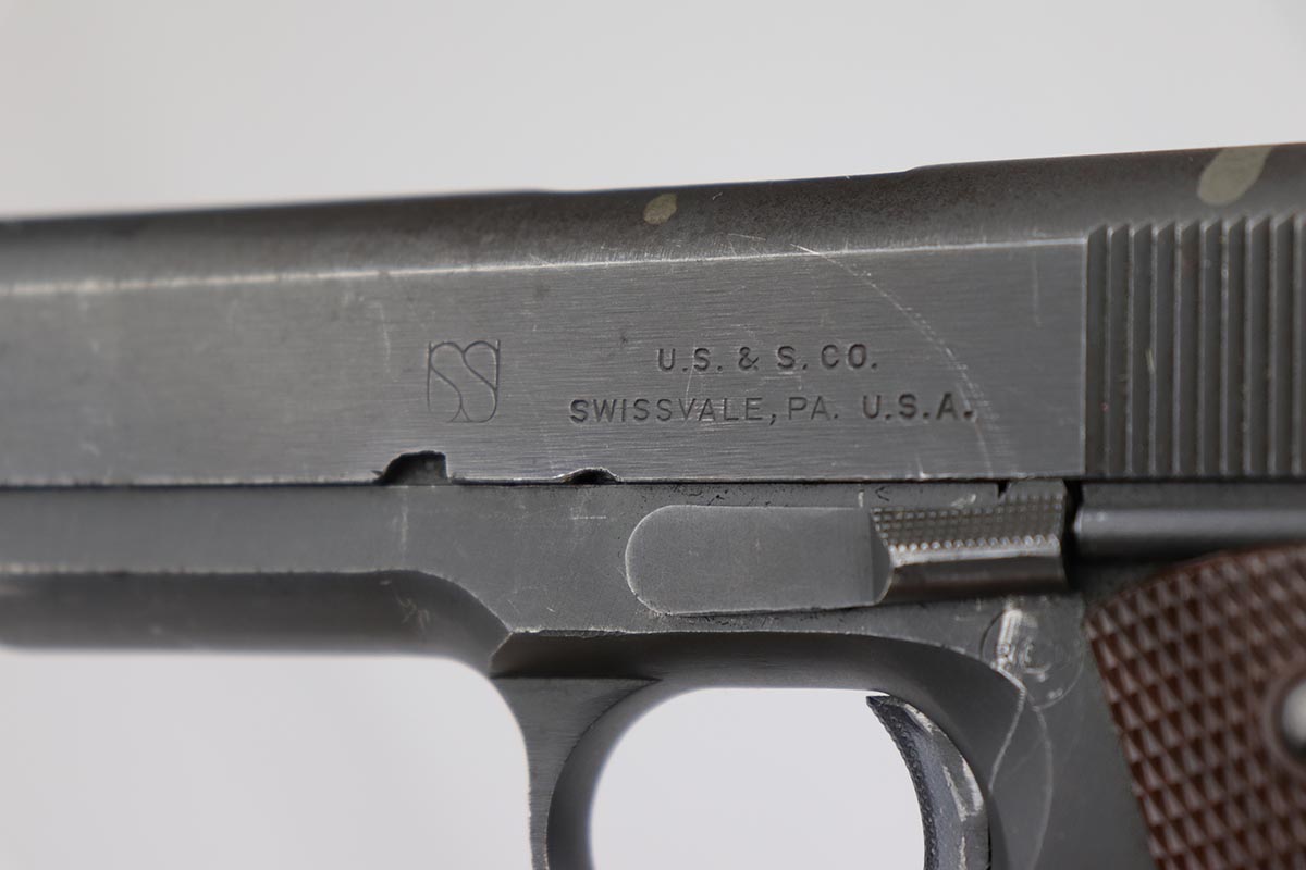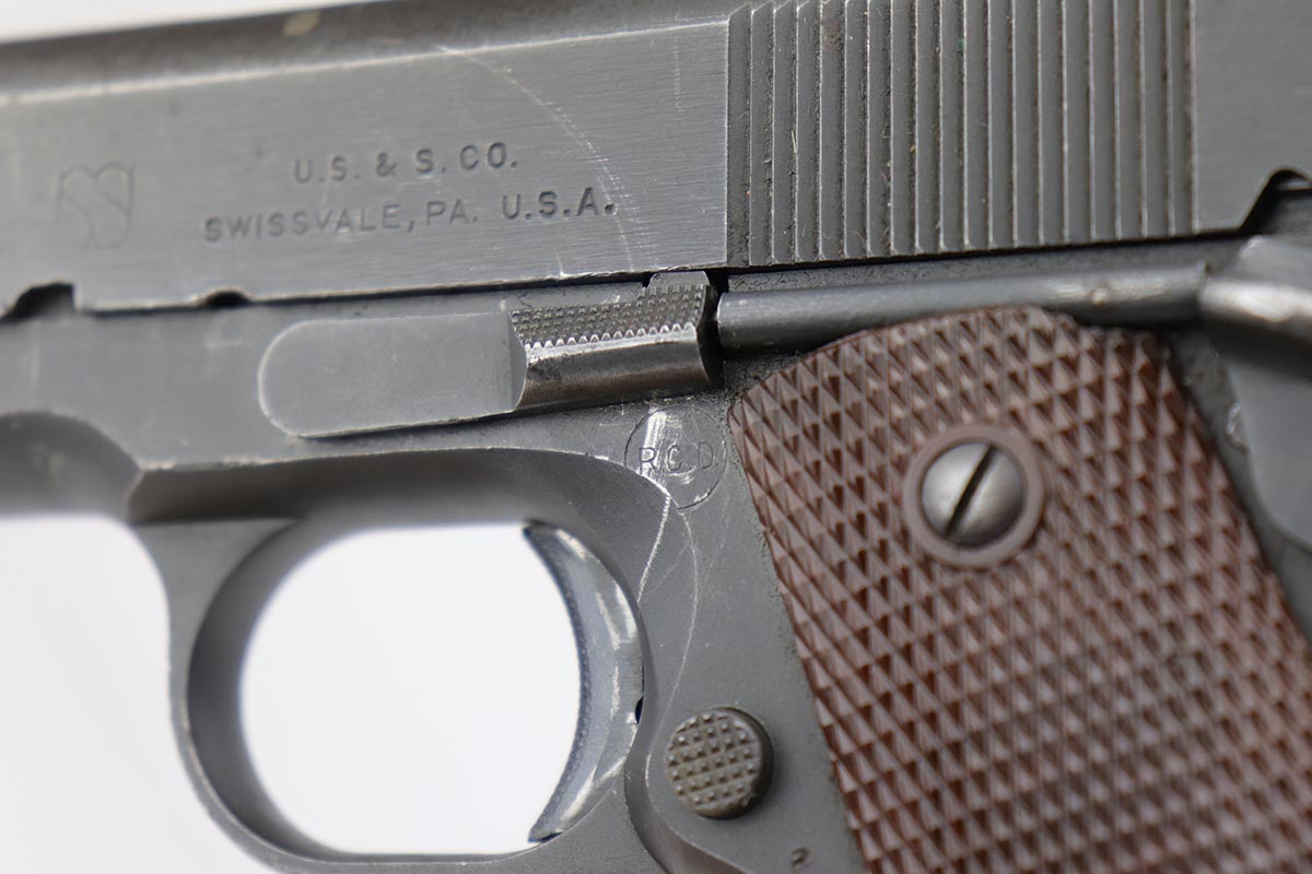The Union Switch & Signal company of Swissvale Pennsylvania, primarily made railroad signaling equipment but received a contract on May 5, 1942 for the manufacture of M1911A1 pistols. The first pistols were accepted by Ordnance inspectors in January 1943, but the company received word that their contract would be canceled. Within a month U.S.&S. had signed a contract to supply carbine parts. On March 8, 1943 the company was officially notified that their contract had been cut back from 200,000 pistols to 30,000 pistols. However on June 26th, when the contract was nearly complete, and many of the workers had been transferred to Carbine operations, the company received a letter of intent to purchase an additional 25,000 pistols. The last of the pistols was shipped on November 27, 1943. 55,000 Union Switch and Signal pistols were delivered serial numbered from 1041405 to 1096404. U.S.&S. pistols are the second rarest of the M1911A1s (55,000 produced), only the Singer is rarer (500 produced). None of the Union Switch & Signal 1911A1s have the crossed cannons ordnance stamp. We are told these were issued to the Army Air Corps during the war.