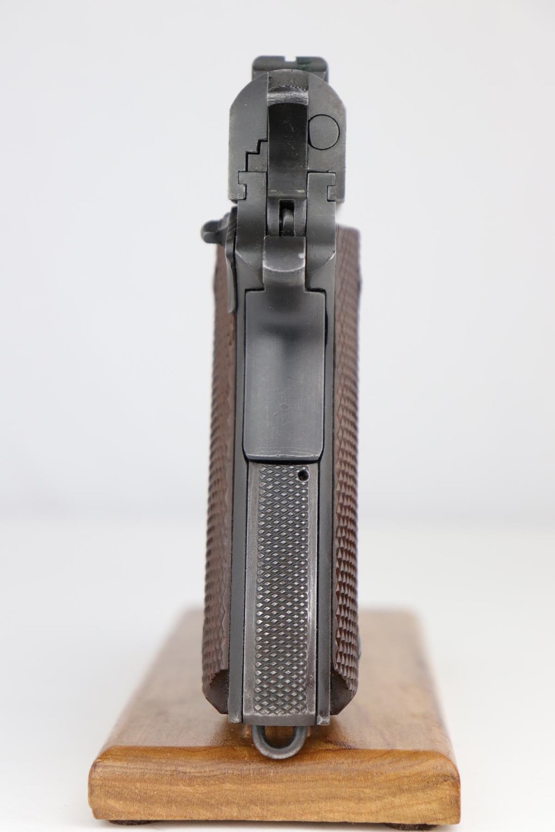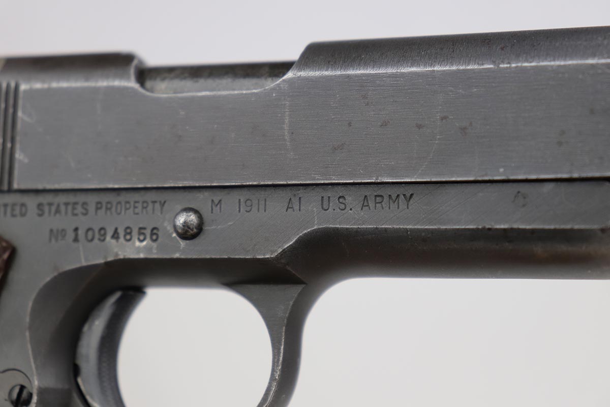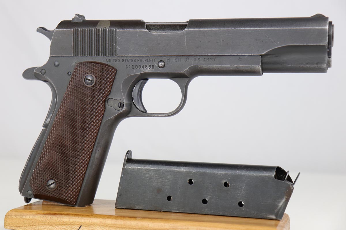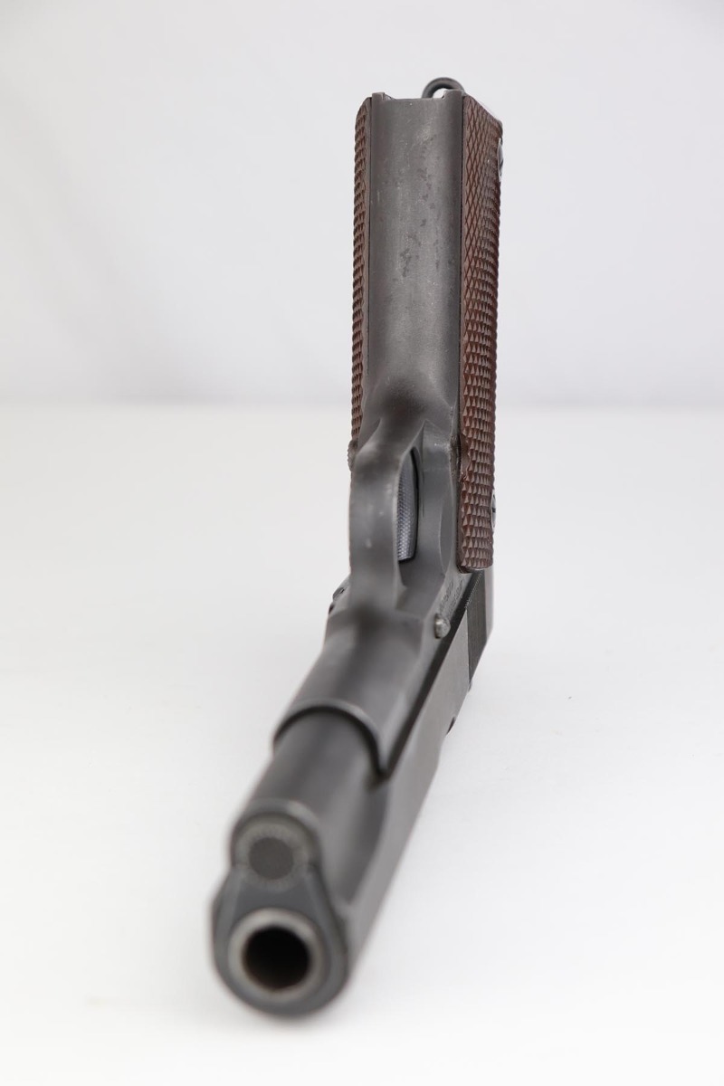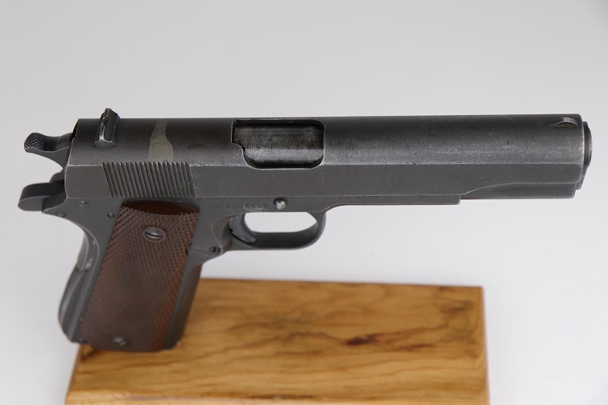 The Union Switch & Signal company of Swissvale Pennsylvania, primarily made railroad signaling equipment but received a contract on May 5, 1942 for the manufacture of M1911A1 pistols. The first pistols were accepted by Ordnance inspectors in January 1943, but the company received word that their contract would be canceled. Within a month U.S.&S. had signed a contract to supply carbine parts. On March 8, 1943 the company was officially notified that their contract had been cut back from 200,000 pistols to 30,000 pistols. However on June 26th, when the contract was nearly complete, and many of the workers had been transferred to Carbine operations, the company received a letter of intent to purchase an additional 25,000 pistols. The last of the pistols was shipped on November 27, 1943. 55,000 Union Switch and Signal pistols were delivered serial numbered from 1041405 to 1096404. U.S.&S. pistols are the second rarest of the M1911A1s (55,000 produced), only the Singer is rarer (500 produced). None of the Union Switch & Signal 1911A1s have the crossed cannons ordnance stamp. We are told these were issued to the Army Air Corps during the war.