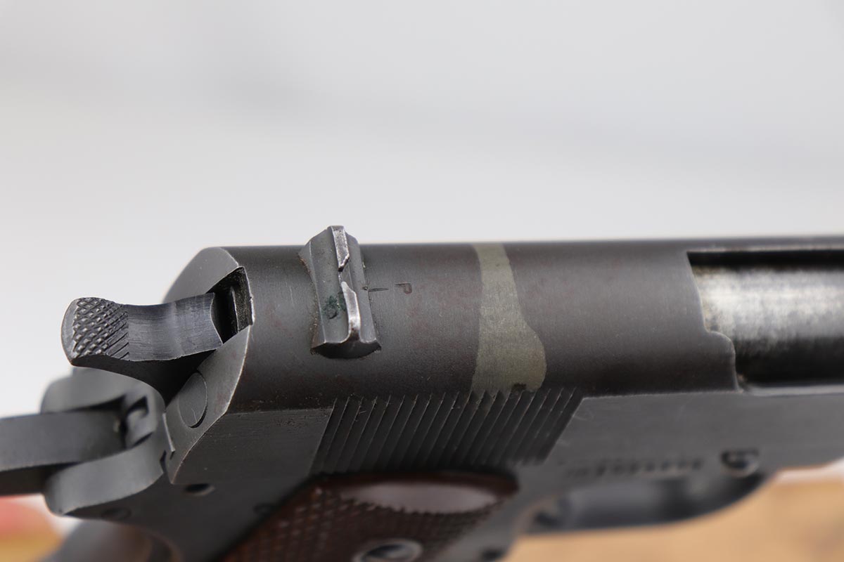5/9/19 – This is a rare Union Switch & Signal made 1911A1 from 1943 in very good, original condition. The serial dates this pistol to October of that year, which is very late in the production period, and part of the final shipment of these pistols. It is all original and correct with about 92-93% dulite finish remaining. The slide is very nice overall but there are two areas along the top that show finish loss and appear as if some type of liquid got on the slide.  Otherwise, there is standard edge and high point thinning.  Proper proof marks include P on slide and RCD inspector proof on frame. Concentric circles on the barrel bushing. HS marked barrel. ‘R’ marked magazine.  Excellent grips.  Unfortunately the bore on this one wasn’t well cared for, as there is notable freckling throughout.