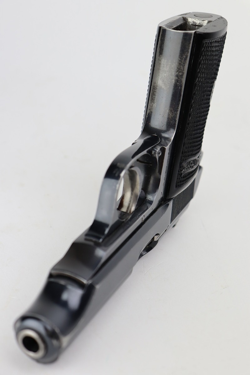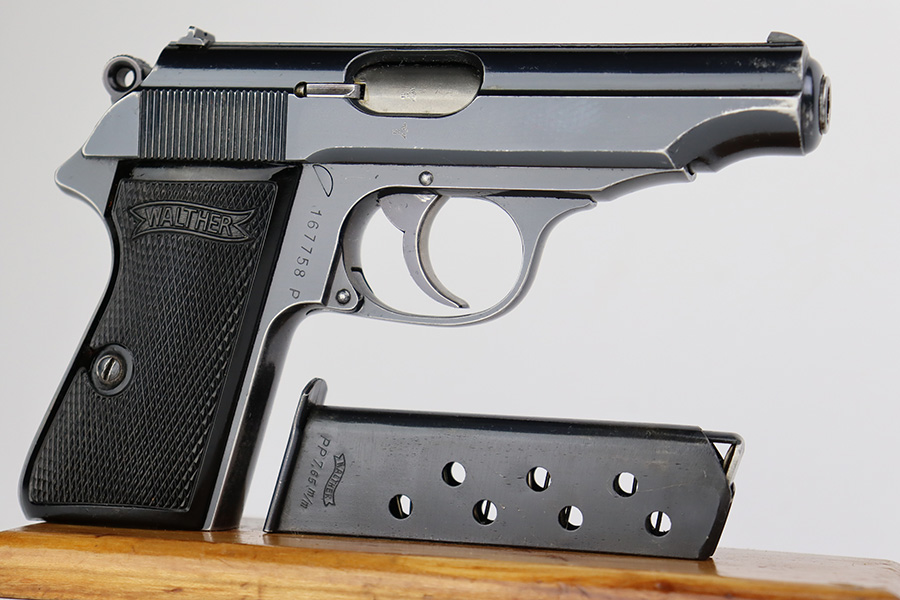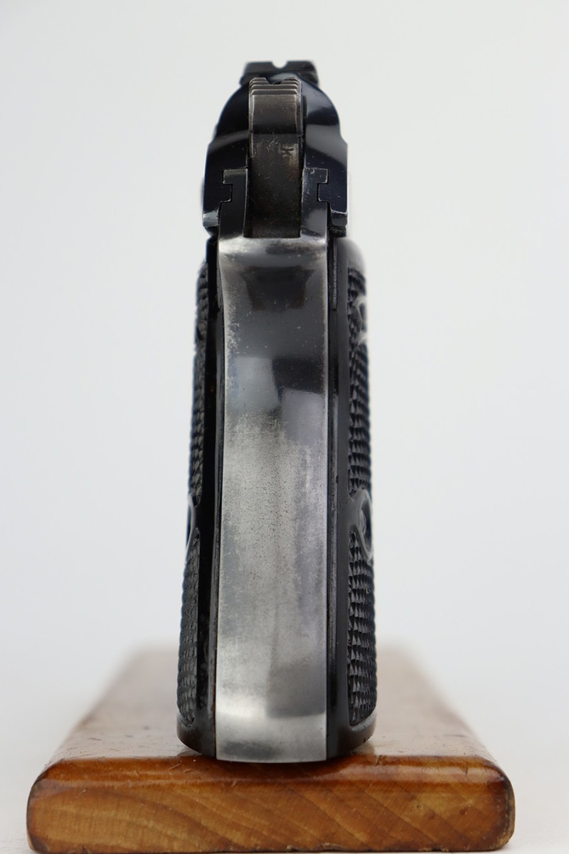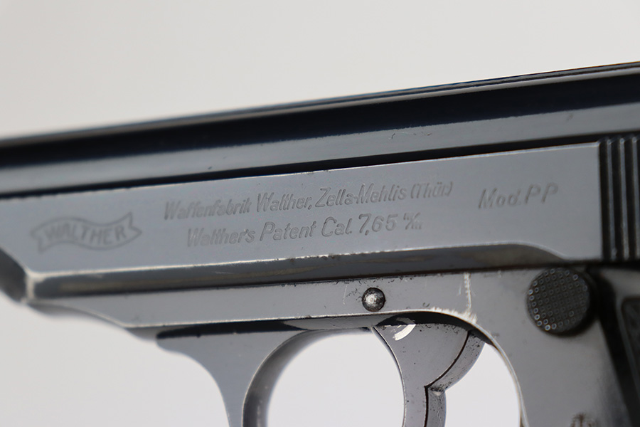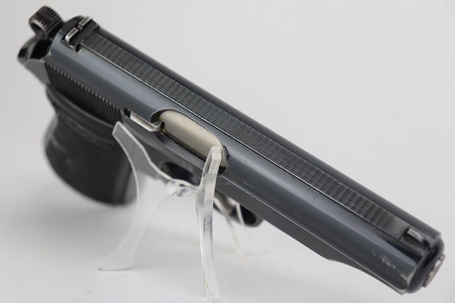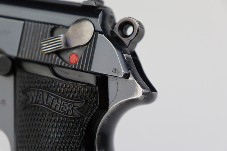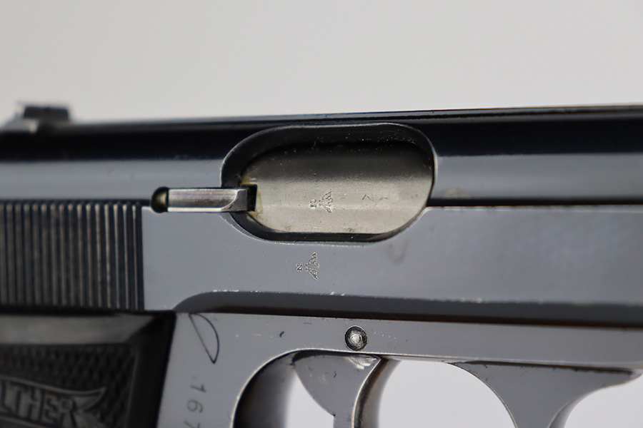 6/27/23 – This is a nice example of an early first-variation Walther PP issued to the Nazi military in 1940. The gun is all matching and has the proper “Eagle N” proofs. As a first-variation, this one also has the proper “Eagle 359” military acceptance proofs on the frame and on the left side of the slide near the tang. The gun has retained somewhere roughly 75-80% of its original high polish bluing. The significant majority of finish loss is on the grip straps, but there is also minor muzzle wear. Fitted with excellent period-correct black bakelite grips and comes with one wartime magazine. Stone-mint bore.