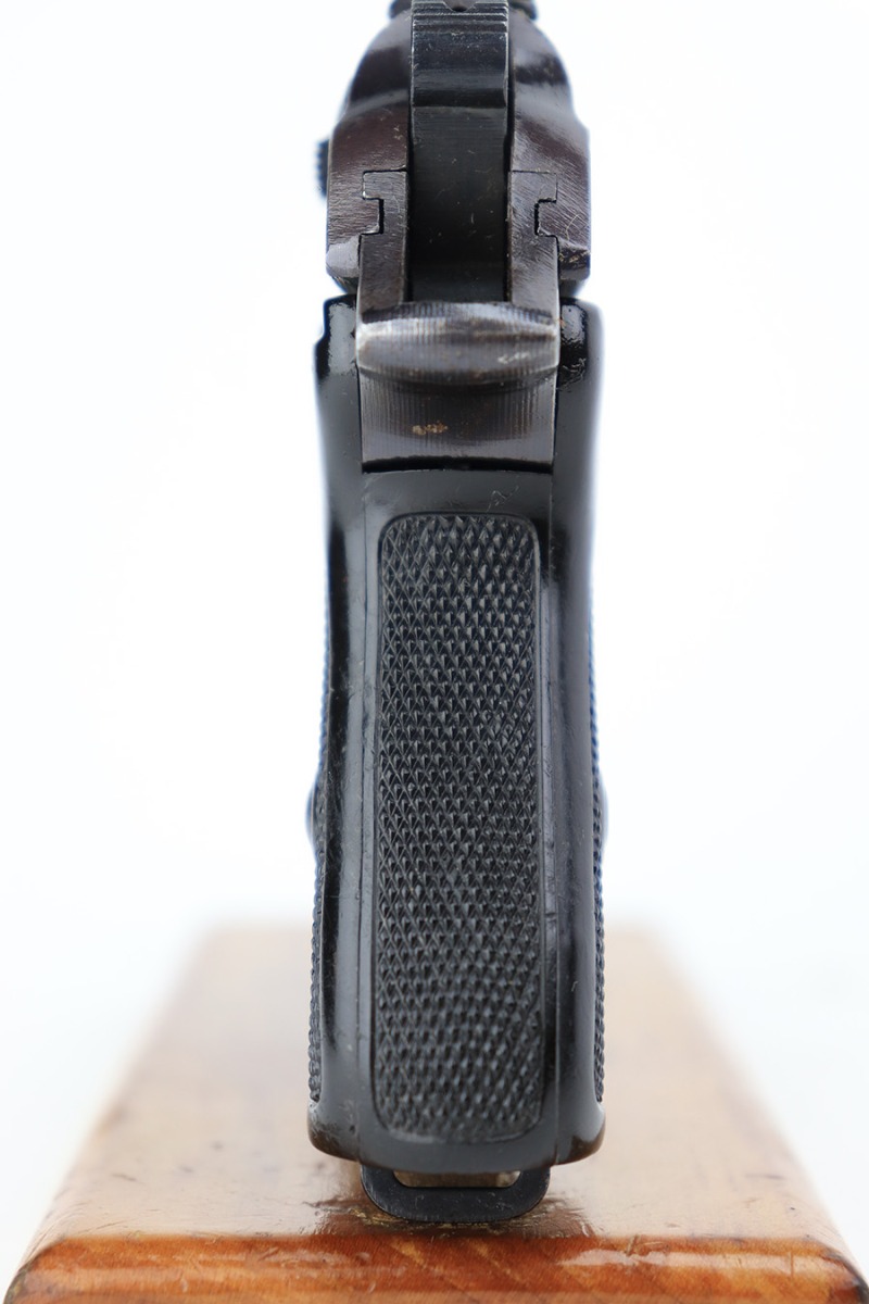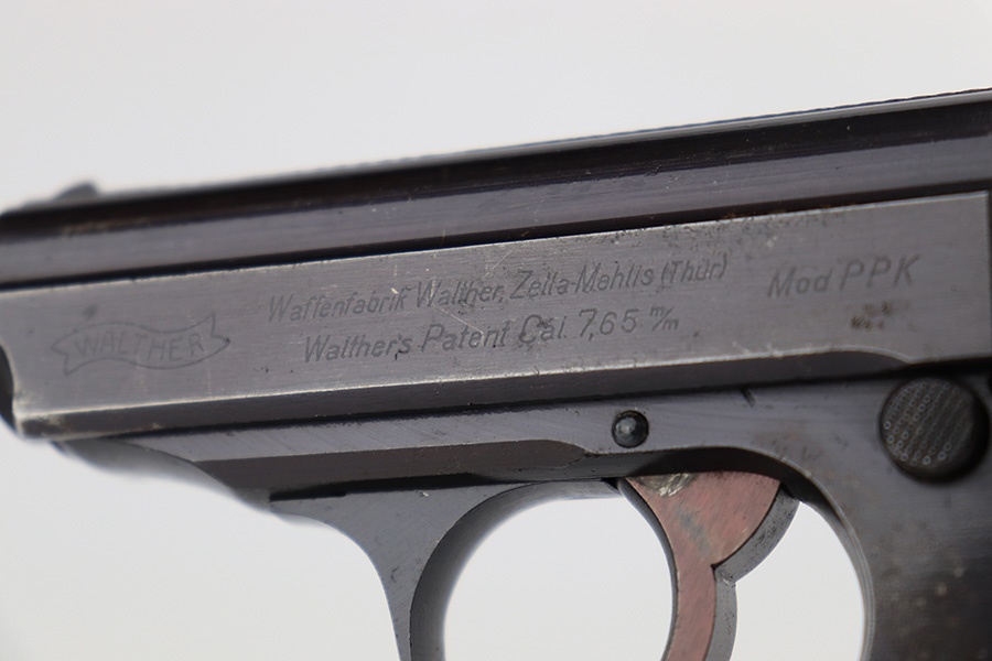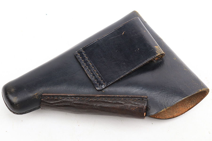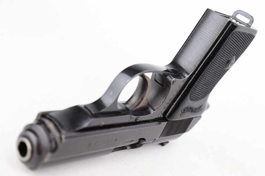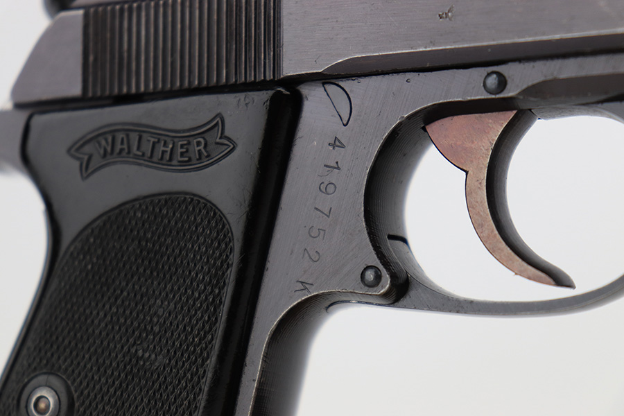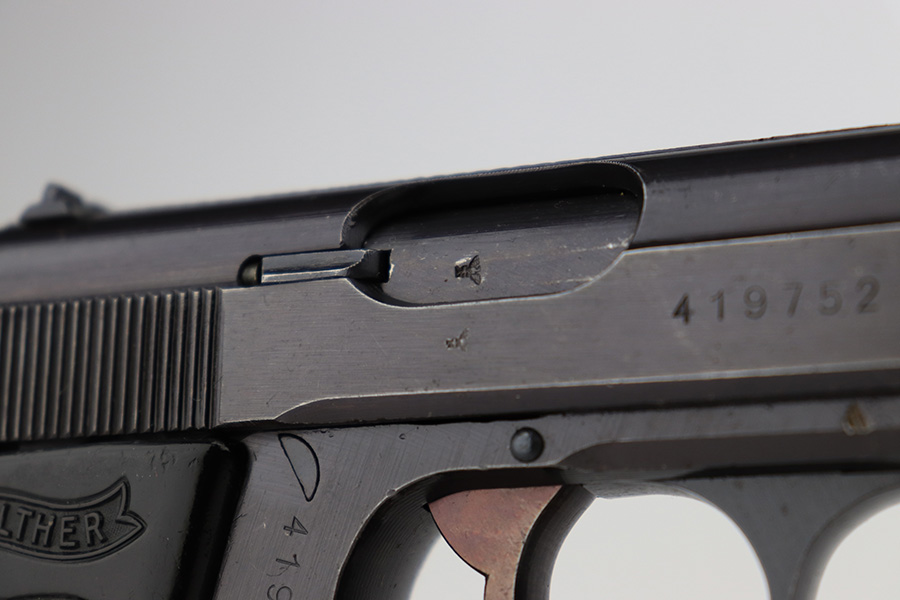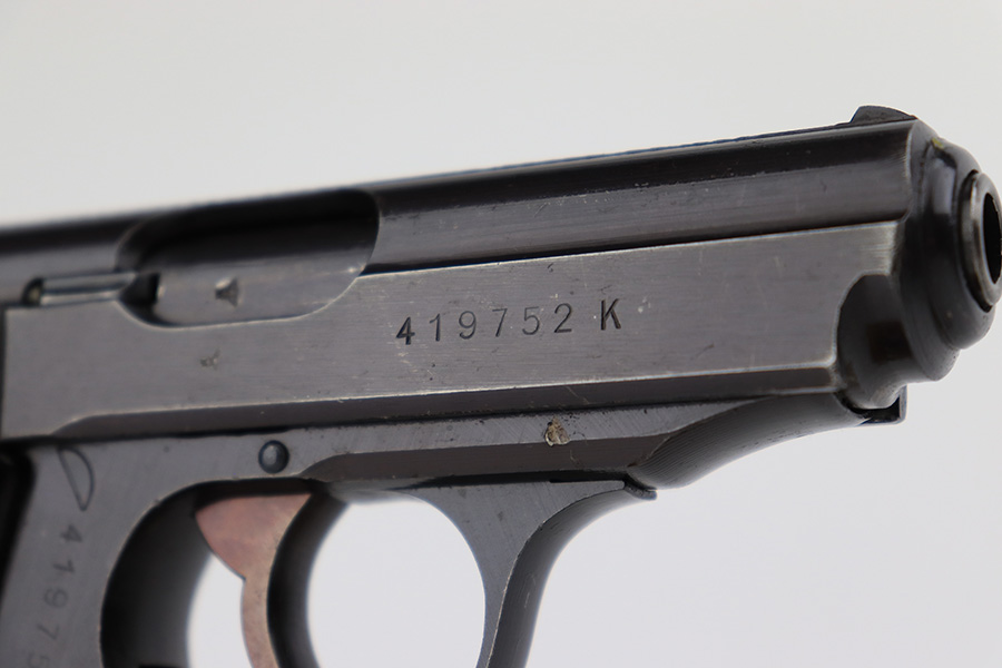 8/25/23 – This is a Walther PPK issued to the Nazi military around 1944. The gun is all matching and has the proper “Waffen 359” Nazi military acceptance proof. This particular gun is of the scarce 3rd variation – only 12,500 were made. This pistol is in excellent condition – retaining about 97% of its original finish. There is very minor muzzle and high edge wear. There are small spots of discoloration on the left side of the slide and frame. There is very minor wear on the front strap and one small ding on the right side of the frame. Excellent original black Walther grip – just a few handling marks. Comes with an excellent period-correct wartime magazine. The bore is excellent – shiny with good rifling. Also included with the listing is an excellent Akah holster, with minor cracking but sharp markings.