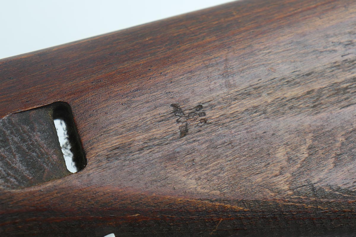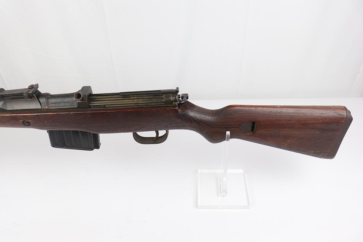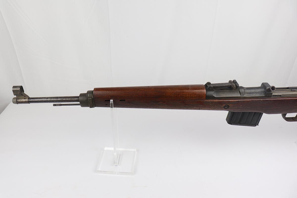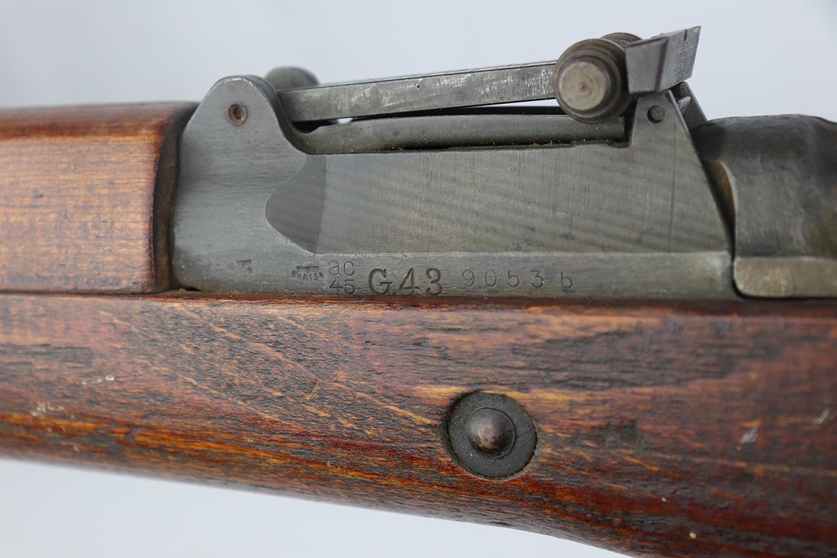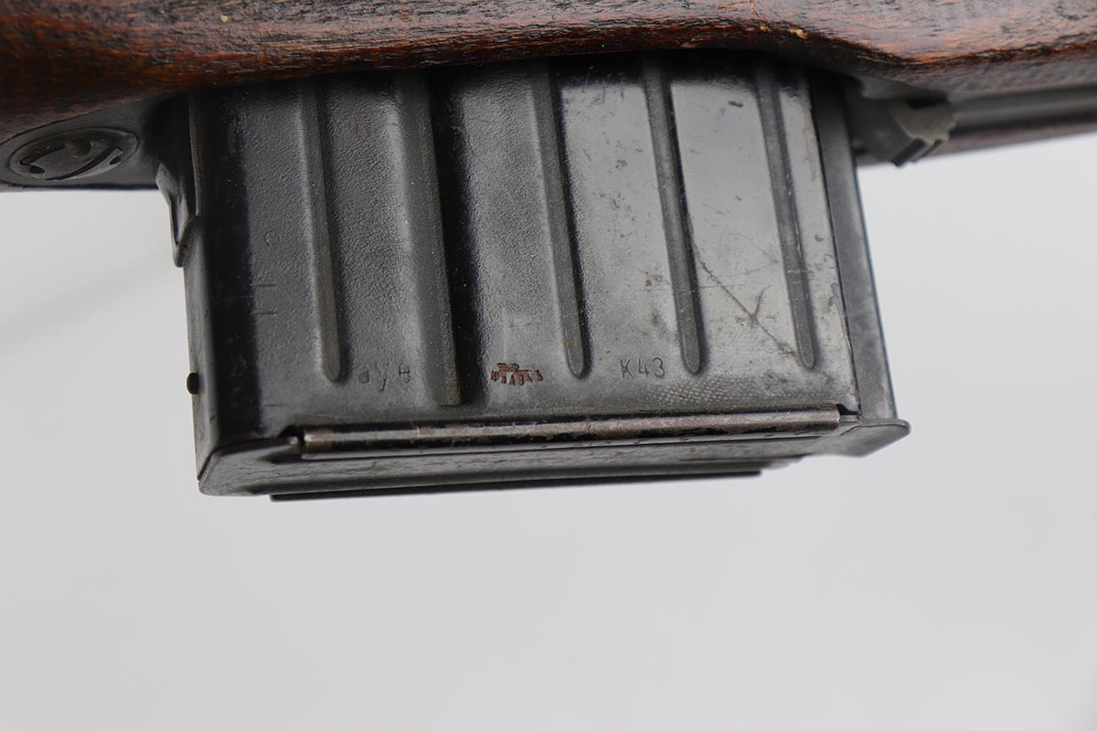 4/11/19 – This is a great example of an all matching and original Walther G43, made in 1945. This is a particularly interesting example as many parts feature a phosphate finish, some with that desirable greenish tinge to the color. There is minimal finish loss to the metal parts aside from the butt plate, but some oxidation and discoloration on the barrel and front sight. Excellent stock with multiple sharp waffenamts. Only very minor dings, no cracks or chips. Terrific bore. Magazine is ‘aye’ maker marked, with WaA843 proof. Original sight hood and cleaning rod. All matching numbers, and stock is properly unnumbered for an example this late.