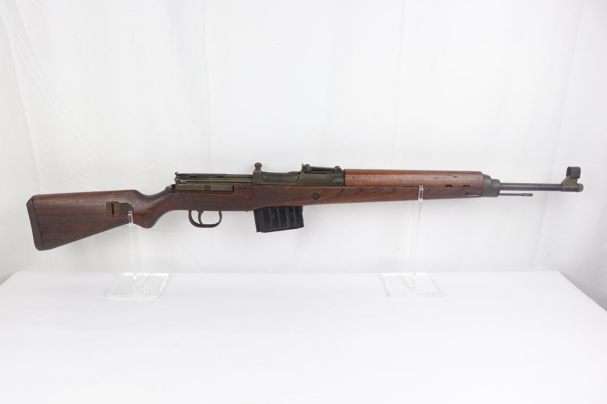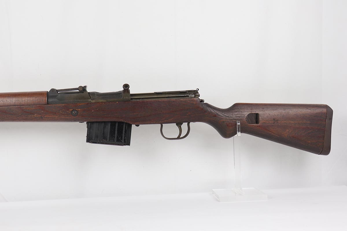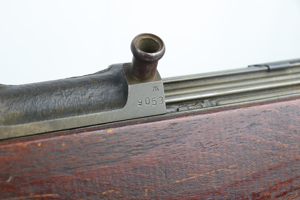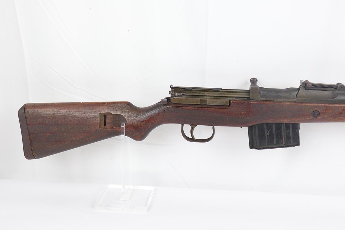 4/11/19 – This is a great example of an all matching and original Walther G43, made in 1945. This is a particularly interesting example as many parts feature a phosphate finish, some with that desirable greenish tinge to the color. There is minimal finish loss to the metal parts aside from the butt plate, but some oxidation and discoloration on the barrel and front sight. Excellent stock with multiple sharp waffenamts. Only very minor dings, no cracks or chips. Terrific bore. Magazine is ‘aye’ maker marked, with WaA843 proof. Original sight hood and cleaning rod. All matching numbers, and stock is properly unnumbered for an example this late.