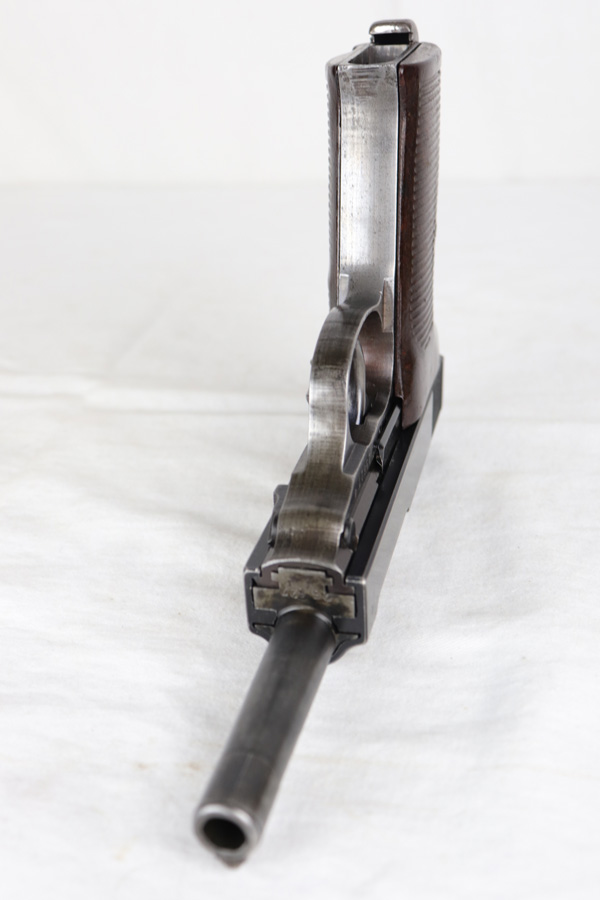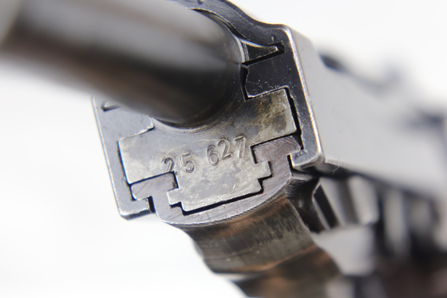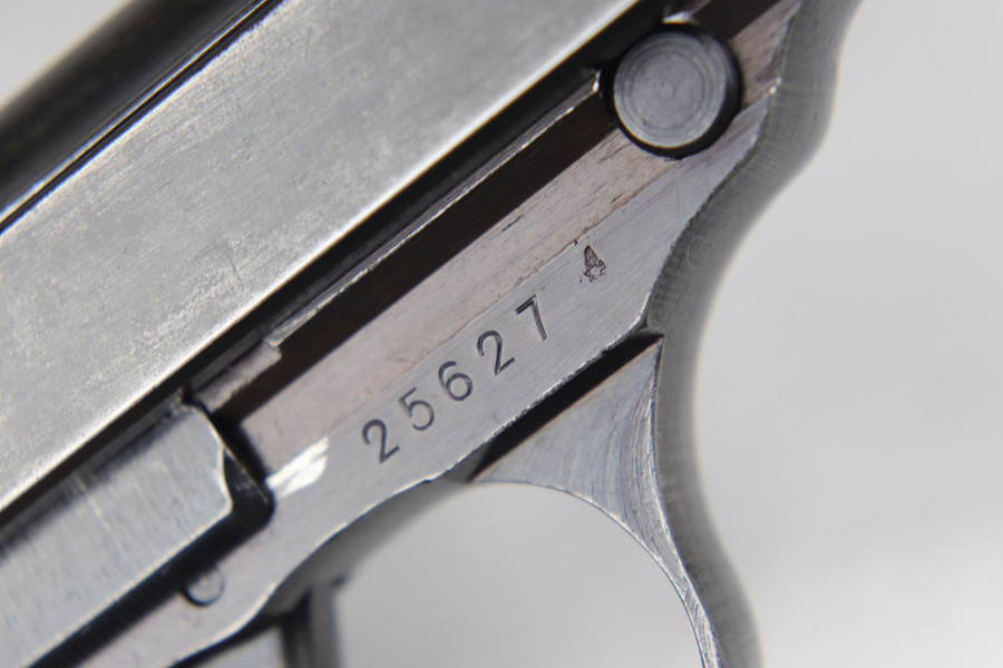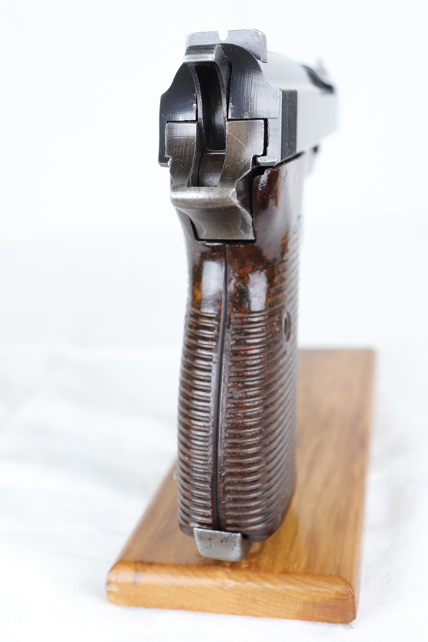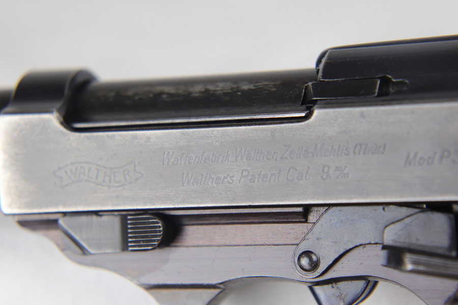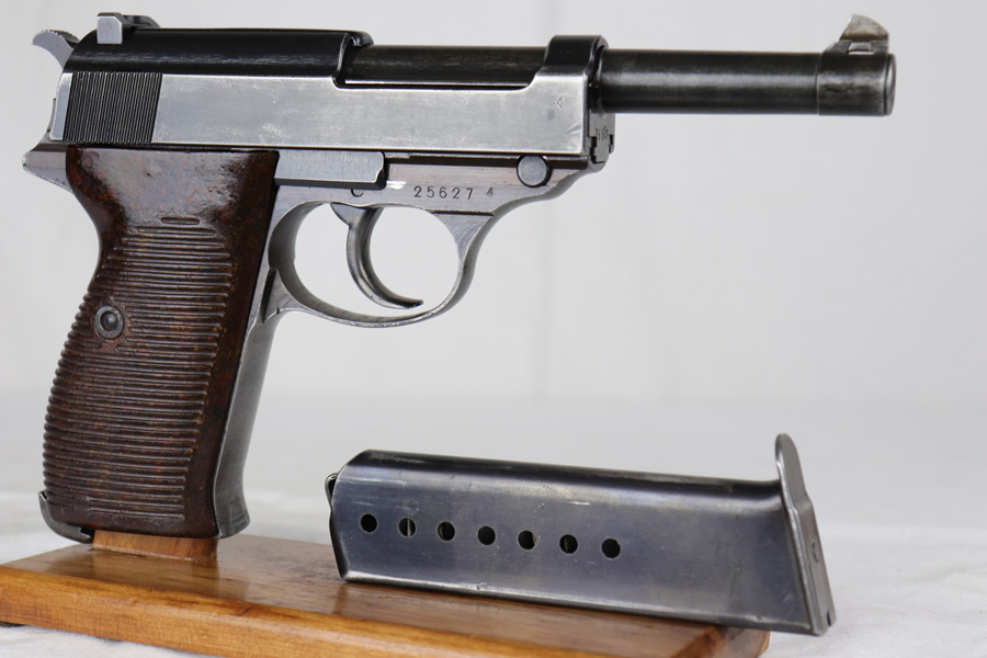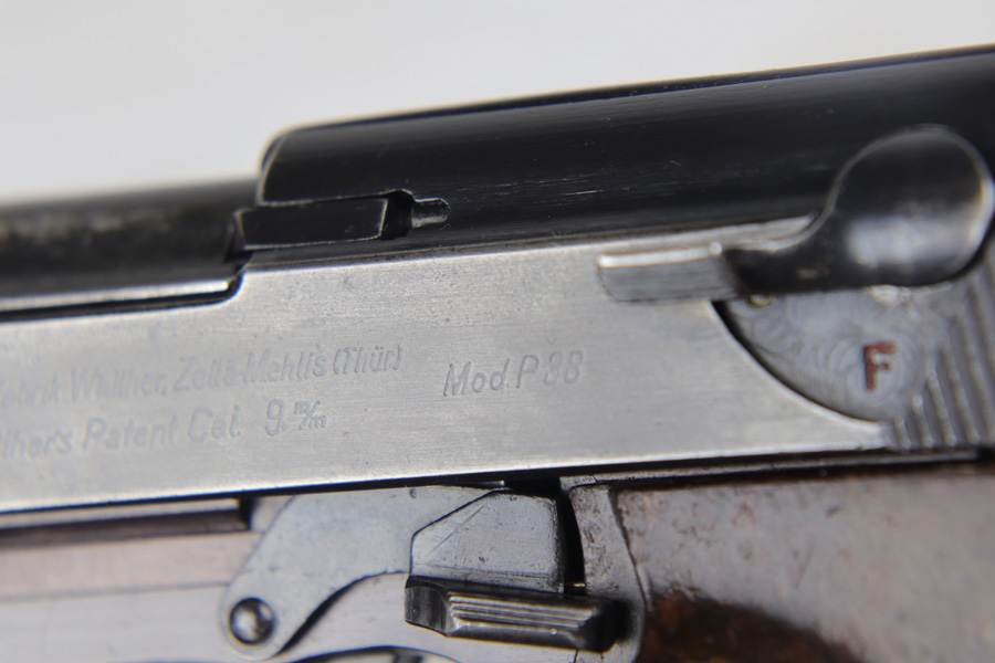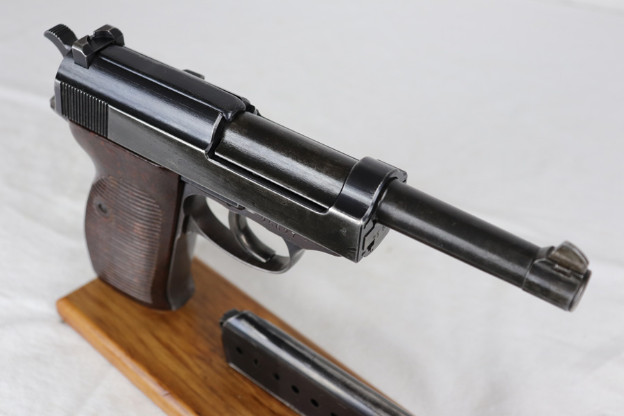 10/25/18 – This is an all matching and original commercial Walther Mod P.38. The original finish has thinned throughout and shows some patina on the slide. The front strap has a casting flaw, not terribly uncommon on WWII P.38s. Excellent grips and minty bore. Walther magazine.