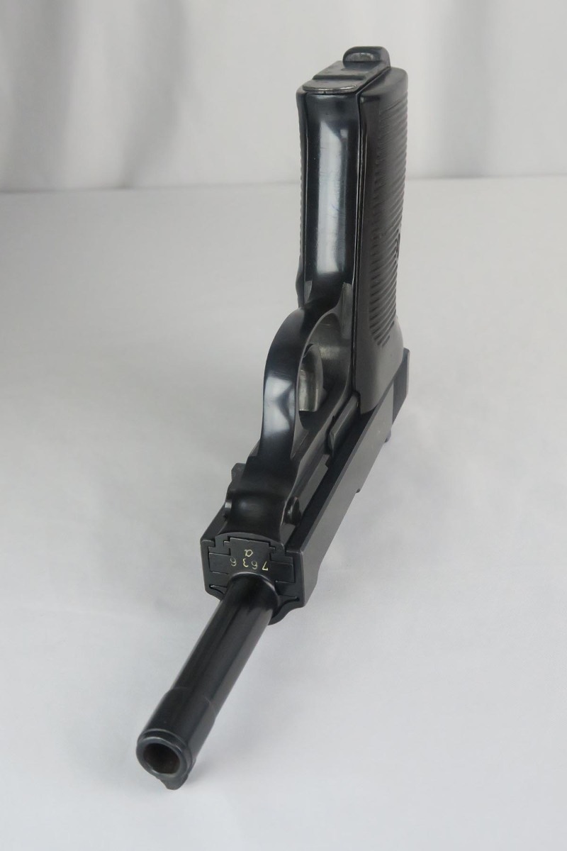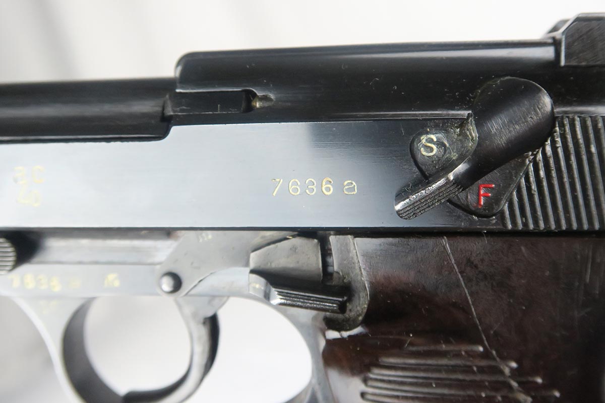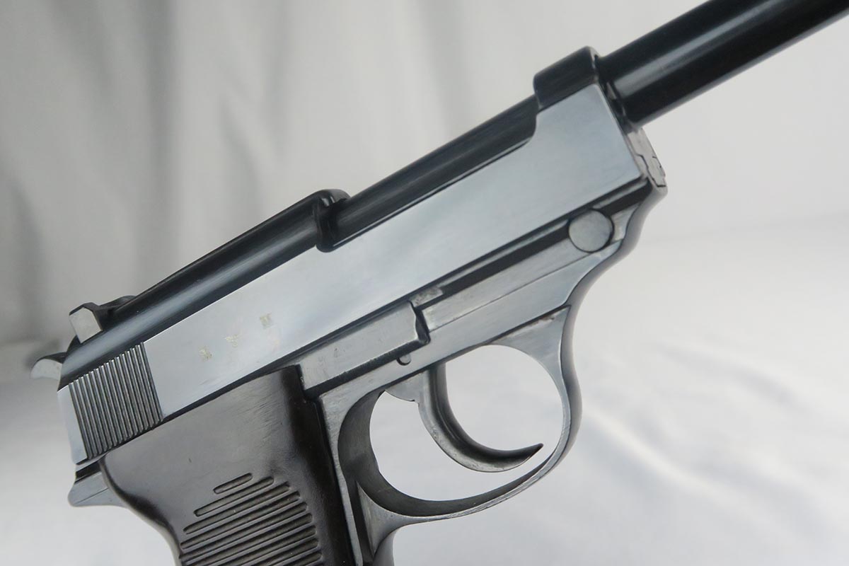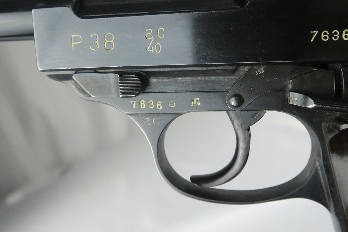 3/20/18 – This is a hard-to-find Walther P.38, marked ac 40 on the slide with ‘ac’ mark added.  There were only 5,700 of this variation produced, made in November of 1940 with the ’40’ added after the gun was blued.  This pistol is in the proper range for this variation, and they often are very worn as nearly all of them saw action.  This one was in a flood but the previous owner was able to have the finish restored professionally.  This pistol is all matching, including the grips but not the magazine.  The magazine is Walther made but not numbered.  The action on this one is very good, except the decocker doesn’t appear to work fully.  The bore has decent rifling but some pitting throughout the grooves.  The left grip panel has a scratch in it but it does not go through.