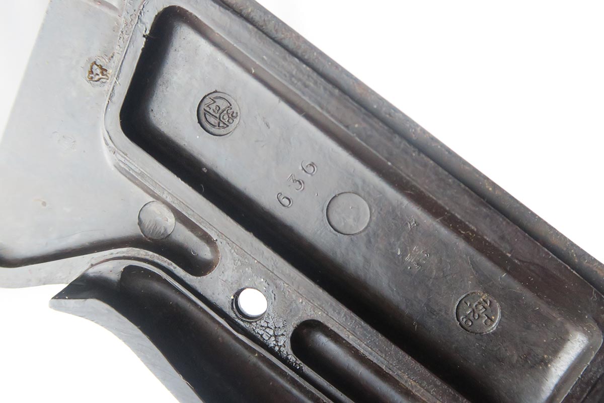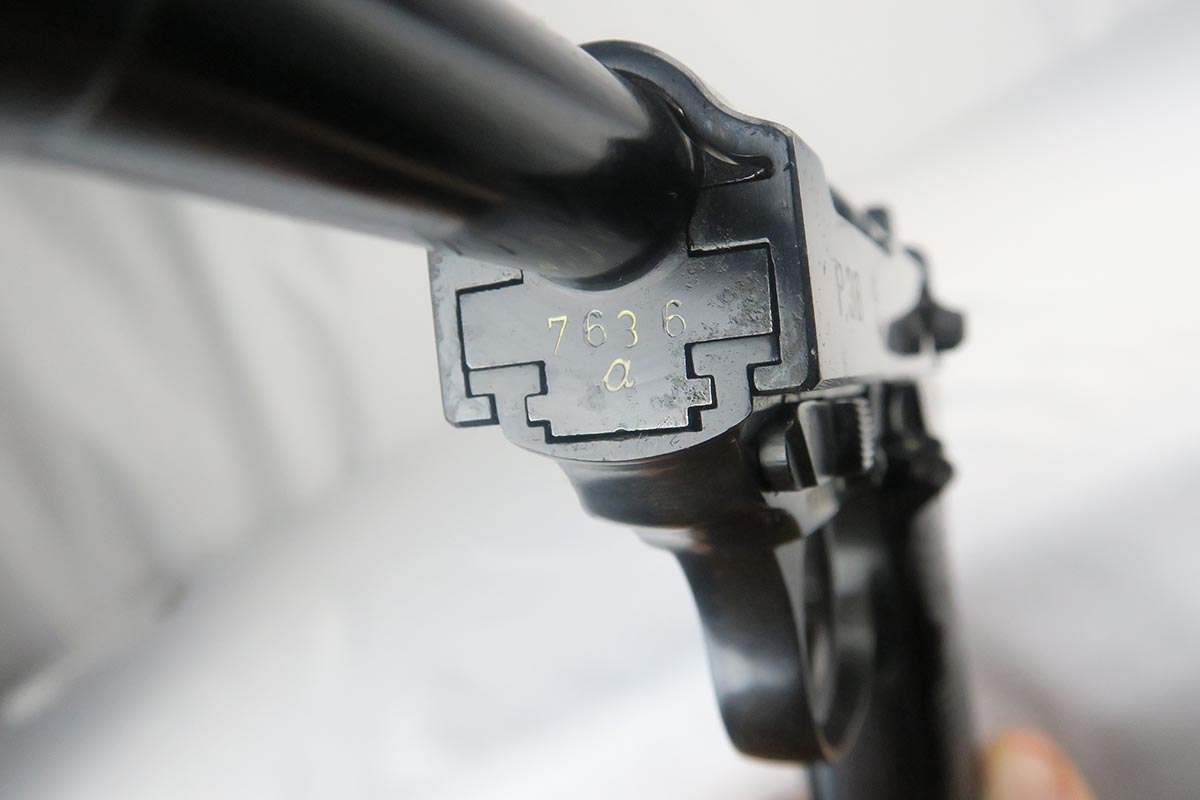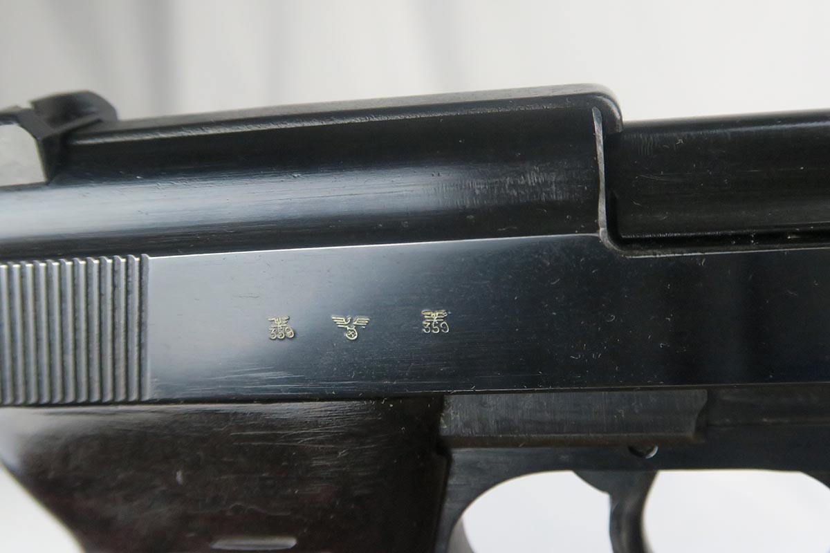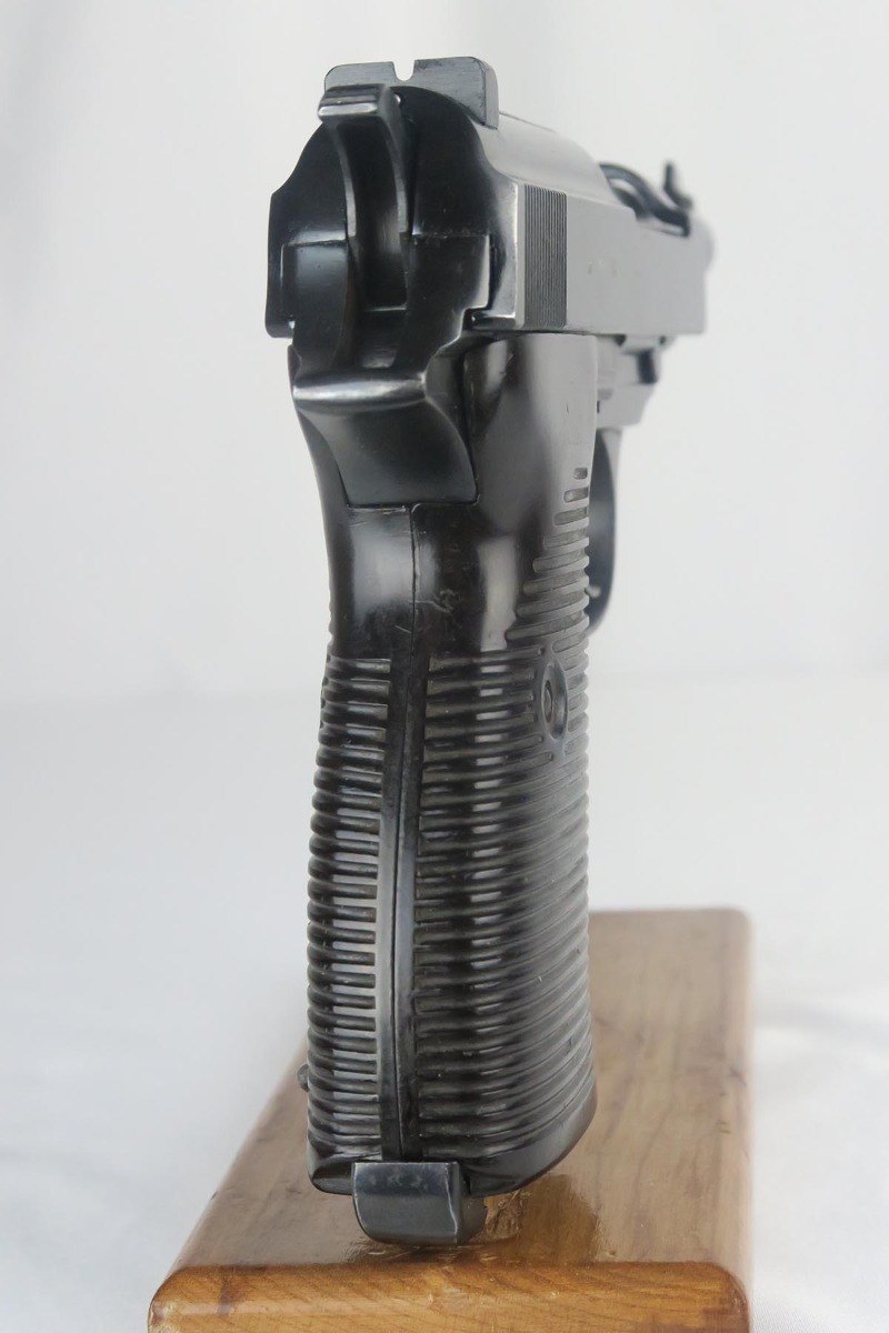 3/20/18 – This is a hard-to-find Walther P.38, marked ac 40 on the slide with ‘ac’ mark added.  There were only 5,700 of this variation produced, made in November of 1940 with the ’40’ added after the gun was blued.  This pistol is in the proper range for this variation, and they often are very worn as nearly all of them saw action.  This one was in a flood but the previous owner was able to have the finish restored professionally.  This pistol is all matching, including the grips but not the magazine.  The magazine is Walther made but not numbered.  The action on this one is very good, except the decocker doesn’t appear to work fully.  The bore has decent rifling but some pitting throughout the grooves.  The left grip panel has a scratch in it but it does not go through.