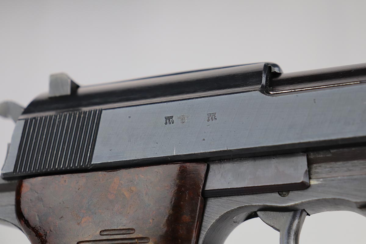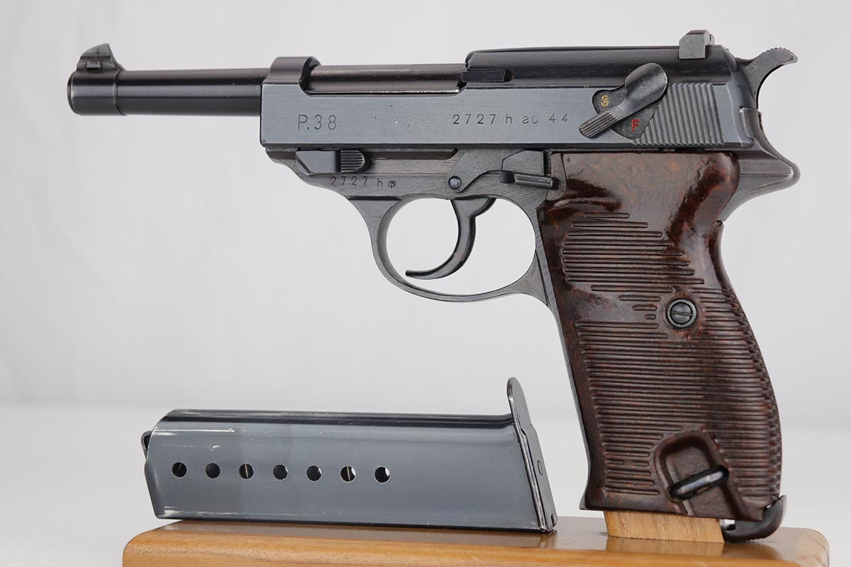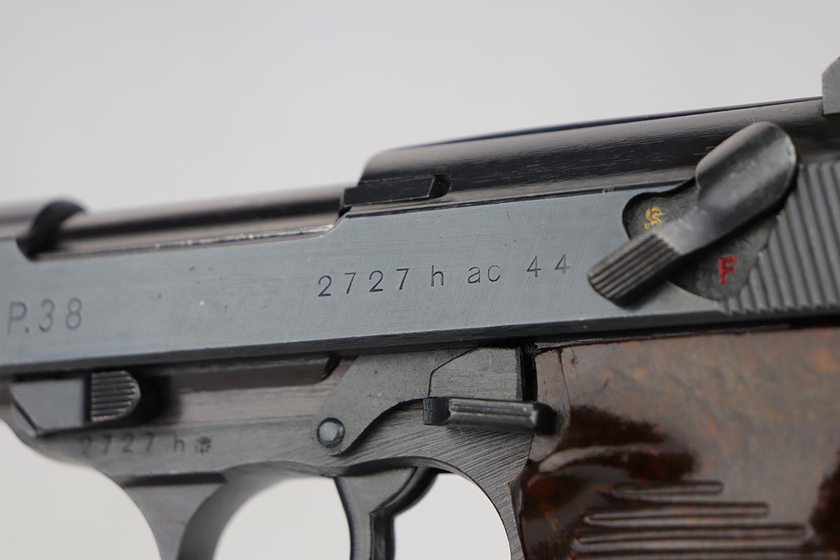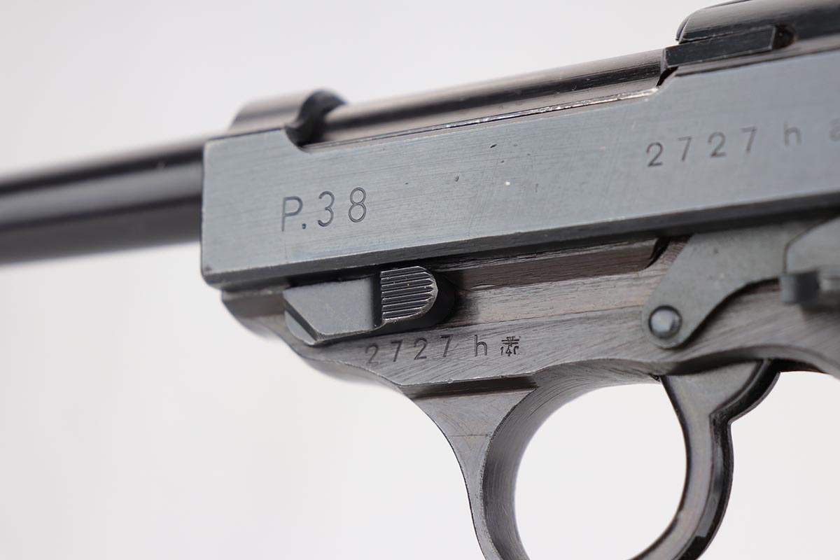 8/22/19 – This is an excellent example of a scarce Walther P.38, with frame produced at the FN factory as evidenced by the E/140 proof. Krutzek’s P.38 book estimates that only 7,300 frames were produced and used by FN on World War II original pistols. Made in August of 1944, the pistol is all matching and original with 96-97% blue, showing only minor thinning of the front strap, and some wear along the top of barrel. Mint bore and grips. Walther magazine. Good mechanics, including de-cocker.