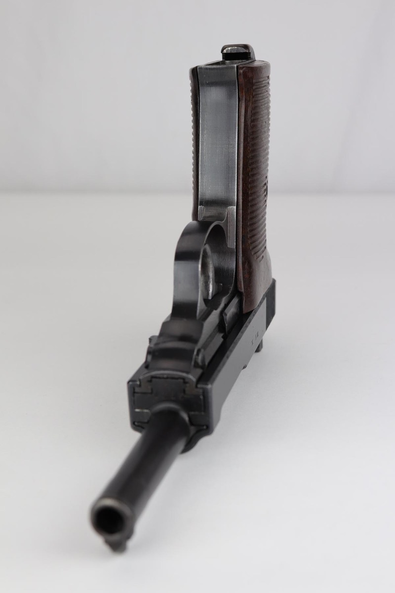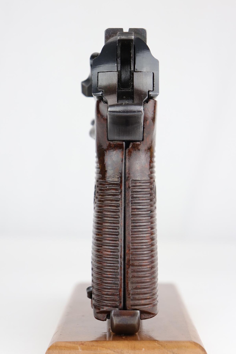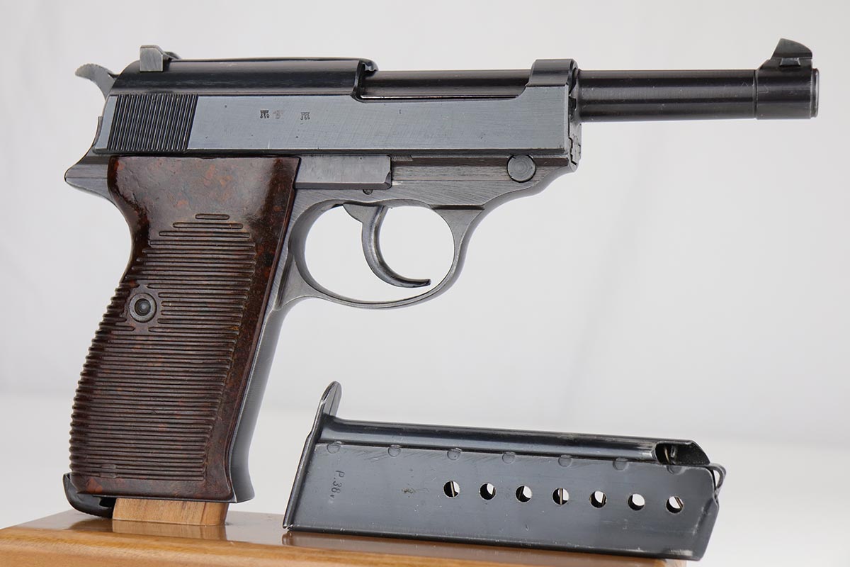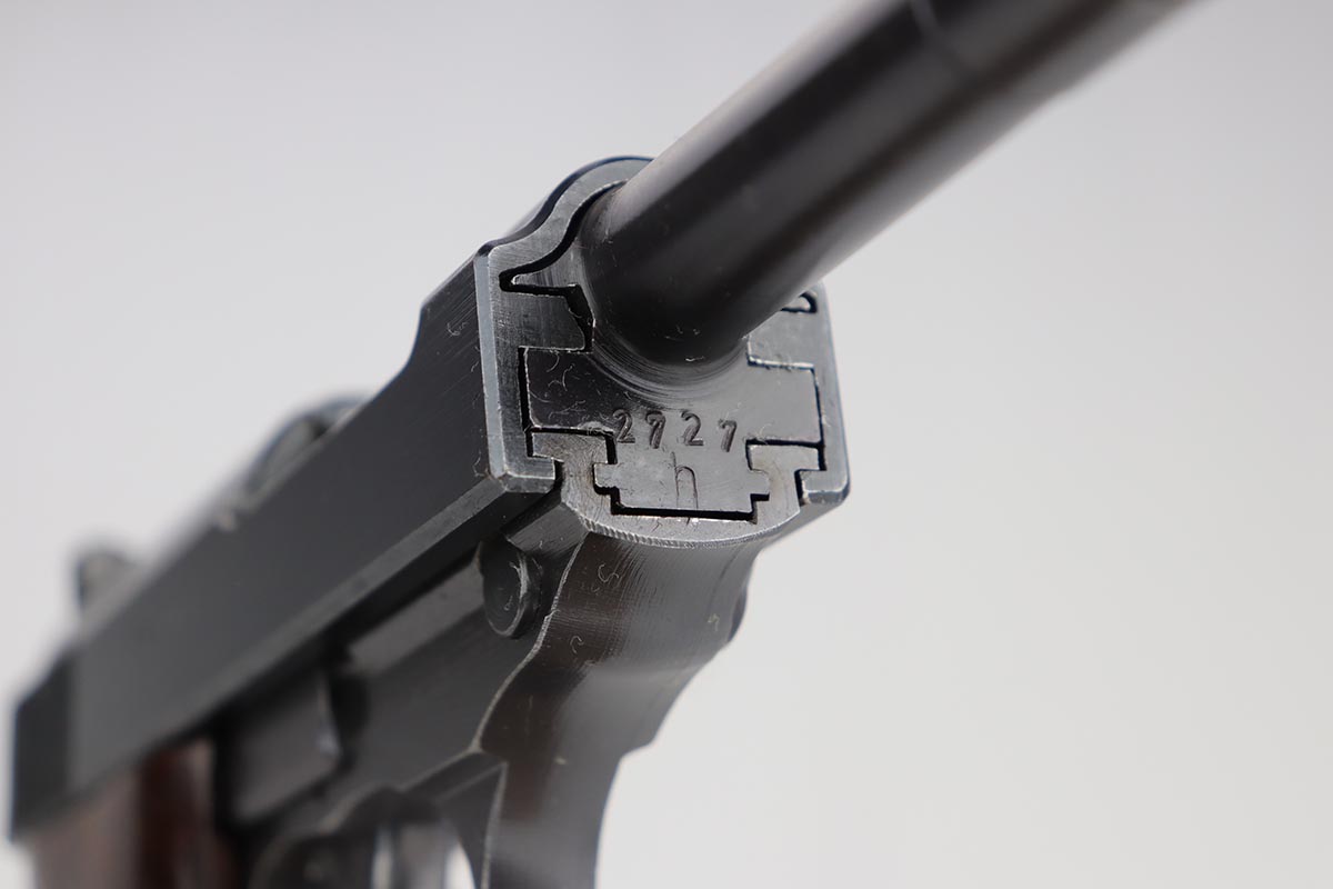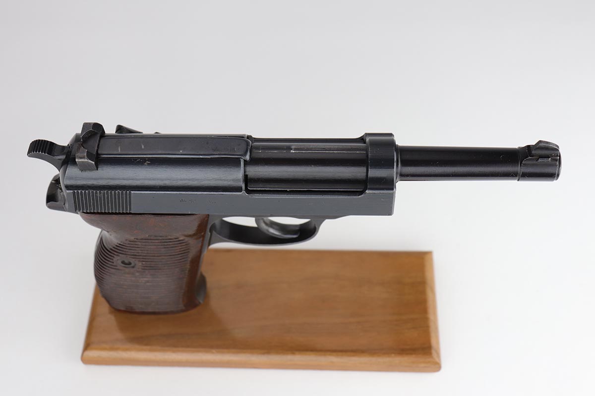 8/22/19 – This is an excellent example of a scarce Walther P.38, with frame produced at the FN factory as evidenced by the E/140 proof. Krutzek’s P.38 book estimates that only 7,300 frames were produced and used by FN on World War II original pistols. Made in August of 1944, the pistol is all matching and original with 96-97% blue, showing only minor thinning of the front strap, and some wear along the top of barrel. Mint bore and grips. Walther magazine. Good mechanics, including de-cocker.
