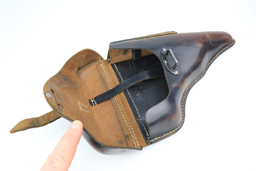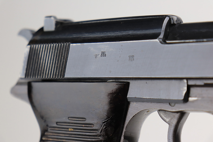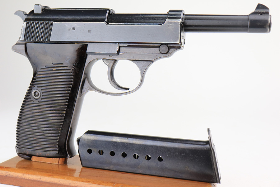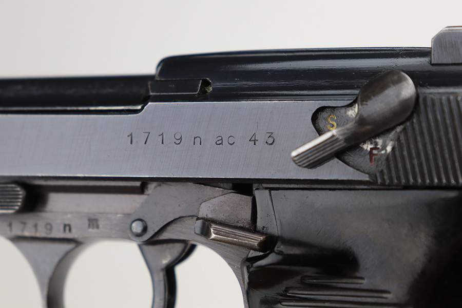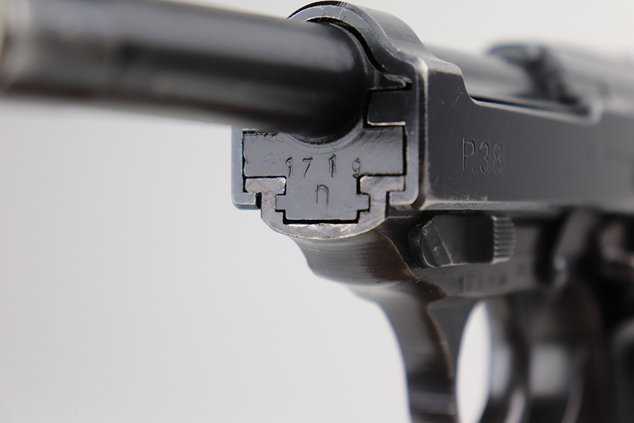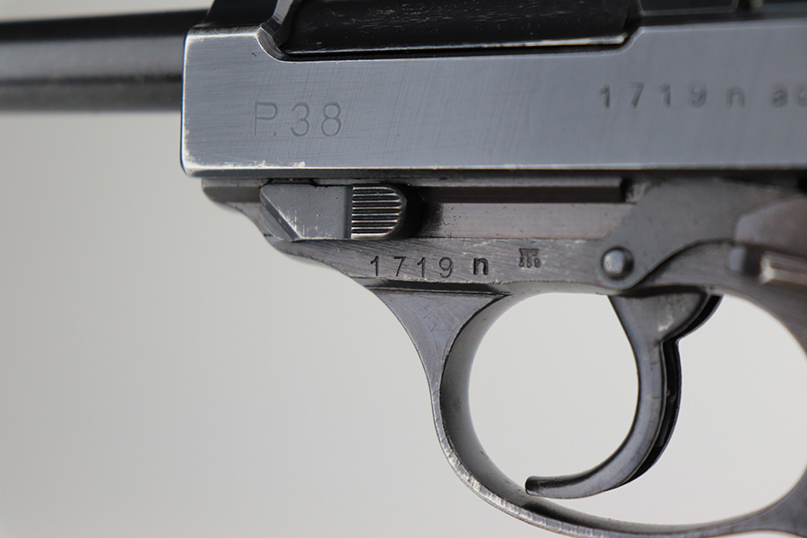 3/18/22 – This is a matching and original Walther P.38 rig from 1943. It’s a scarce variation with ‘ac 43’ marking in a single line on the slide, only found in the ‘n’ and ‘m’ serial blocks, one of about 18,000 made. The gun has a very nice profile with minor holster wear on the high edges, but most of the finish loss is on the front strap. Excellent grips with no notable defects. Bore has strong rifling but some frost throughout. The rig includes a total of two Walther magazines. It’s completed by a nice brown hardshell holster that was also made in 1943, and is ‘hft’ maker-marked.