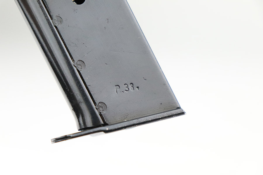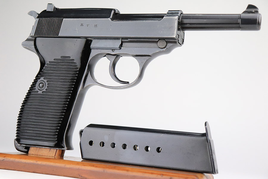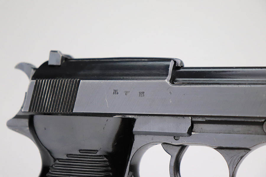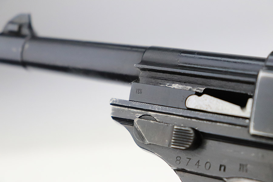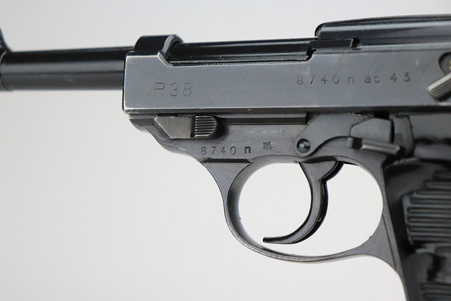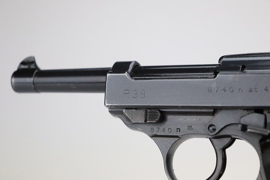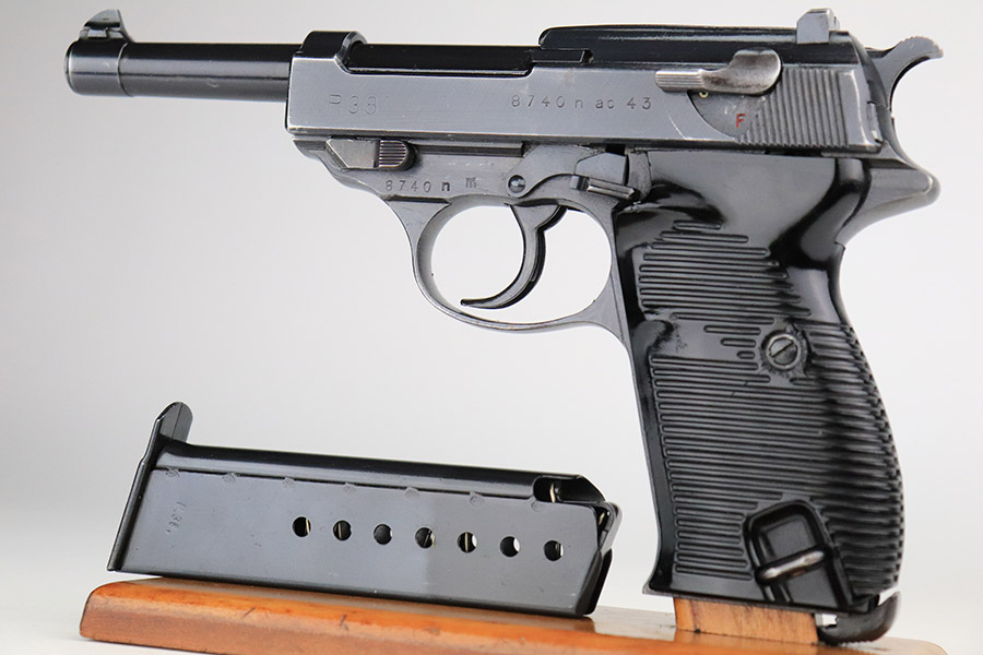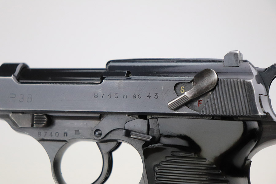 11/15/22 – This is an excellent example of a matching and original Walther P.38 from December of 1943. It’s a scarce variation with ‘ac 43’ marking in a single line on the slide, only found in the ‘n’ and ‘m’ serial blocks, one of about 18,000 made. It has about 98% of the original blue remaining, with minor muzzle and edge wear on the front of the slide. Strong bore with a little frost in the grooves. Excellent black grips with a couple of surface scratches on each side. Good mechanics, including de-cocker. Walther magazine.