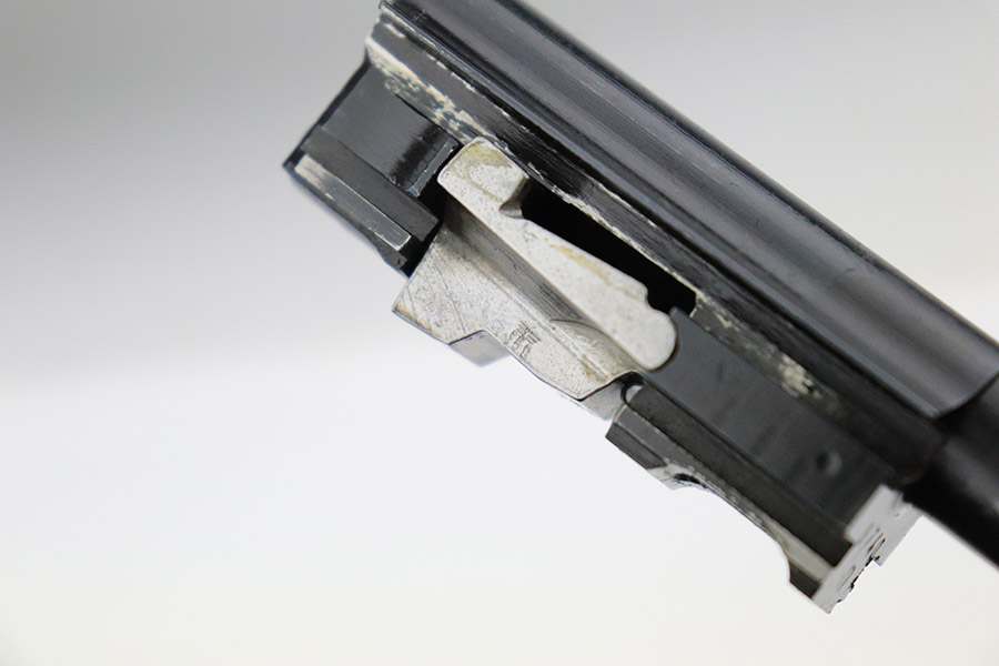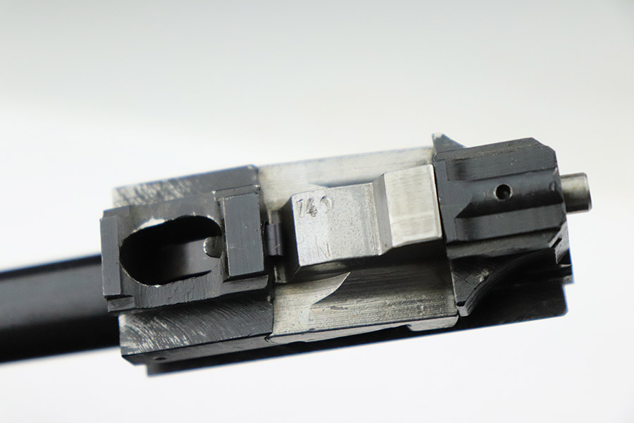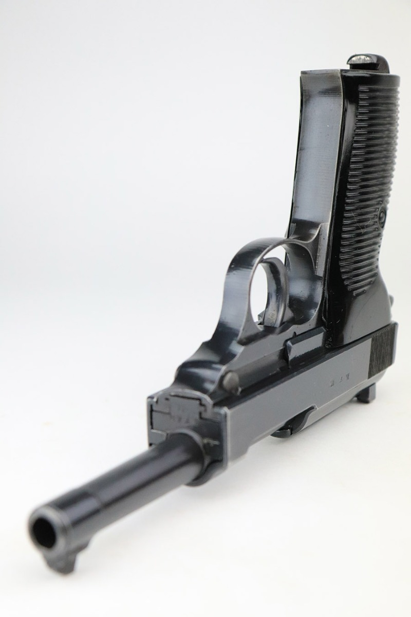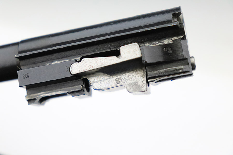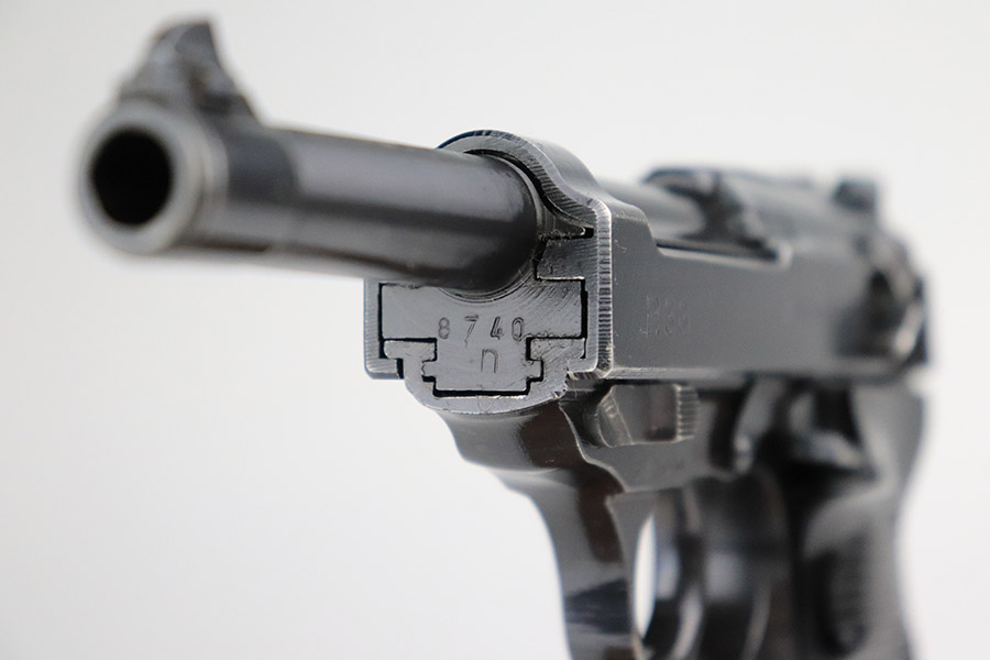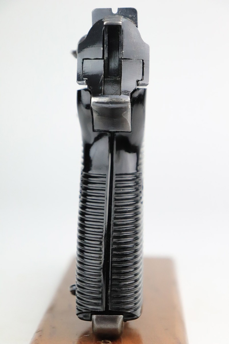 11/15/22 – This is an excellent example of a matching and original Walther P.38 from December of 1943. It’s a scarce variation with ‘ac 43’ marking in a single line on the slide, only found in the ‘n’ and ‘m’ serial blocks, one of about 18,000 made. It has about 98% of the original blue remaining, with minor muzzle and edge wear on the front of the slide. Strong bore with a little frost in the grooves. Excellent black grips with a couple of surface scratches on each side. Good mechanics, including de-cocker. Walther magazine.