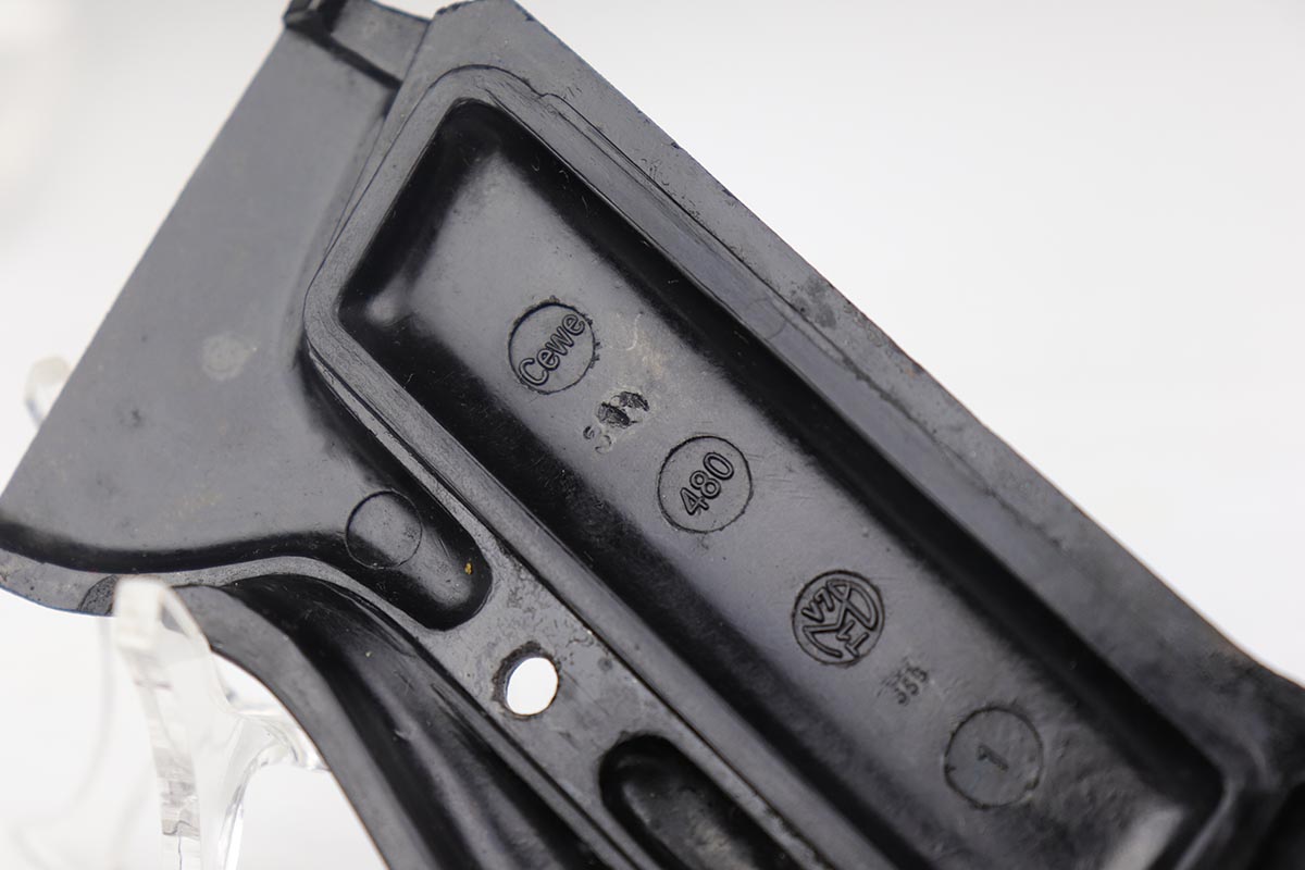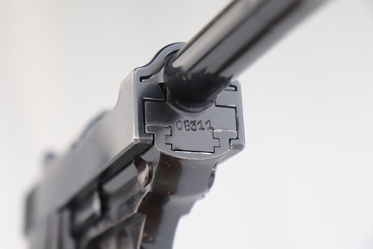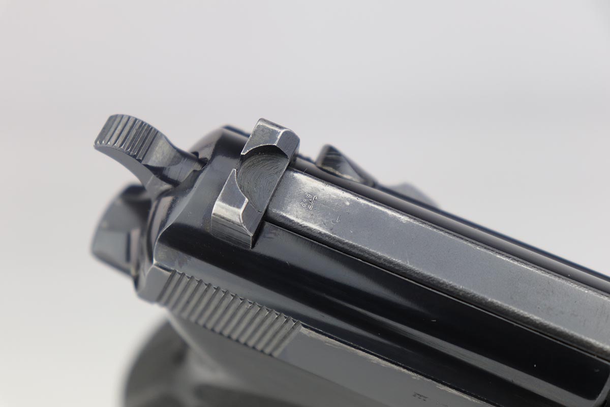 12/17/19 – This is an original 3rd variation zero series P.38 made in 1940, which was the first run of military P.38s. Rarely seen in such nice condition as these were used throughout the war – many sent to the Russian front. This pistol is all original and all numbered parts are matching , with the exception of the near matching magazine. It has that beautiful high polish finish only seen on these early guns. The magazine is correct, and close to matching at # 08018 but not serial numbered matching to the pistol. The magazine correctly has two proof stamps on the base. The pistol is in about 96% – 97% original condition finish with some edge wear on the slide and muzzle, along with a few light spots of thinning on the front strap. It has the proper eagle N proofs on the slide, frame, barrel and locking block. Each also has matching numbers. The grips are the correct early variation, and matching numbered to the pistol. When we purchased the gun, we believed the grip numbering to be original, but a couple forum numbers pointed out that the grips were likely renumbered. The ‘3’ appears original but the ’11’ look added or modified. Overall a very nice gun with beautiful high polish finish. Strong, shiny bore with minor frost.