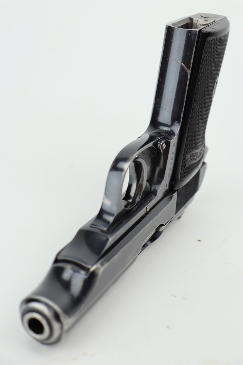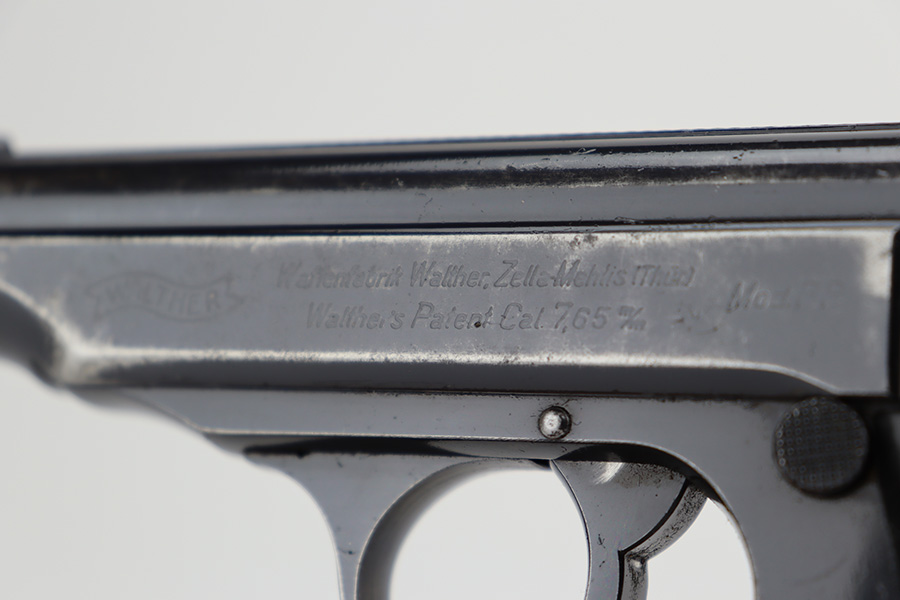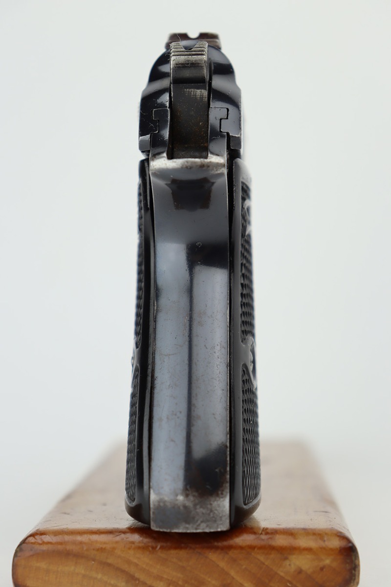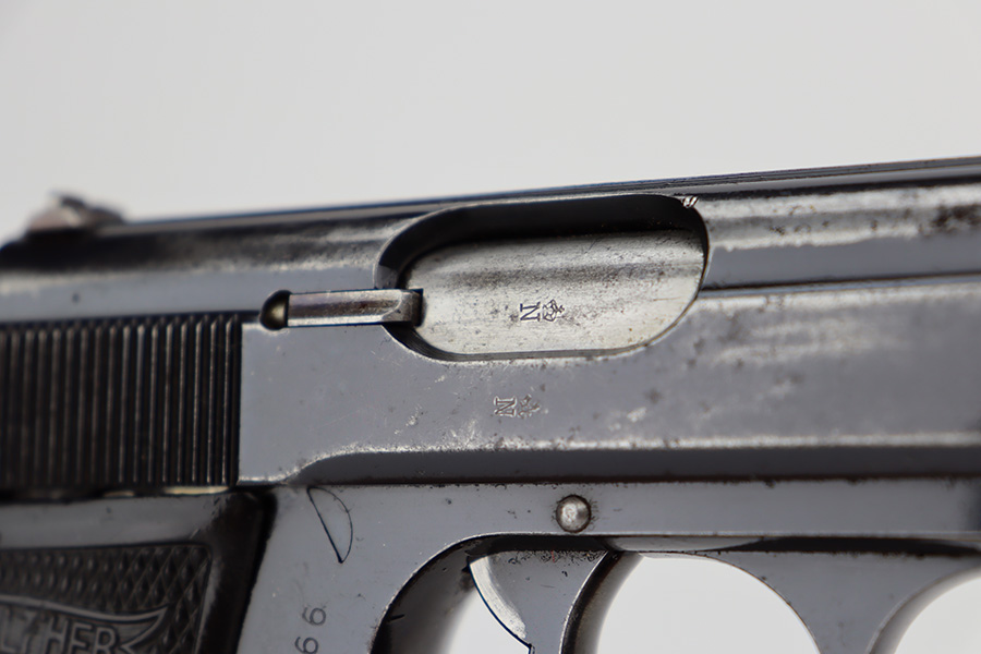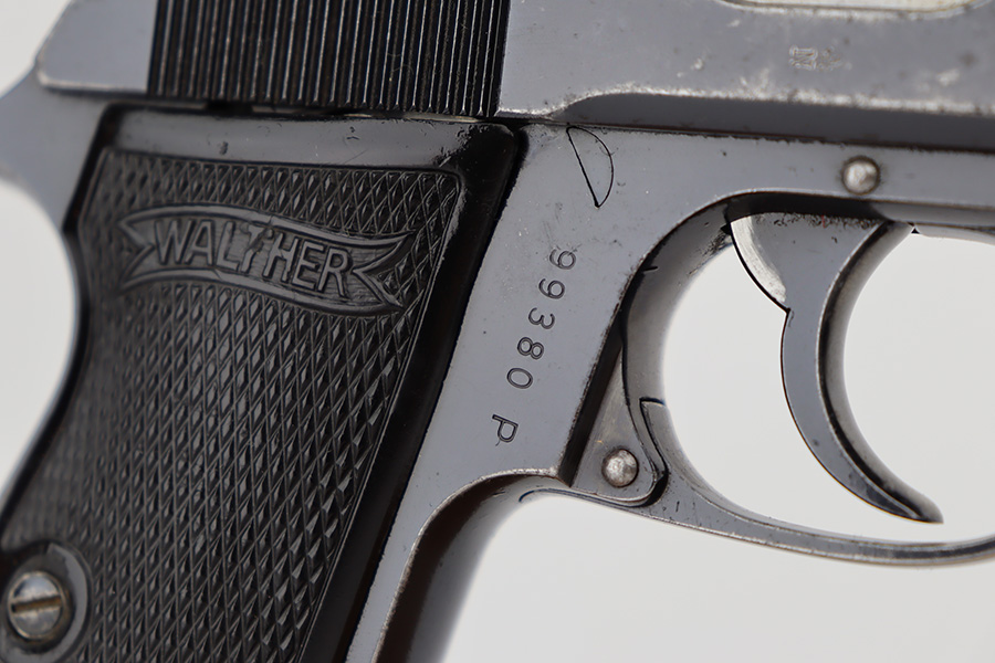 6/21/23 – This is a nice example of a Walther PP sold in the commercial market in 1938. It is all matching and has the proper “Crown N” proofs. This one is scarce because it has a 5-digit serial number. There are only about 20 known wartime PPs with 5 digit serial numbers. The known serial number range is 98895p through 99997p. There are estimated only 1k pistols made with a 5 digit serial number during WW2. This one has retained roughly 80% of its original bluing. There are some spots of wear on the grip straps, but the majority of the wear is along both sides of the slide, concentrated mostly on the high edges. Fitted with period-correct grips – some light cracking along the left edge of the left panel. Comes with a proper Walther banner-only magazine. Mint bore.