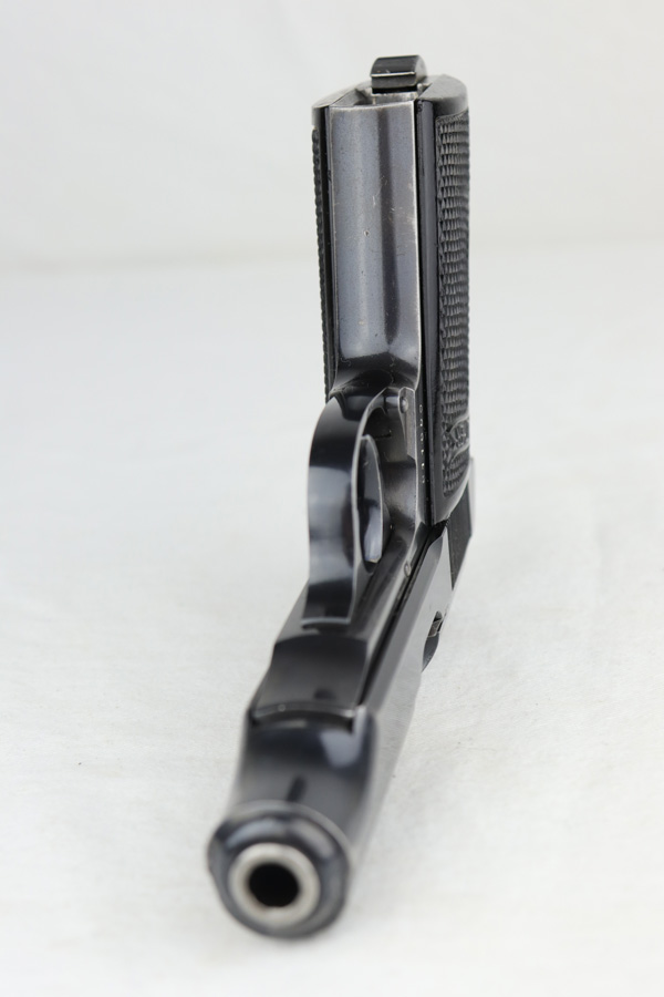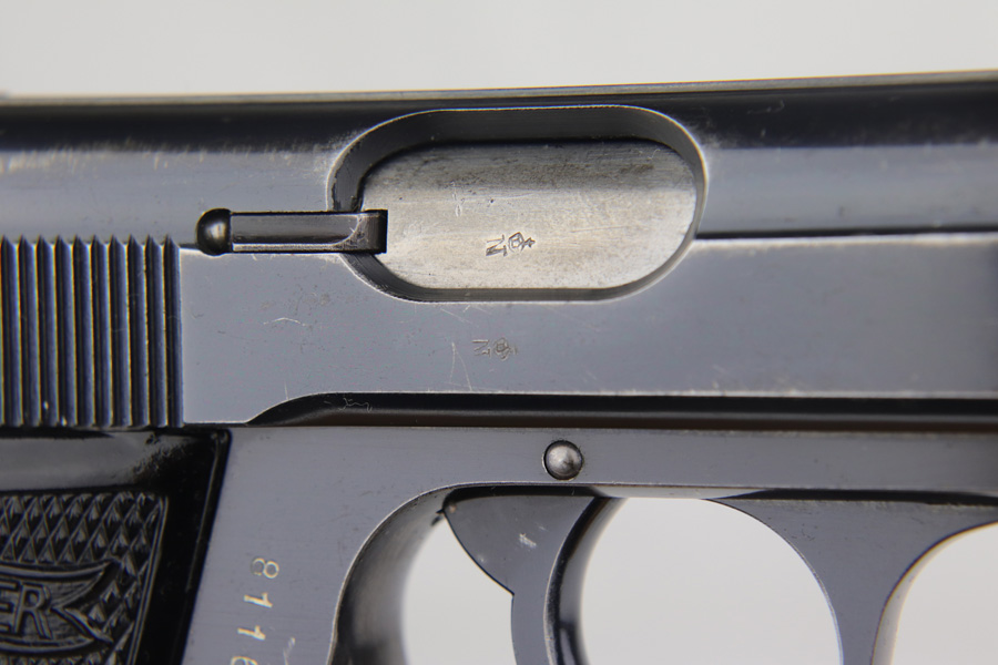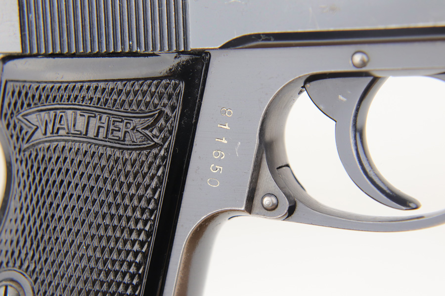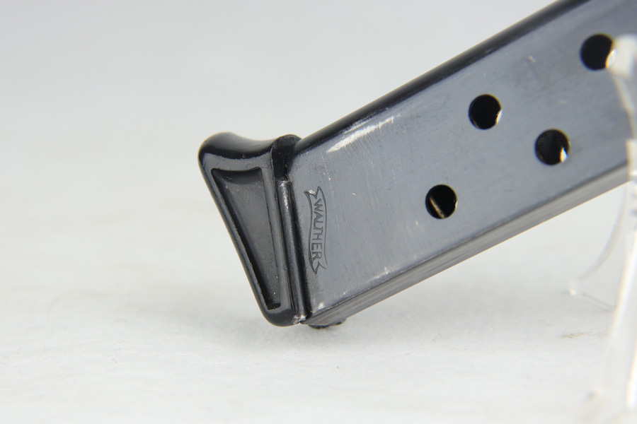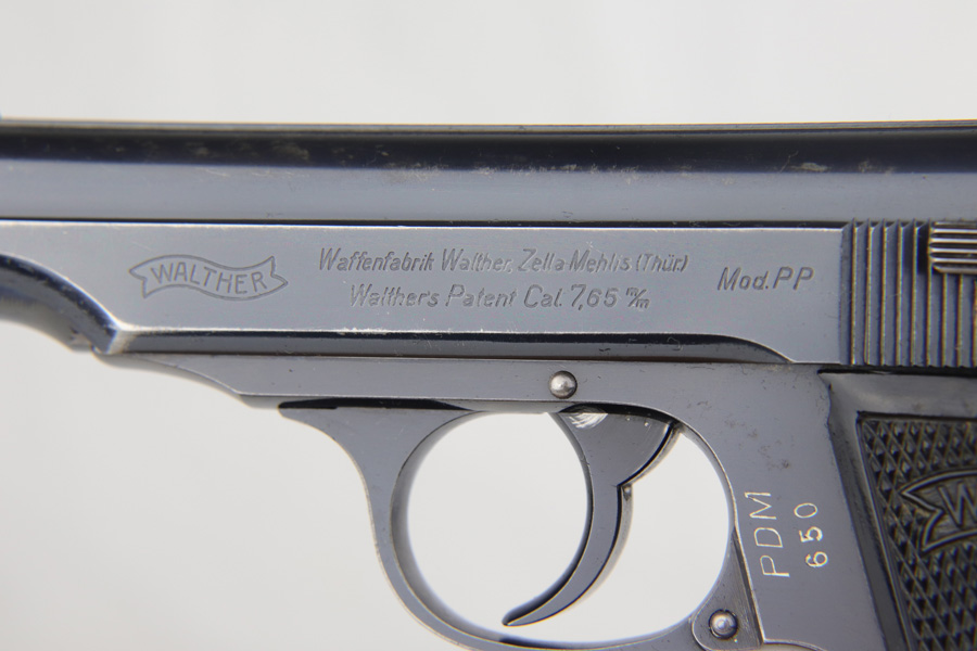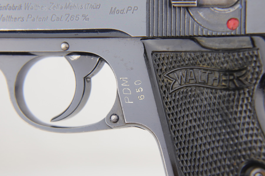1/23/19 – This is a rare PDM Walther PP, manufactured around 1935. The pistol is all correct and original, and the bluing rates at about 80% with the majority of finish loss found on the straps, but some muzzle and edge wear on the slide In 1935, Himmler ordered about 1800 PDM marked PP’s as head of all German Internal Security. PDM stands for Police Department of Munich, and the order was unique for the following reasons. These pistols came with a bottom release magazine, while all other 7.65mm PP’s had a push button mag release. The proper PDM magazine will have no notch for the push button release, which the magazine in this listing shows. These pistols also have a strengthened ‘fluted’ barrel, visible on the muzzle end of the barrel, which a standard PP slide would not fit. This pistol falls in the correct serial range. Excellent bore.